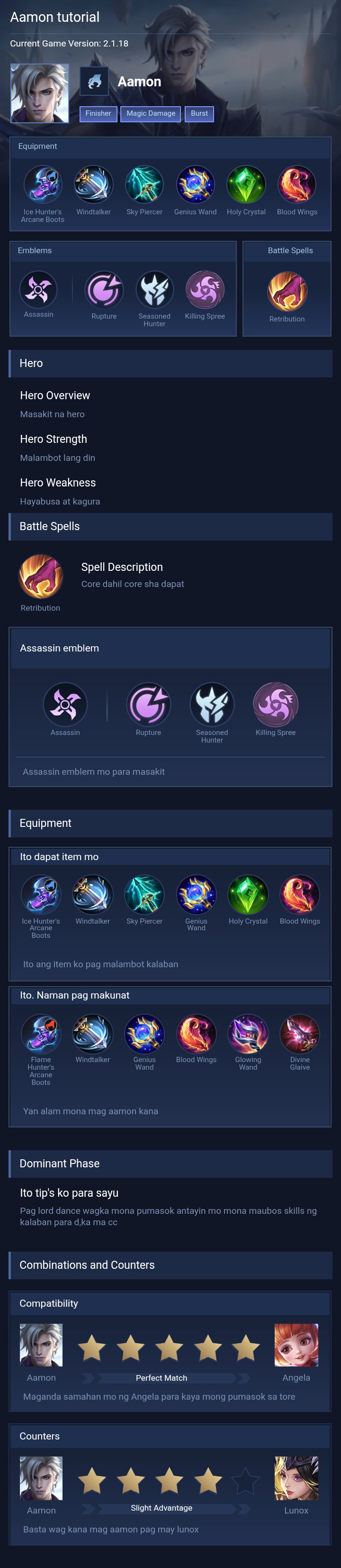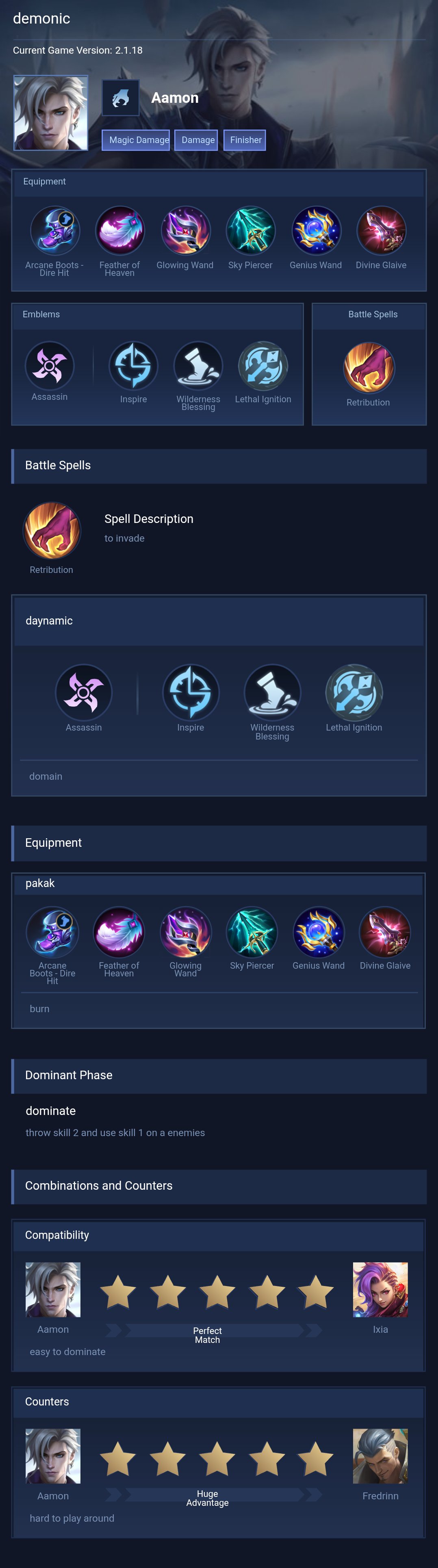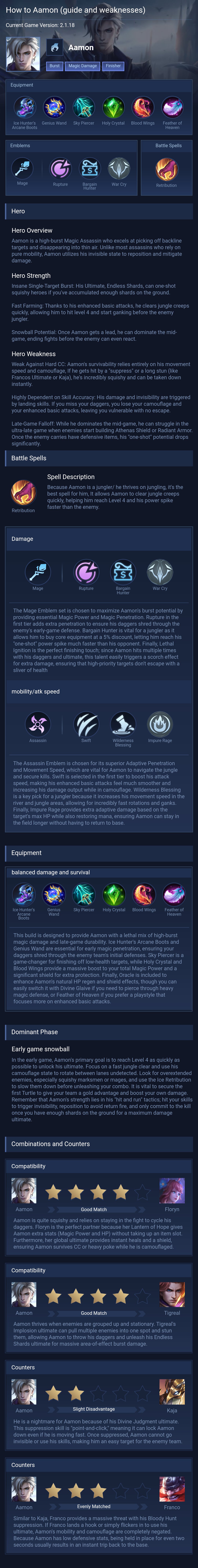 balanced damage and survival. This build is designed to provide Aamon with a lethal mix of high-burst magic damage and late-game durability. Ice Hunter's Arcane Boots and Genius Wand are essential for early magic penetration, ensuring your daggers shred through the enemy team's initial defenses. Sky Piercer is a game-changer for finishing off low-health targets, while Holy Crystal and Blood Wings provide a massive boost to your total Magic Power and a significant shield for extra protection. Finally, Oracle is included to enhance Aamon's natural HP regen and shield effects, though you can easily switch it with Divine Glaive if you need to pierce through heavy magic defense, or Feather of Heaven if you prefer a playstyle that focuses more on enhanced basic attacks.