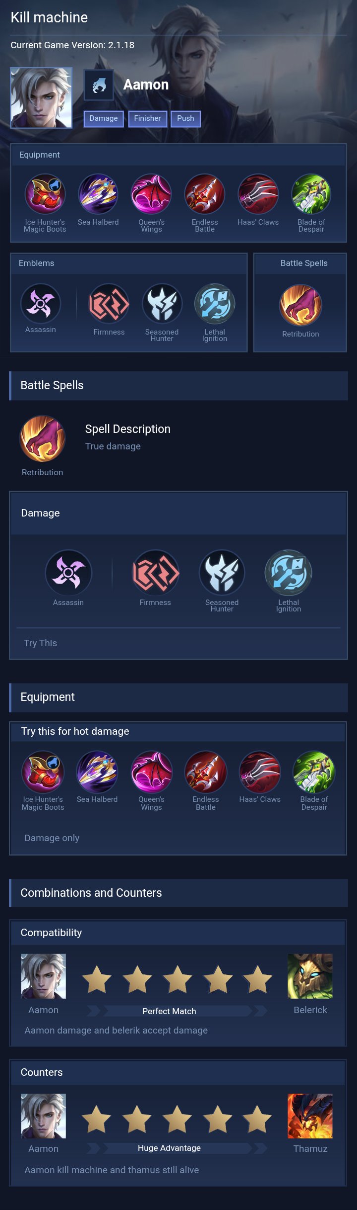 Battle Spell. Use retribution on aamon. I suggest going for Flame Retri in early game to win those hyper 1v1's or early ganks easily as flame retri shreds enemy's defence stats. but for lategame you must switch to one of the other retris