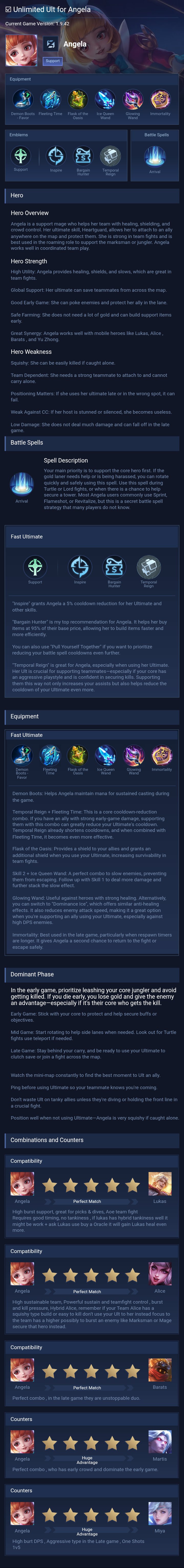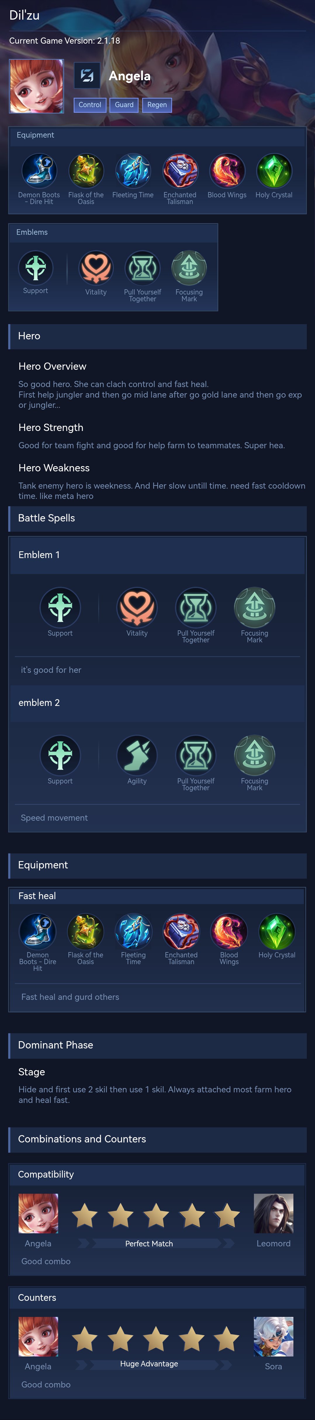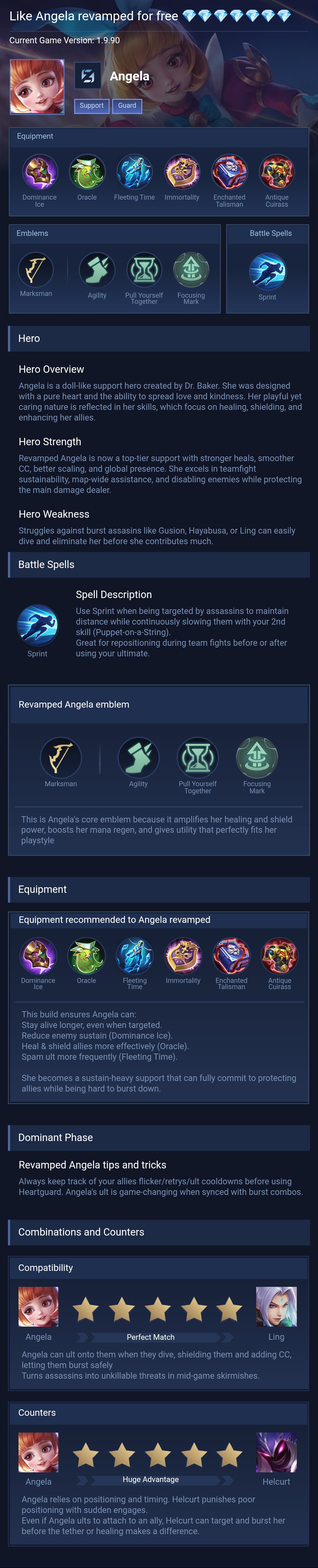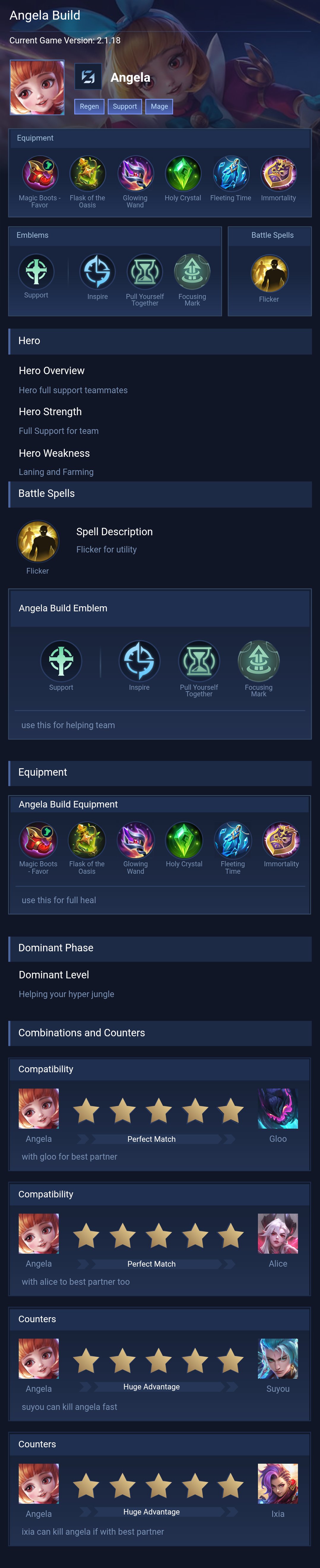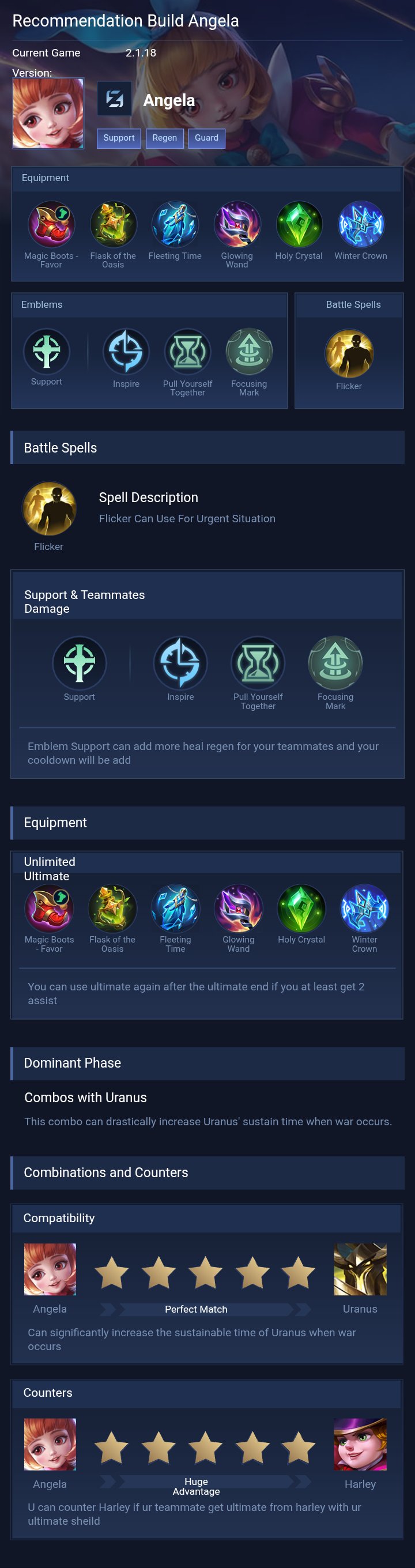 Angela is a support hero with medium difficulty. This is a live guide — win rate, pick rate and counter data refresh every 6 hours from real ranked matches.