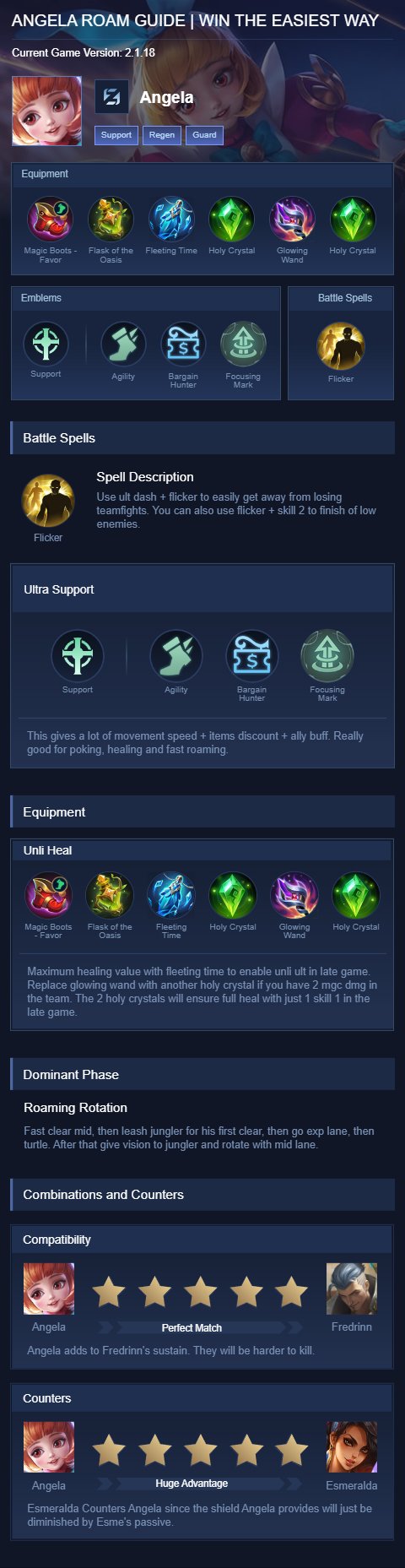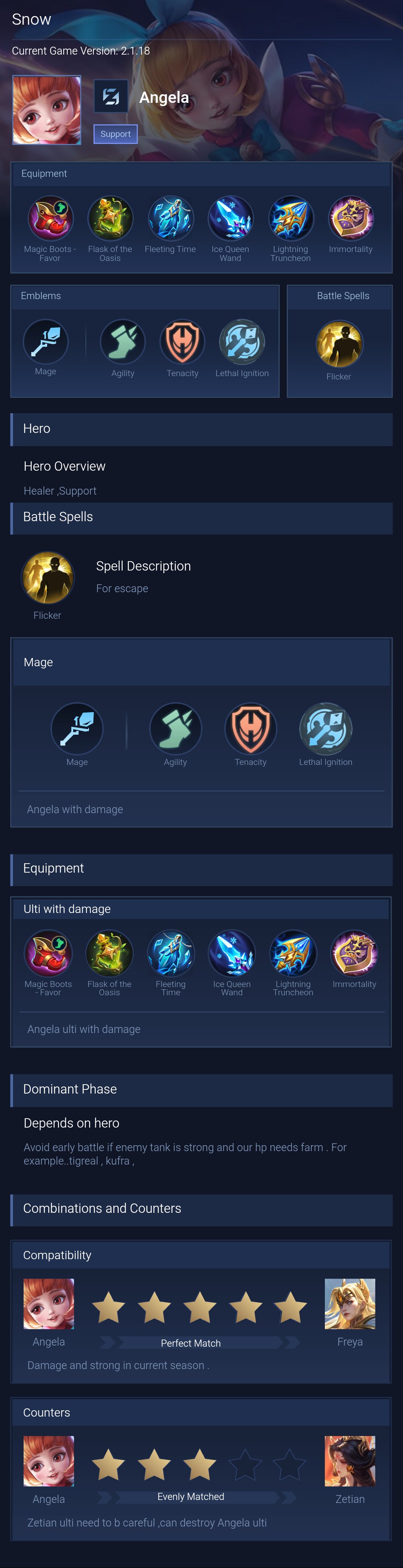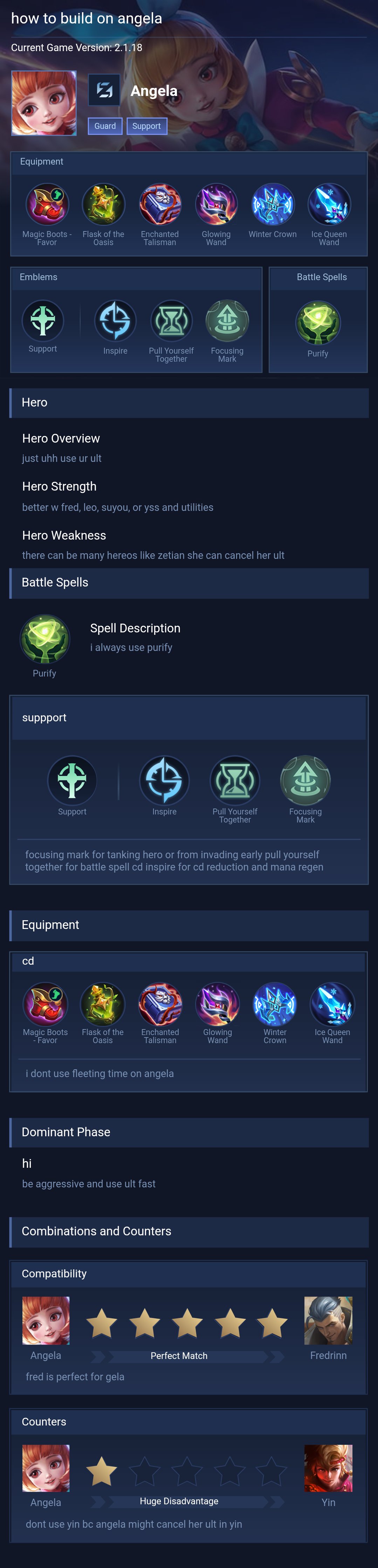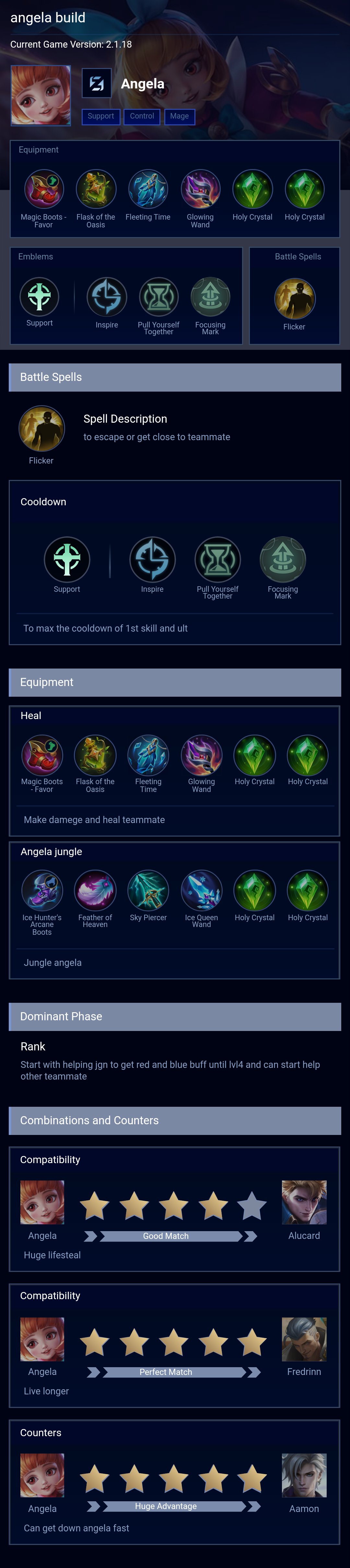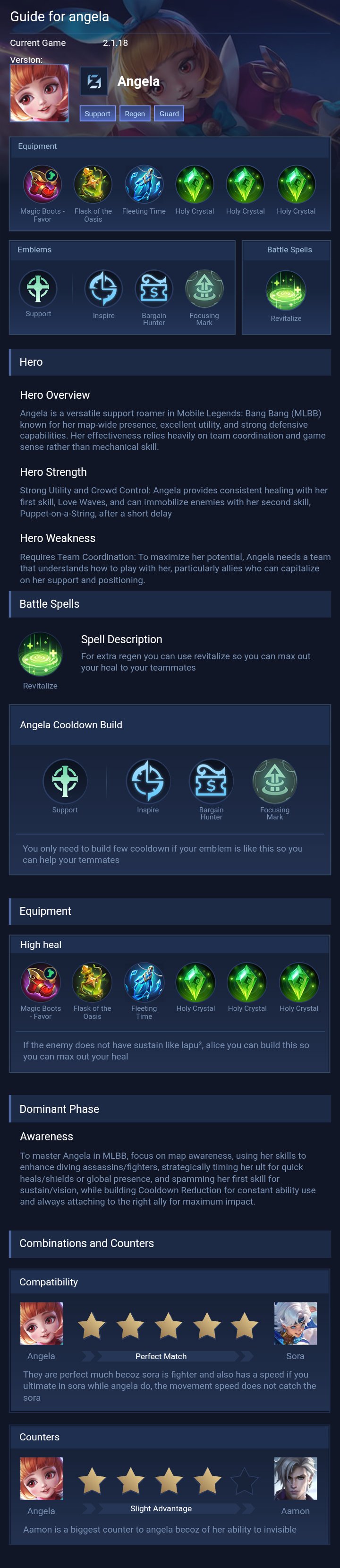 Angela is a support hero with medium difficulty. This is a live guide — win rate, pick rate and counter data refresh every 6 hours from real ranked matches.