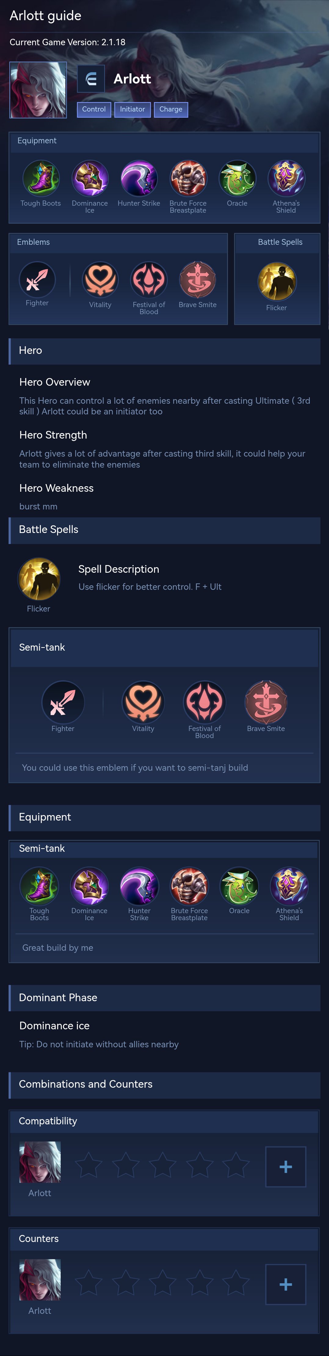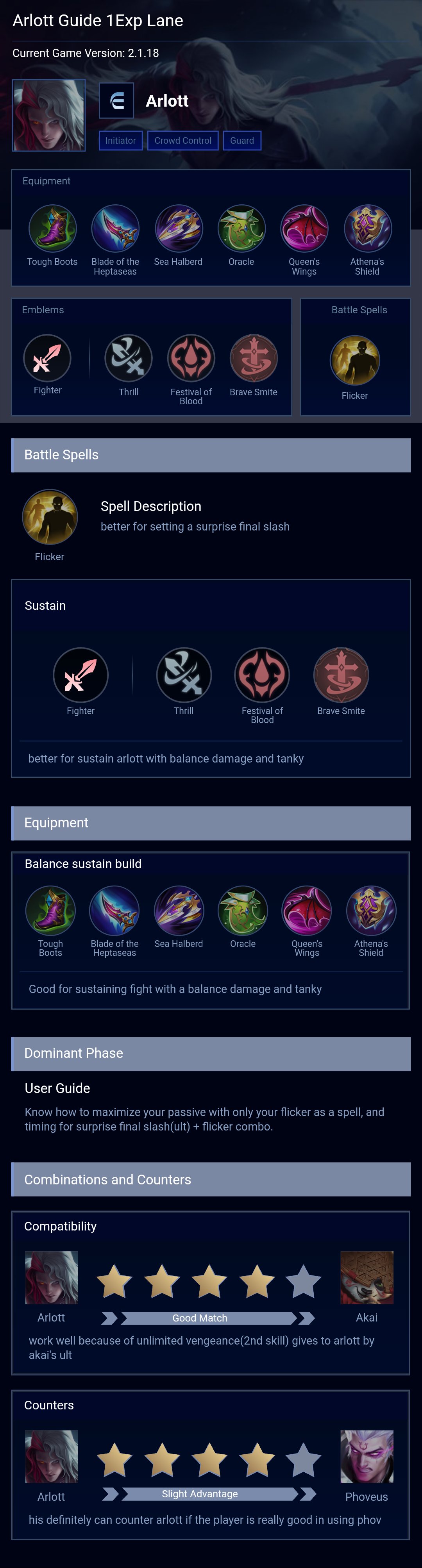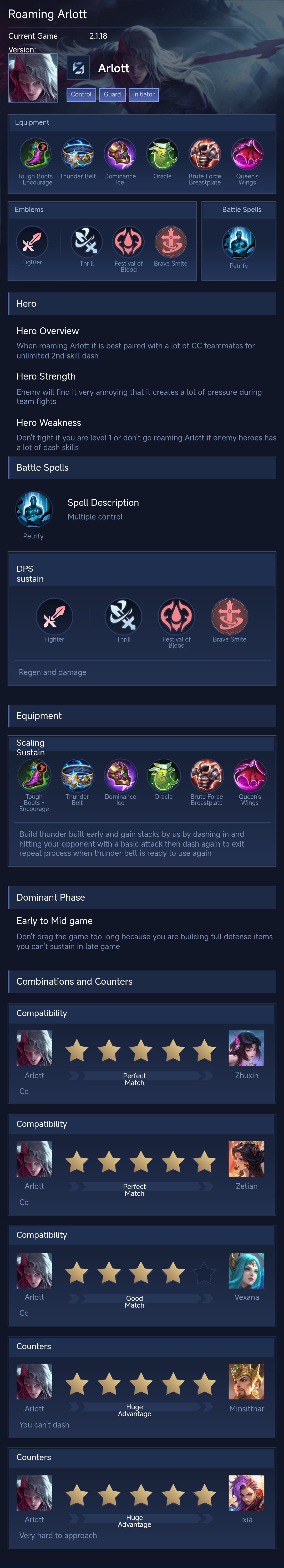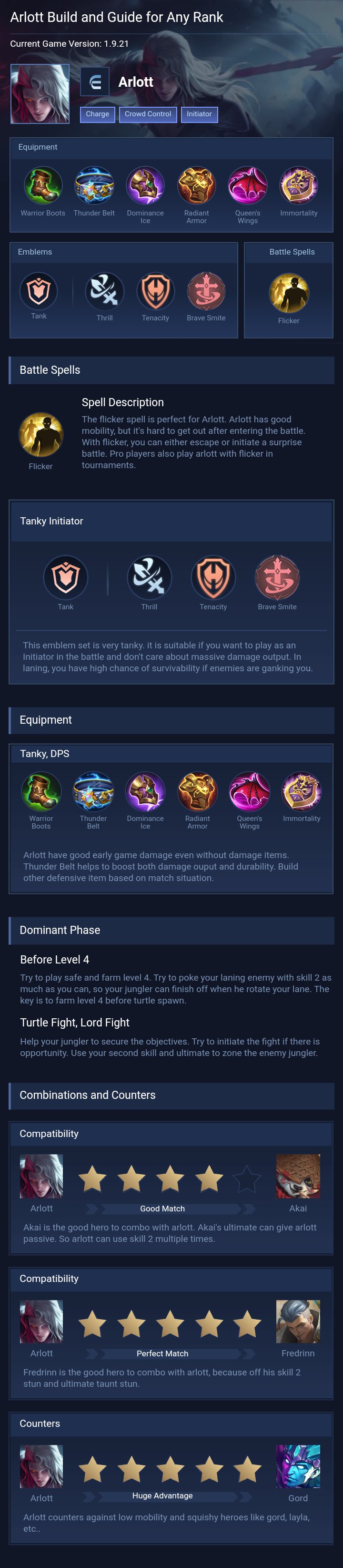 Arlott is a fighter hero with medium difficulty. This is a live guide — win rate, pick rate and counter data refresh every 6 hours from real ranked matches.