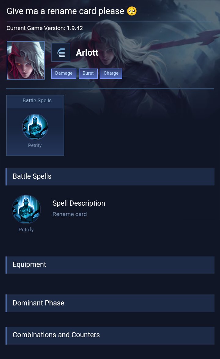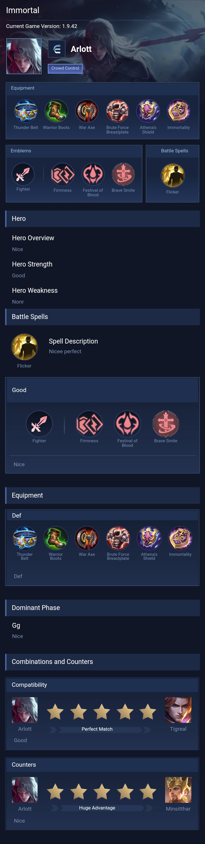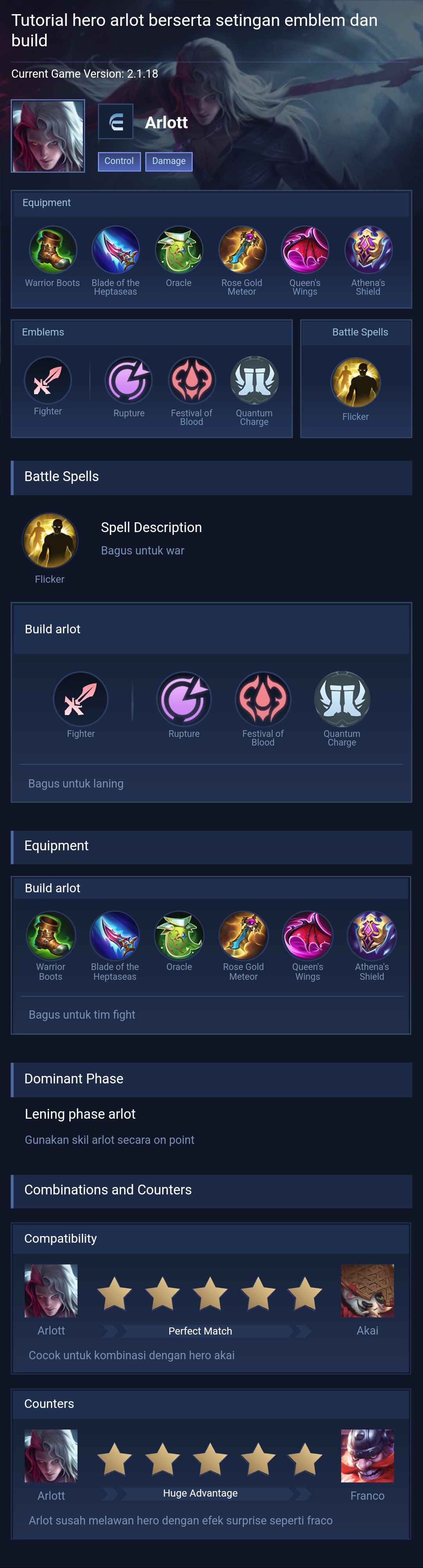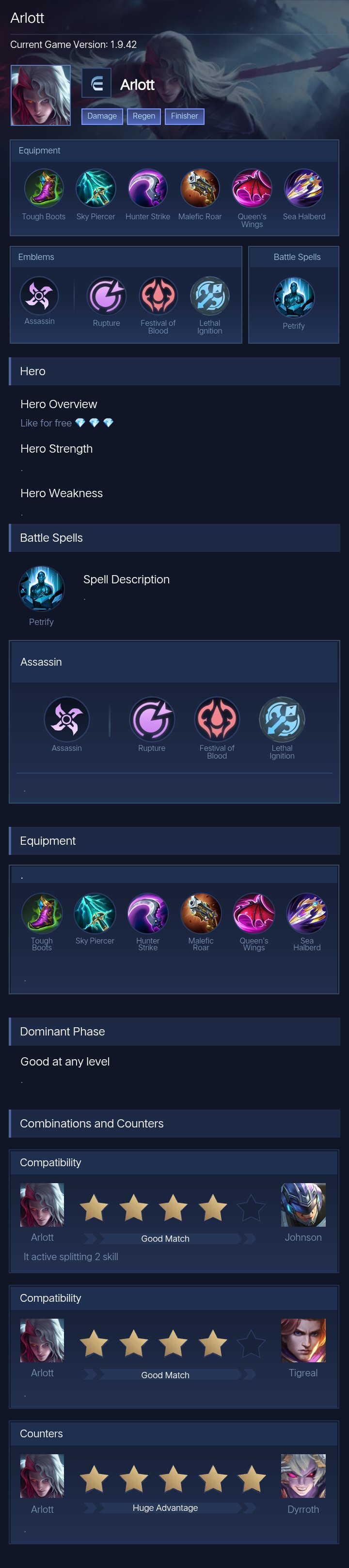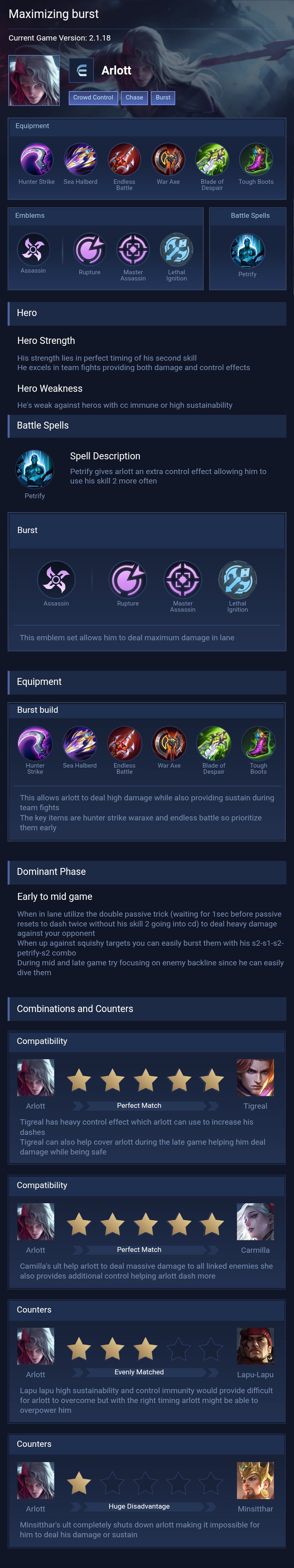 Arlott is a fighter hero with medium difficulty. This is a live guide — win rate, pick rate and counter data refresh every 6 hours from real ranked matches.