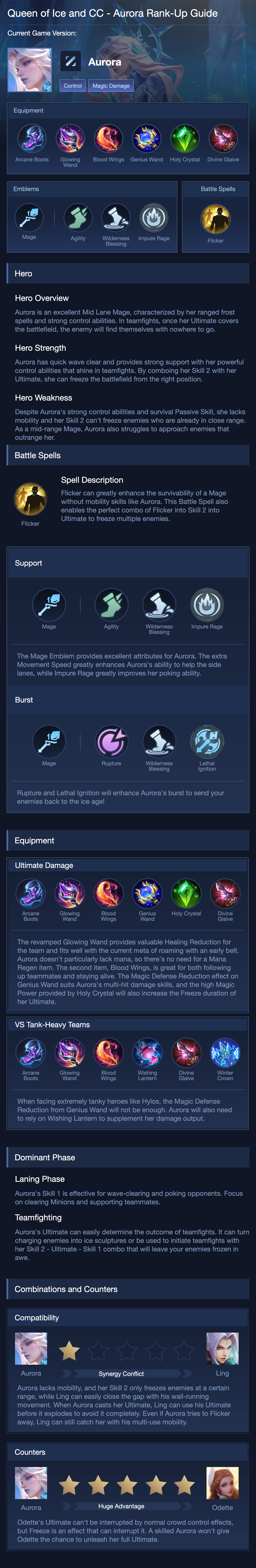 Ultimate Damage. The revamped Glowing Wand provides valuable Healing Reduction for the team and fits well with the current meta of roaming with an early belt. Aurora doesn't particularly lack mana, so there's no need for a Mana Regen item. The second item, Blood Wings, is great for both following up teammates and staying alive. The Magic Defense Reduction effect on Genius Wand suits Aurora's multi-hit damage skills, and the high Magic Power provided by Holy Crystal will also increase the Freeze duration of her Ultimate.