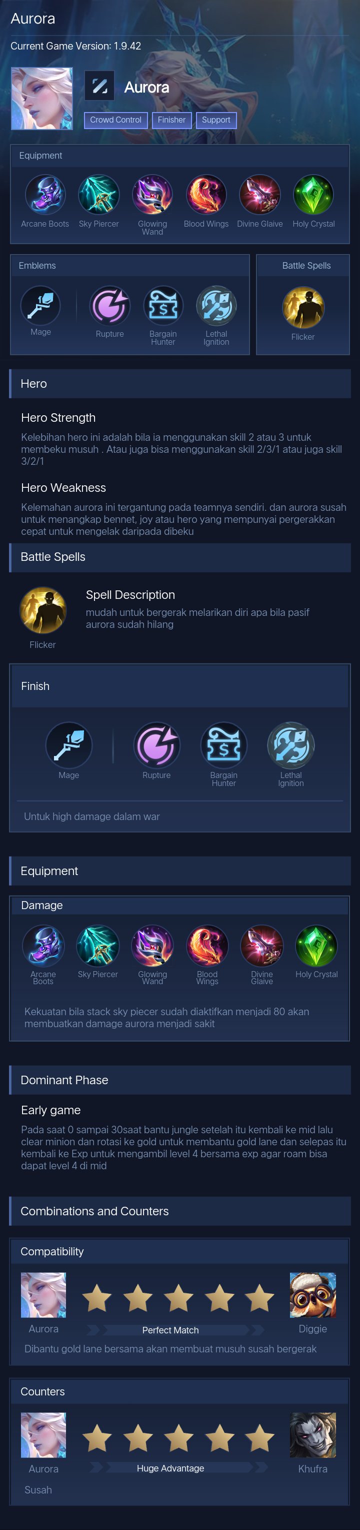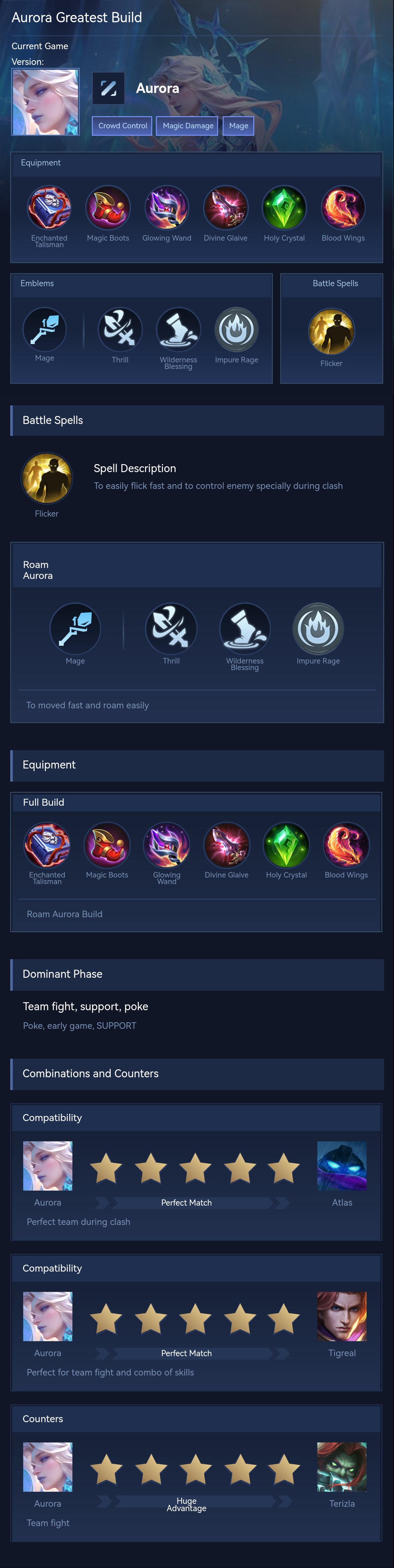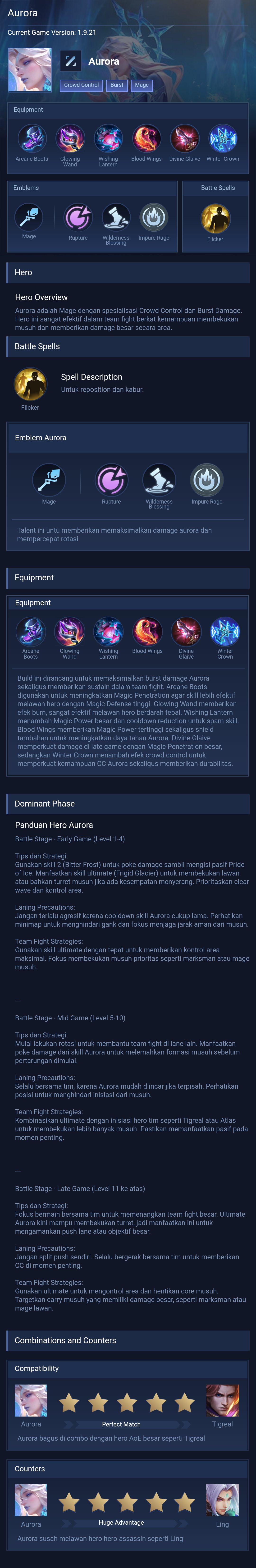Equipment. Build ini dirancang untuk memaksimalkan burst damage Aurora sekaligus memberikan sustain dalam team fight. Arcane Boots digunakan untuk meningkatkan Magic Penetration agar skill lebih efektif melawan hero dengan Magic Defense tinggi. Glowing Wand memberikan efek burn, sangat efektif melawan hero berdarah tebal. Wishing Lantern menambah Magic Power besar dan cooldown reduction untuk spam skill. Blood Wings memberikan Magic Power tertinggi sekaligus shield tambahan untuk meningkatkan daya tahan Aurora. Divine Glaive memperkuat damage di late game dengan Magic Penetration besar, sedangkan Winter Crown menambah efek crowd control untuk memperkuat kemampuan CC Aurora sekaligus memberikan durabilitas.