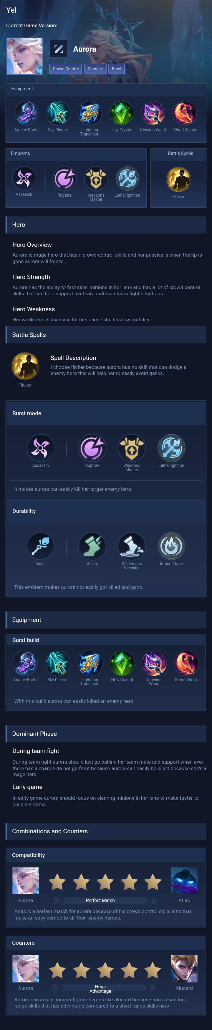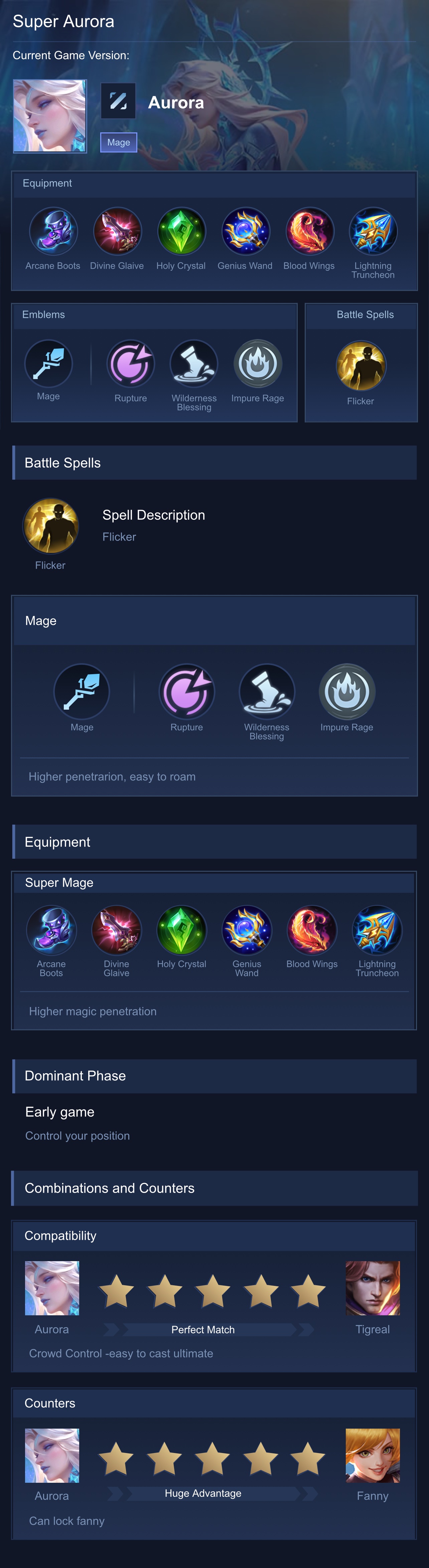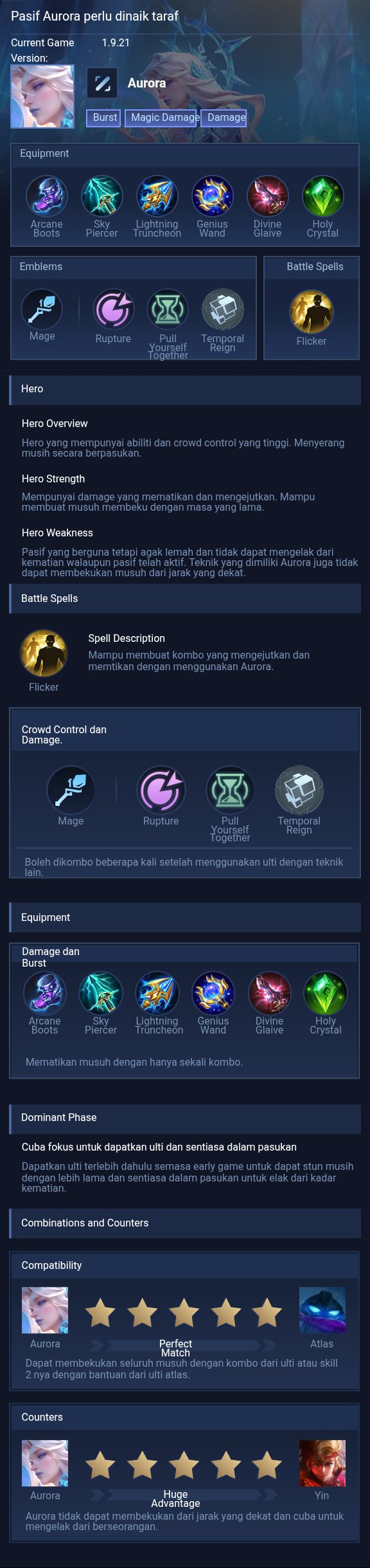 Equipment. Build ini dirancang untuk memaksimalkan burst damage Aurora sekaligus memberikan sustain dalam team fight. Arcane Boots digunakan untuk meningkatkan Magic Penetration agar skill lebih efektif melawan hero dengan Magic Defense tinggi. Glowing Wand memberikan efek burn, sangat efektif melawan hero berdarah tebal. Wishing Lantern menambah Magic Power besar dan cooldown reduction untuk spam skill. Blood Wings memberikan Magic Power tertinggi sekaligus shield tambahan untuk meningkatkan daya tahan Aurora. Divine Glaive memperkuat damage di late game dengan Magic Penetration besar, sedangkan Winter Crown menambah efek crowd control untuk memperkuat kemampuan CC Aurora sekaligus memberikan durabilitas.
