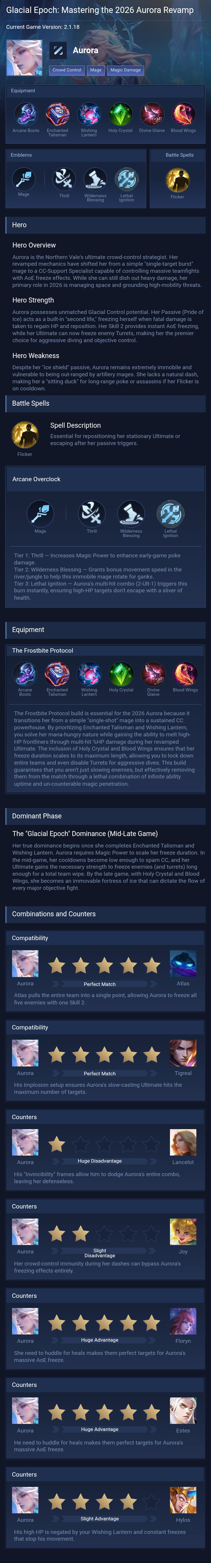 The Frostbite Protocol. The Frostbite Protocol build is essential for the 2026 Aurora because it transitions her from a simple "single-shot" mage into a sustained CC powerhouse. By prioritizing Enchanted Talisman and Wishing Lantern, you solve her mana-hungry nature while gaining the ability to melt high-HP frontliners through multi-hit %HP damage during her revamped Ultimate. The inclusion of Holy Crystal and Blood Wings ensures that her freeze duration scales to its maximum length, allowing you to lock down entire teams and even disable Turrets for aggressive dives. This build guarantees that you aren't just slowing enemies, but effectively removing them from the match through a lethal combination of infinite ability uptime and un-counterable magic penetration.