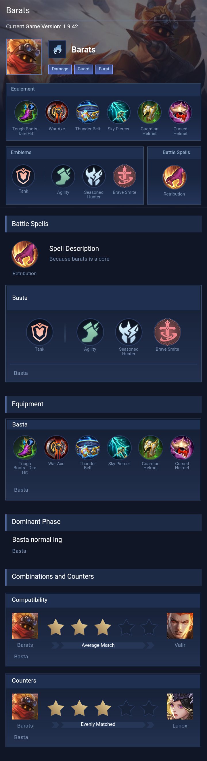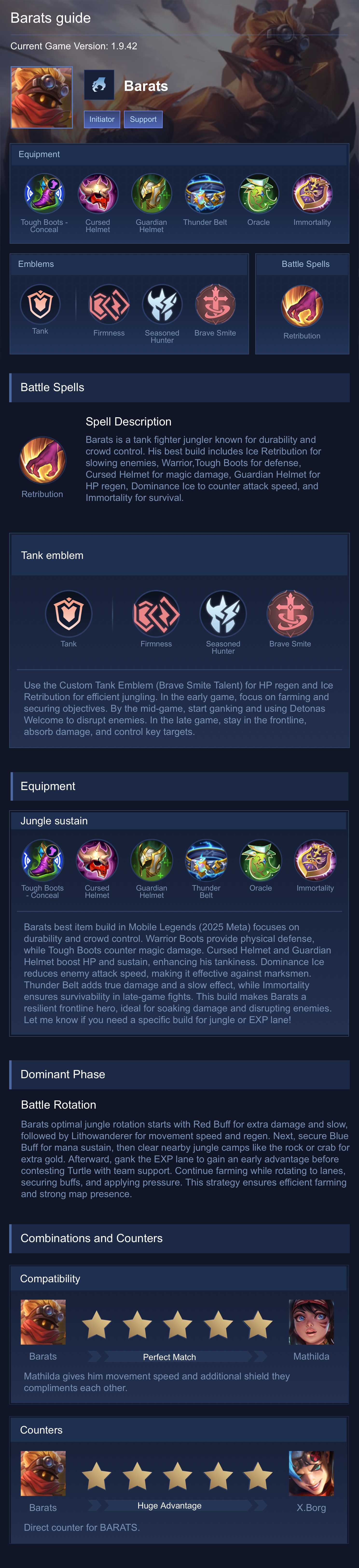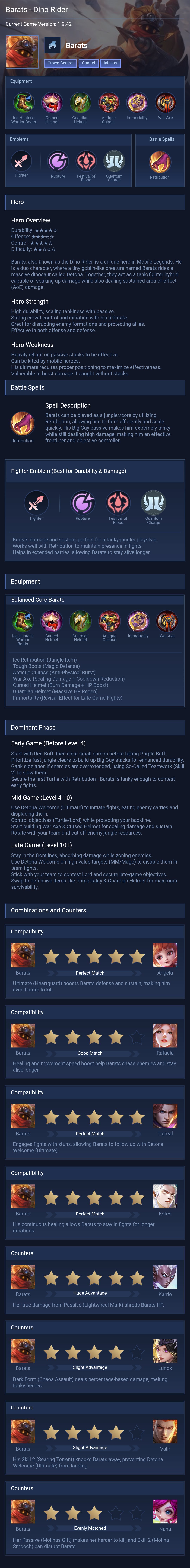 Barats is a tank hero with medium difficulty. This is a live guide — win rate, pick rate and counter data refresh every 6 hours from real ranked matches.