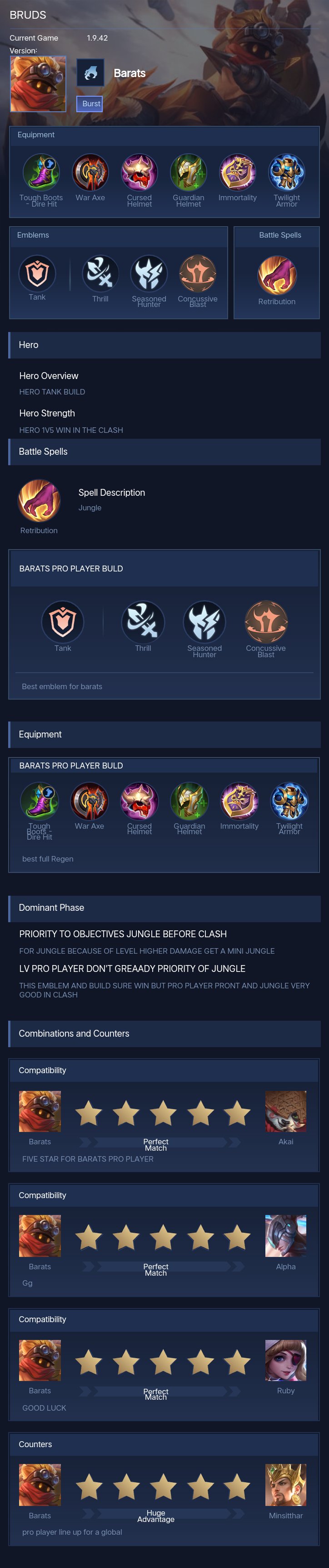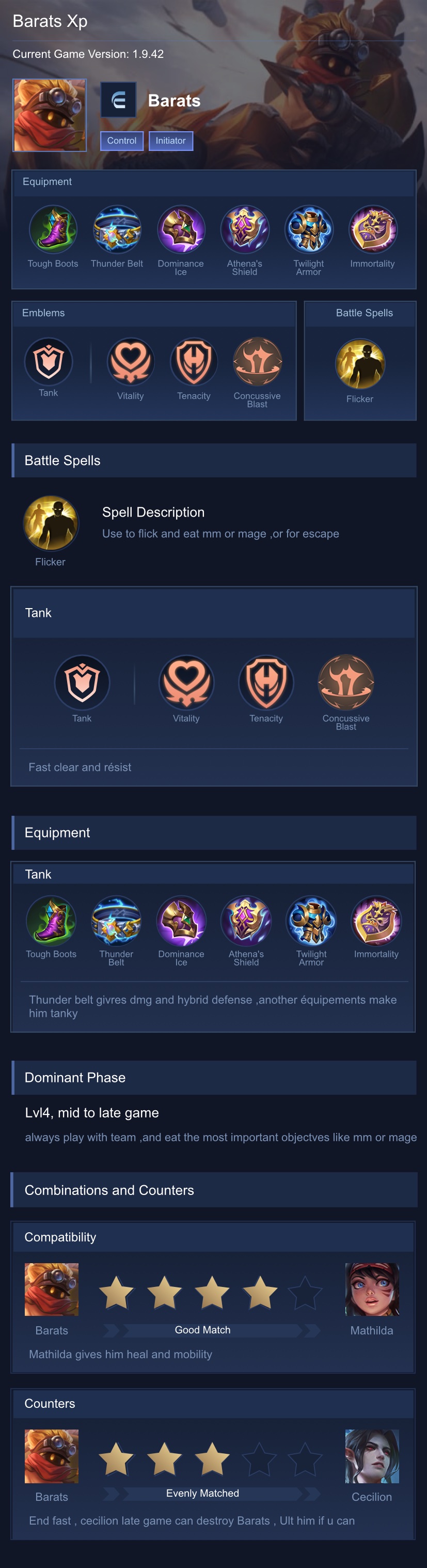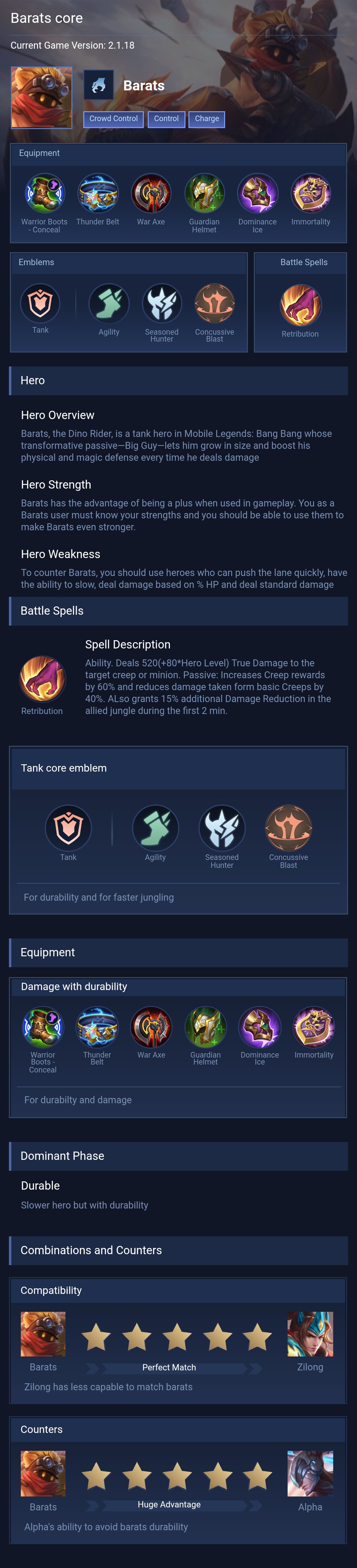Barats is a tank hero with medium difficulty. This is a live guide — win rate, pick rate and counter data refresh every 6 hours from real ranked matches.