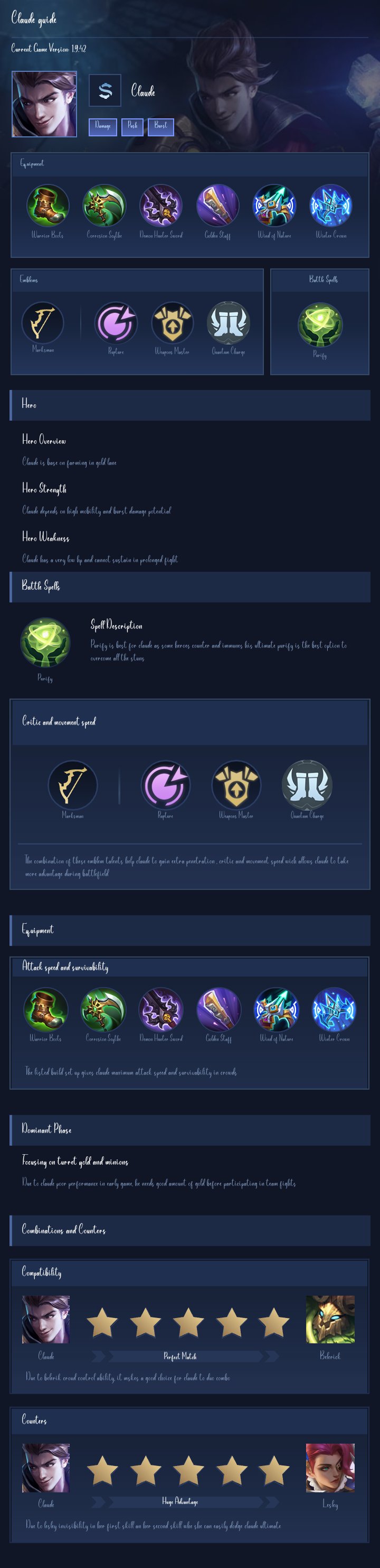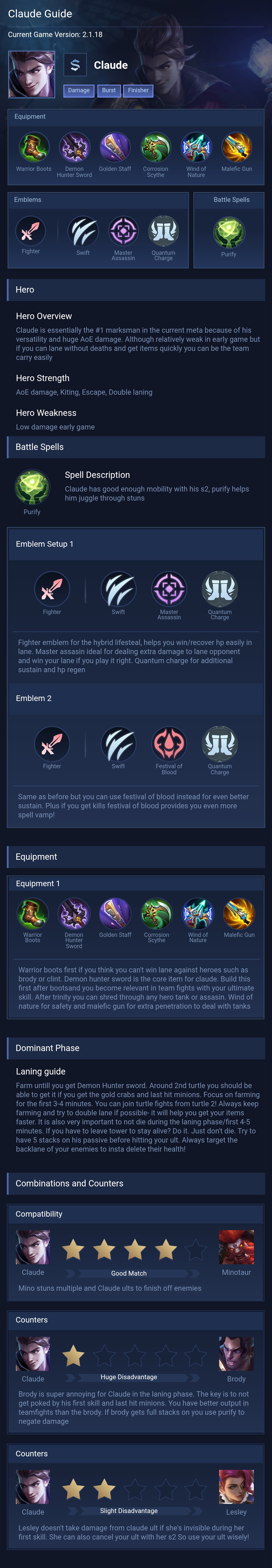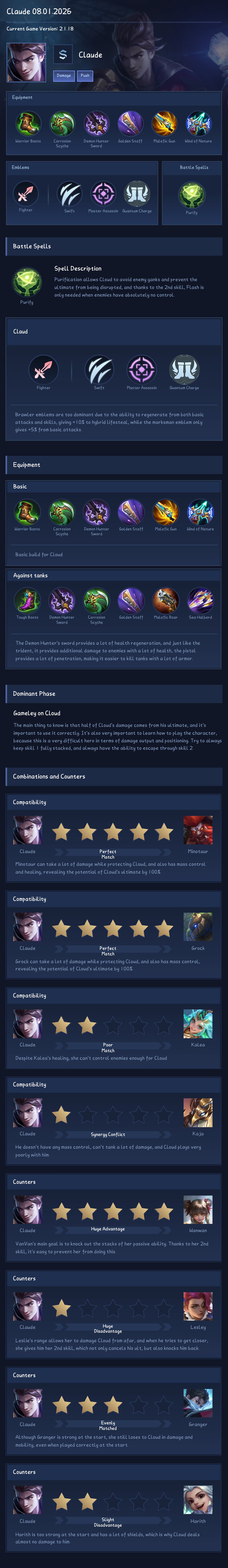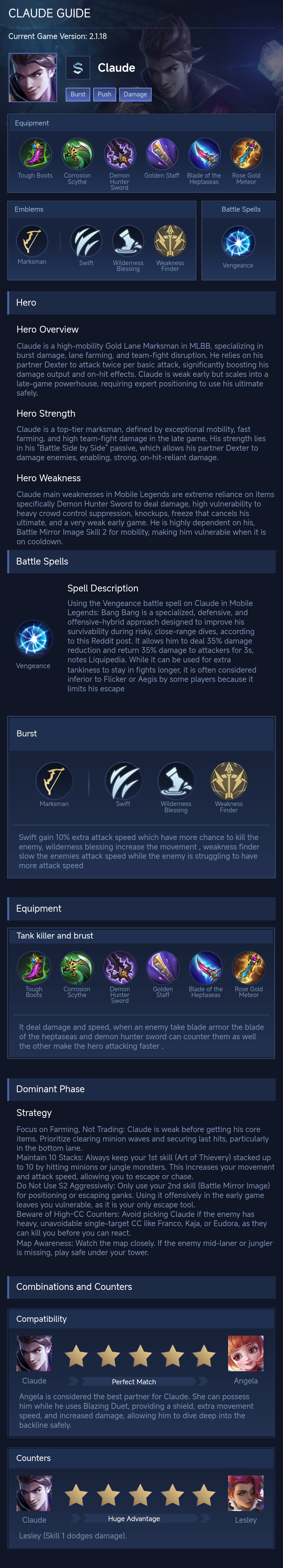 Claude is a marksman hero with medium difficulty. This is a live guide — win rate, pick rate and counter data refresh every 6 hours from real ranked matches.