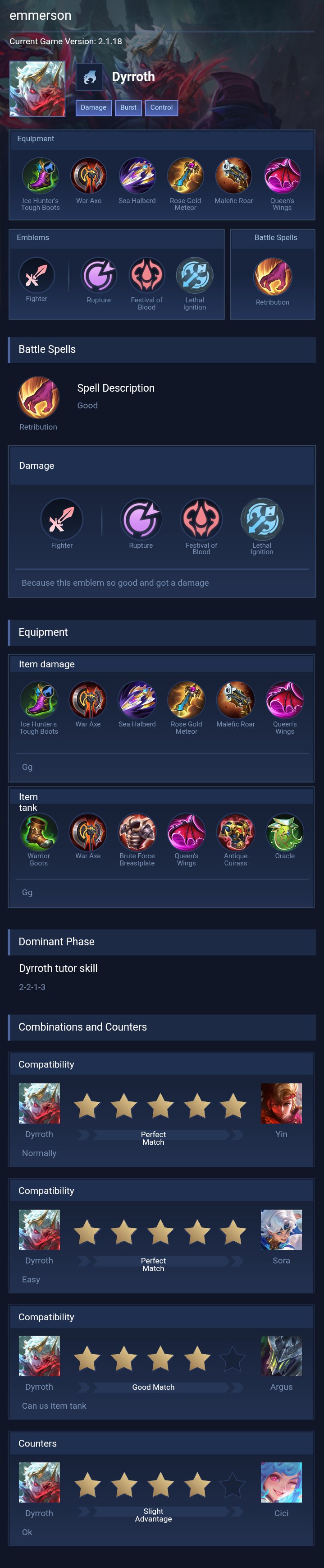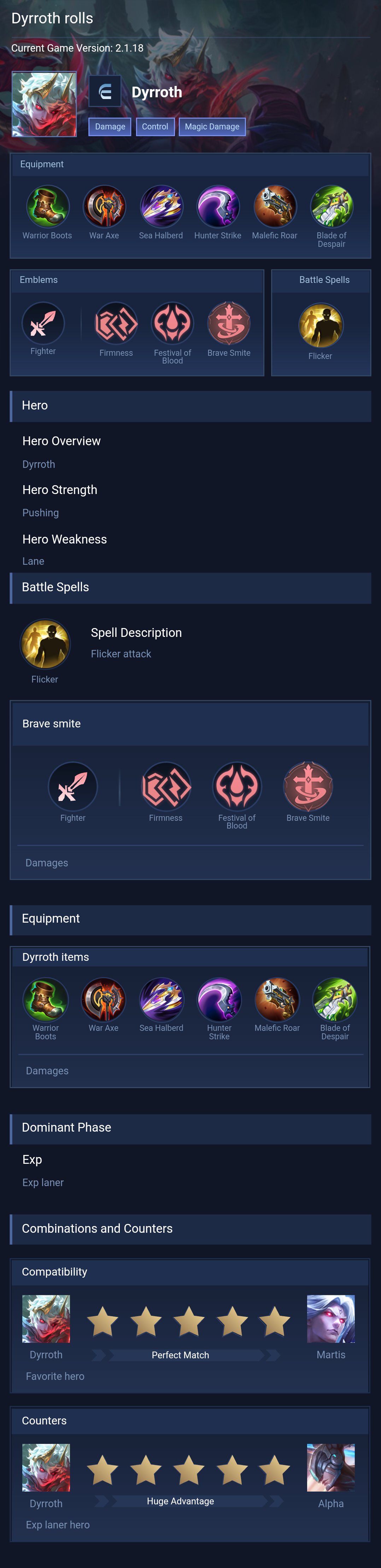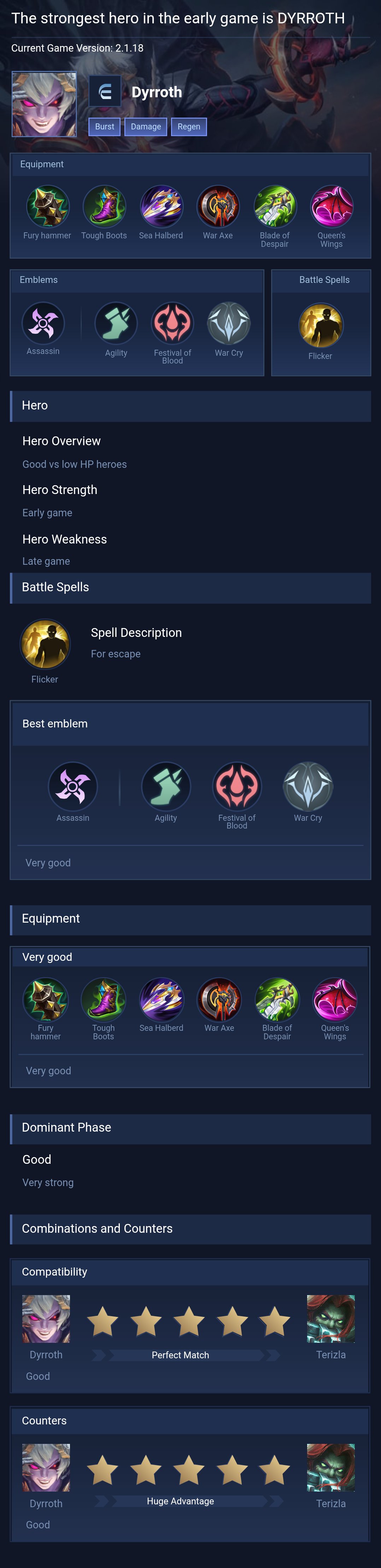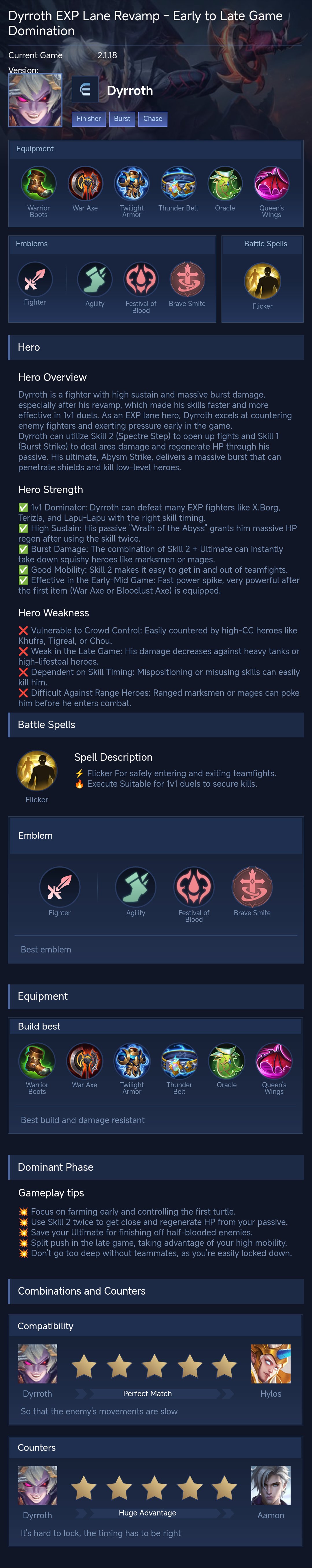 Dyrroth is a fighter hero with medium difficulty. This is a live guide — win rate, pick rate and counter data refresh every 6 hours from real ranked matches.