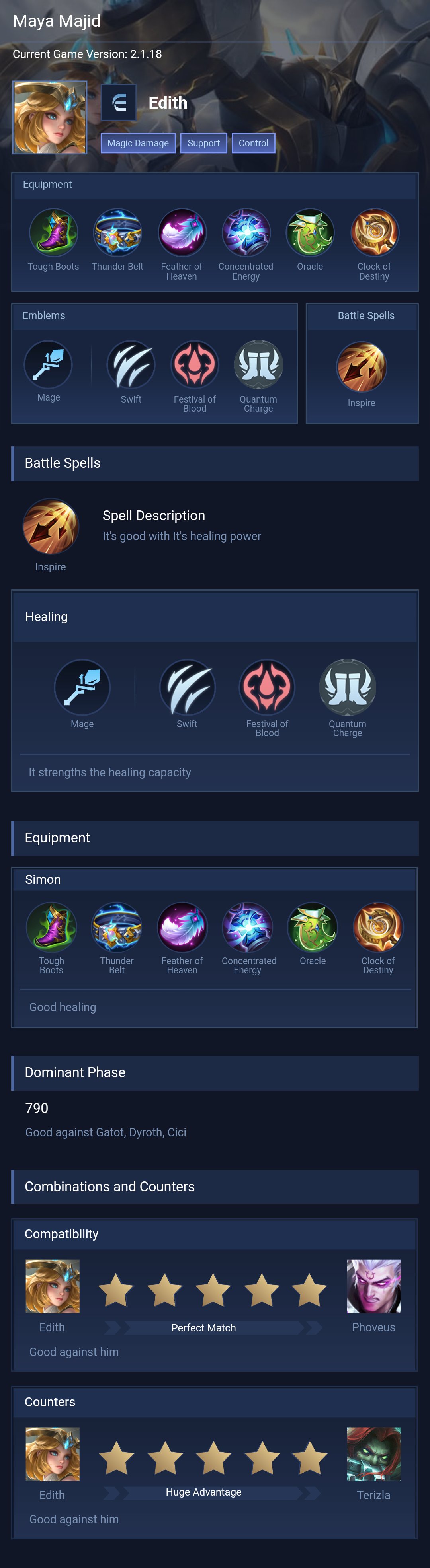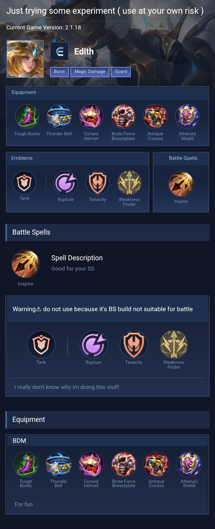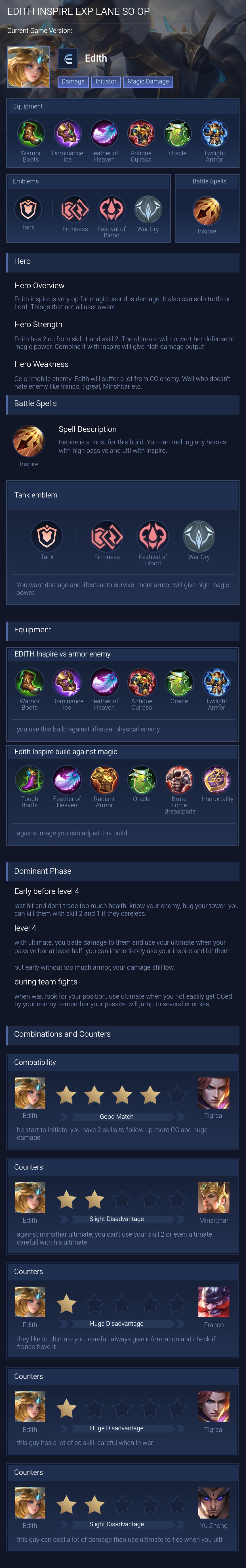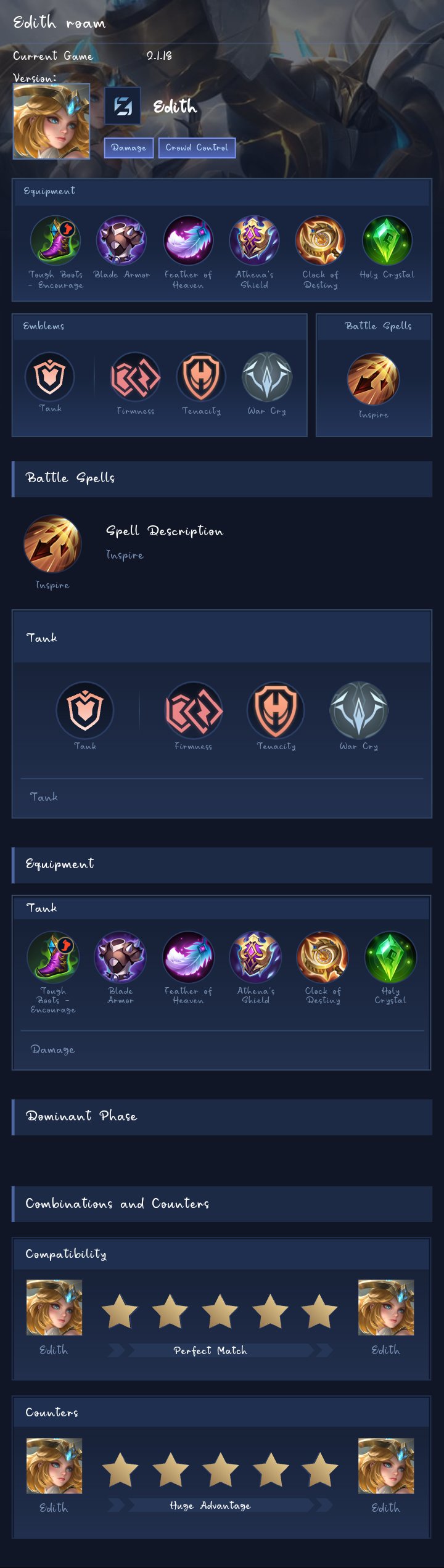 Semi-Tank and damage (with inspire). Edith performs exceptionally well with Inspire, as it allows her to easily secure objectives like Turtles and Lords, while also shredding through high enemy defenses. This makes her a formidable force in battles. I highly recommend this build when facing squishy heroes, as it maximizes her damage output and dominance in the game.