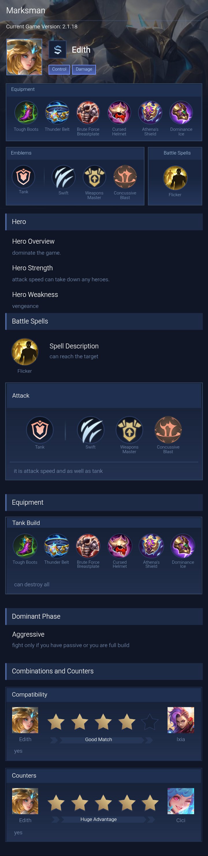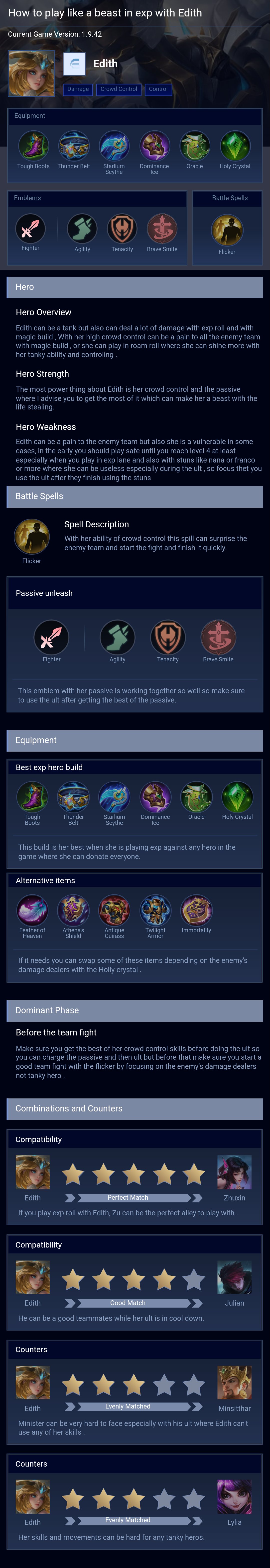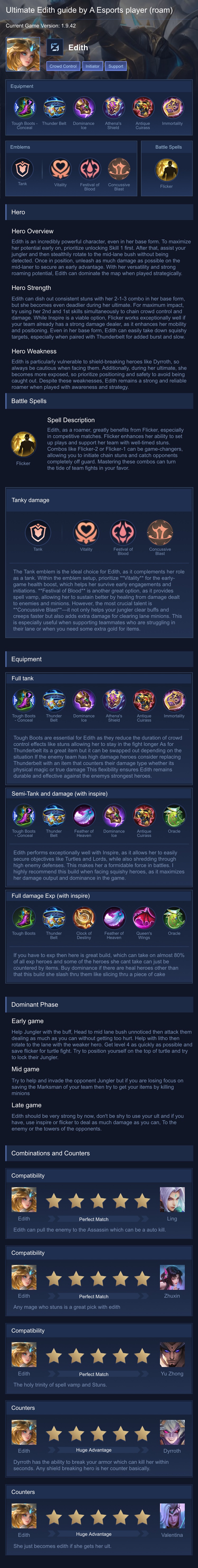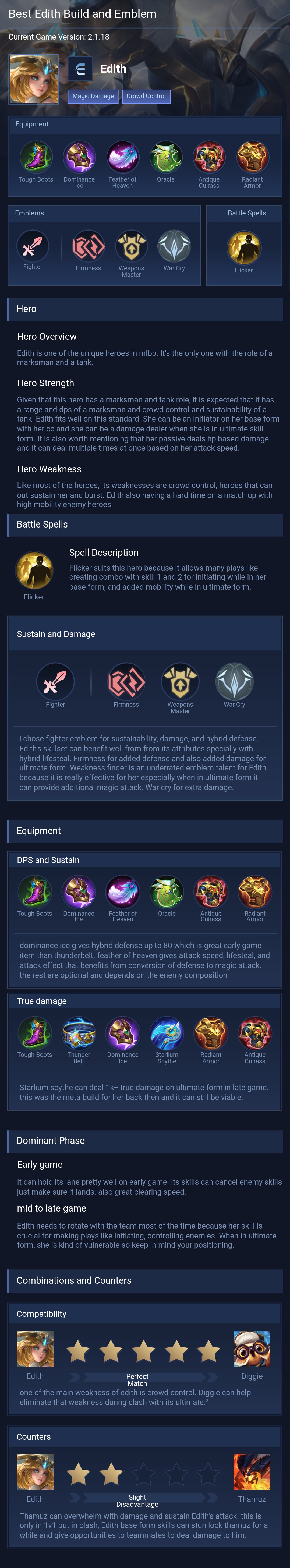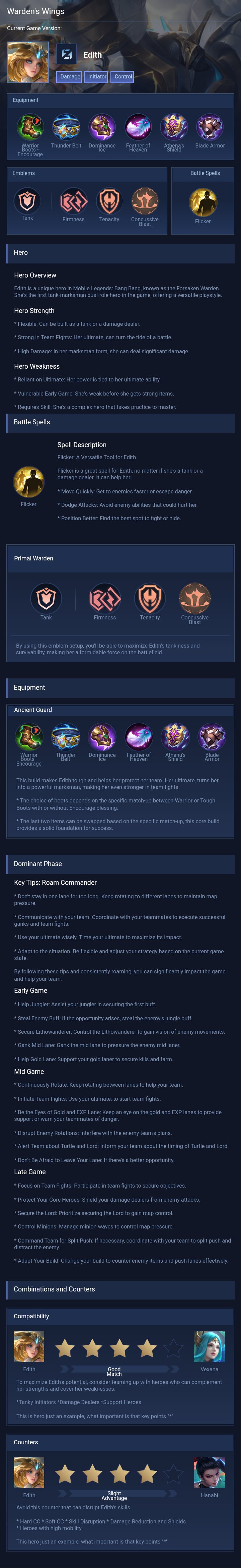 Ancient Guard . This build makes Edith tough and helps her protect her team. Her ultimate, turns her into a powerful marksman, making her even stronger in team fights.