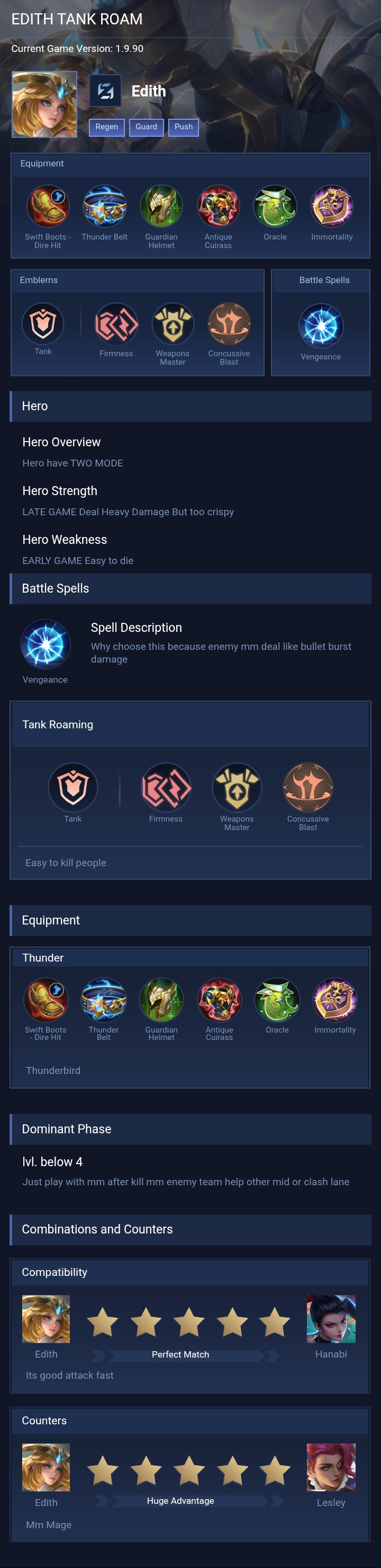 Full tank. Tough Boots are essential for Edith as they reduce the duration of crowd control effects like stuns allowing her to stay in the fight longer As for Thunderbelt its a great item but it can be swapped out depending on the situation If the enemy team has high damage heroes consider replacing Thunderbelt with an item that counters their damage type whether its physical magic or true damage This flexibility ensures Edith remains durable and effective against the enemys strongest heroes.