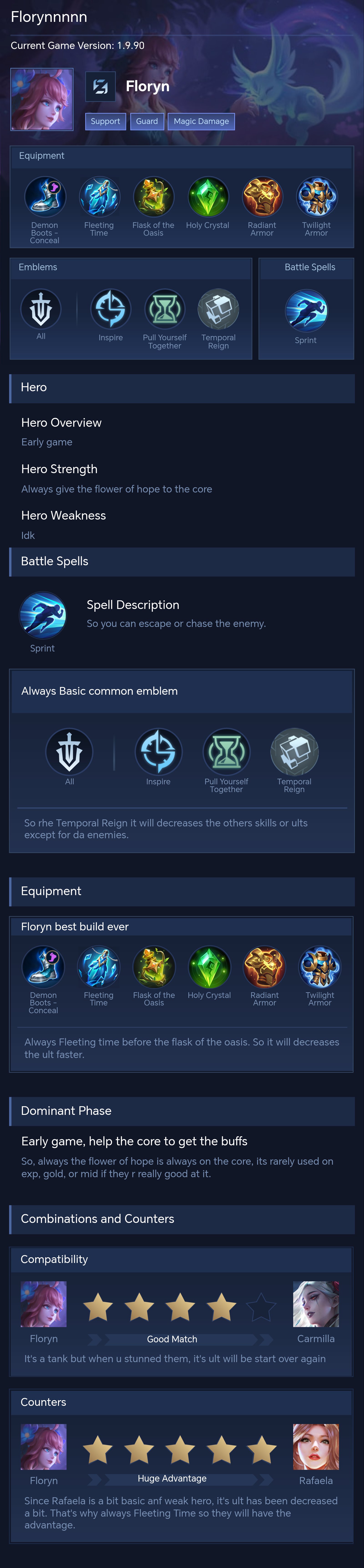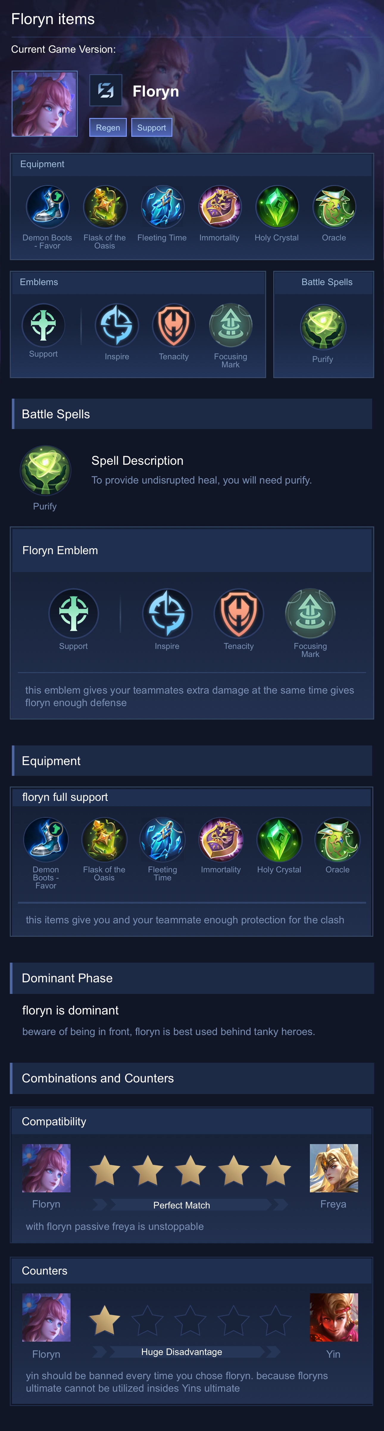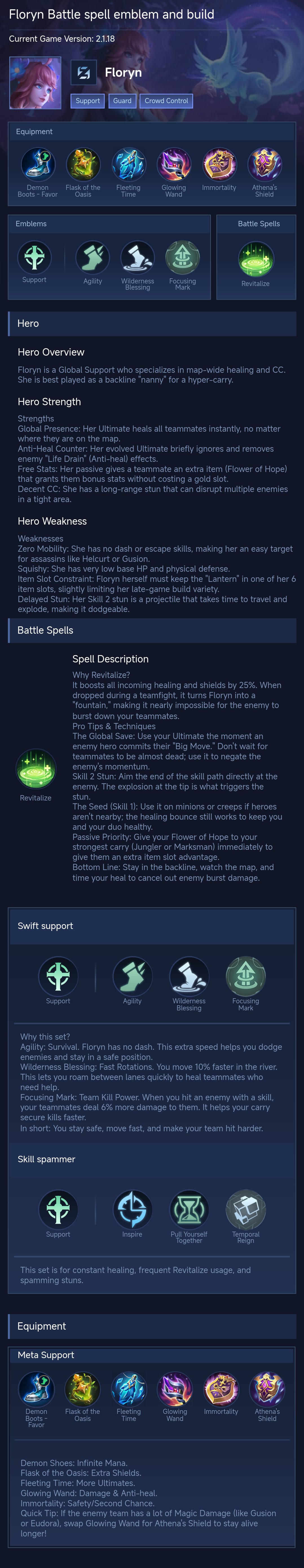 This emblem set is effective for all types of hero sets dutring draft. Support emblem is suitable for floryn to facilitate more of her healing capabilities. Focusing mask is number 1 because if you hit an enemy and clashing with them this might help as team mates will deal additional damage to the ones that have the mark. #2 is Pull yourself together, as we all know that floryn ultimate has a long cd we need this to shorten it. And also cd to be able to spam first skill at most