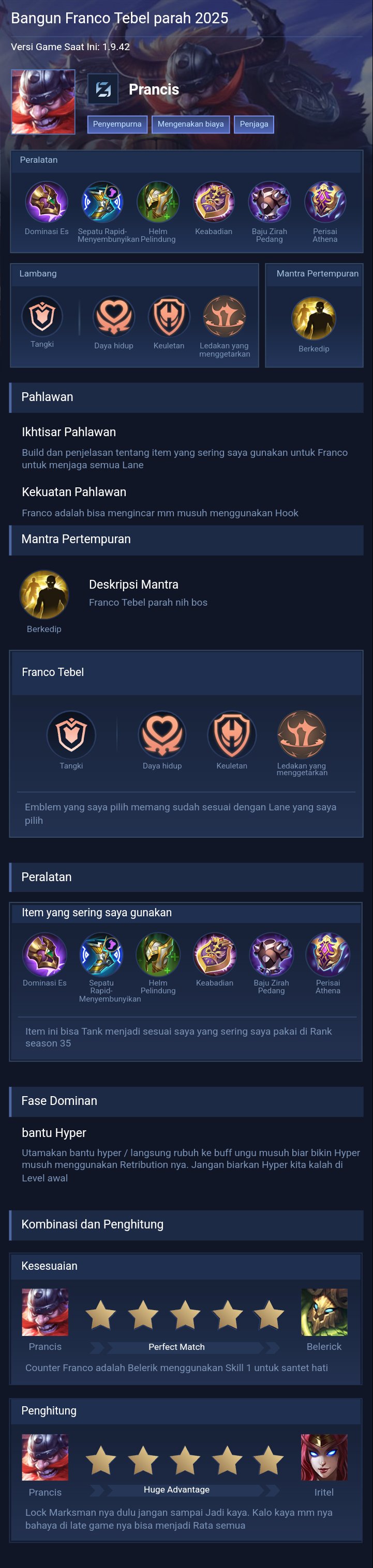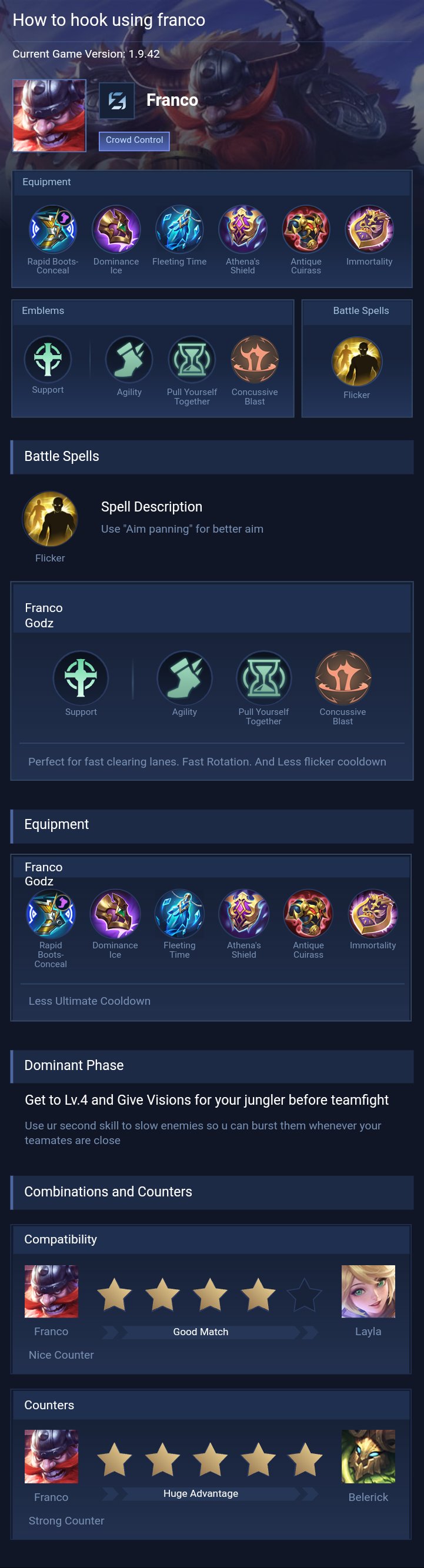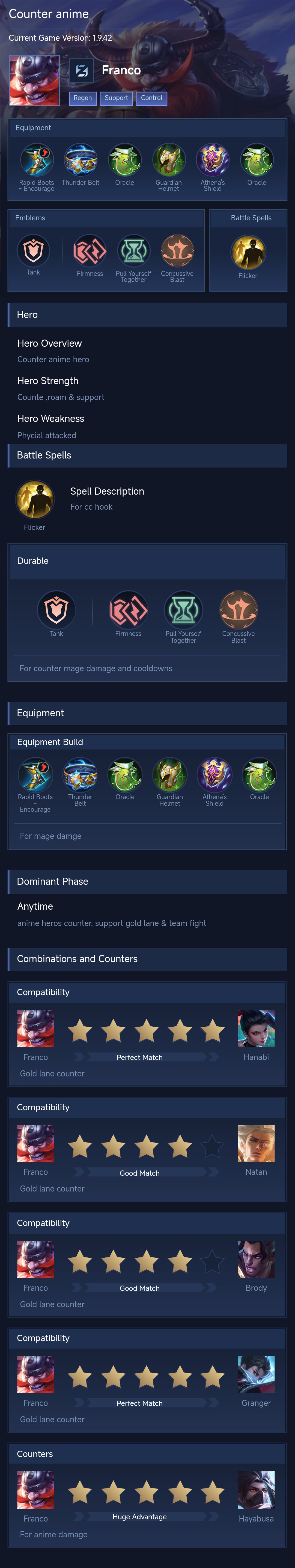 Franco is a tank hero with easy difficulty. This is a live guide — win rate, pick rate and counter data refresh every 6 hours from real ranked matches.