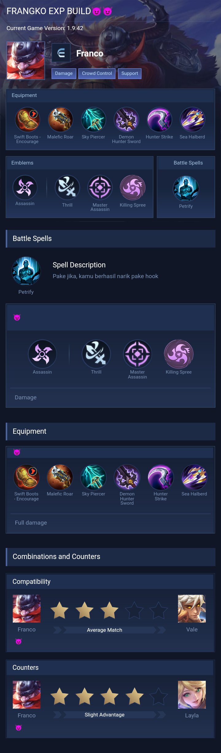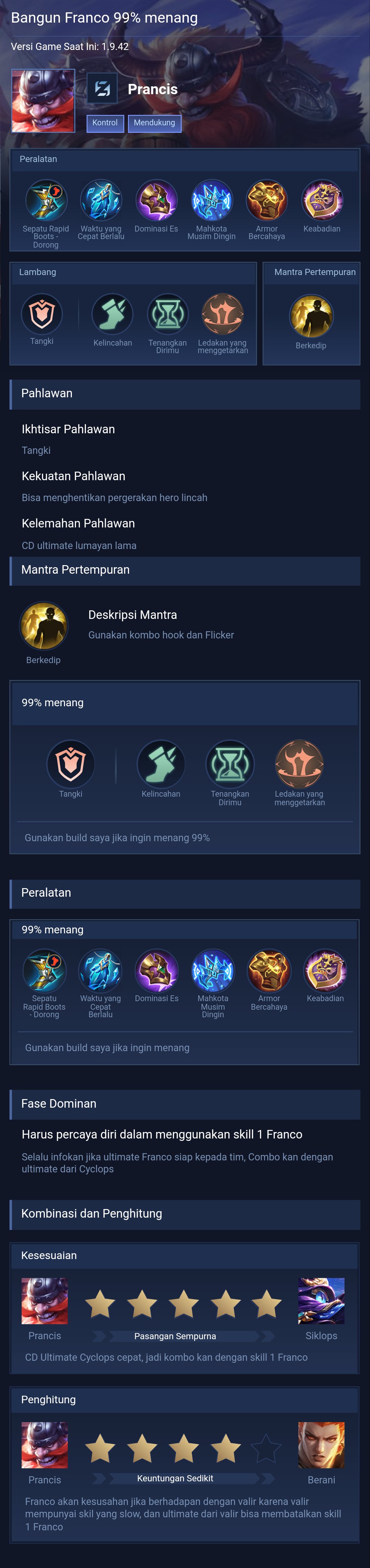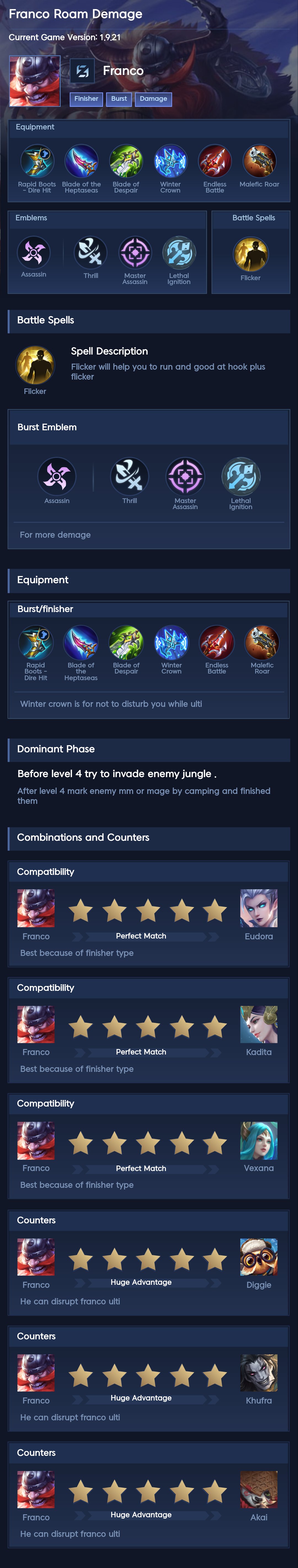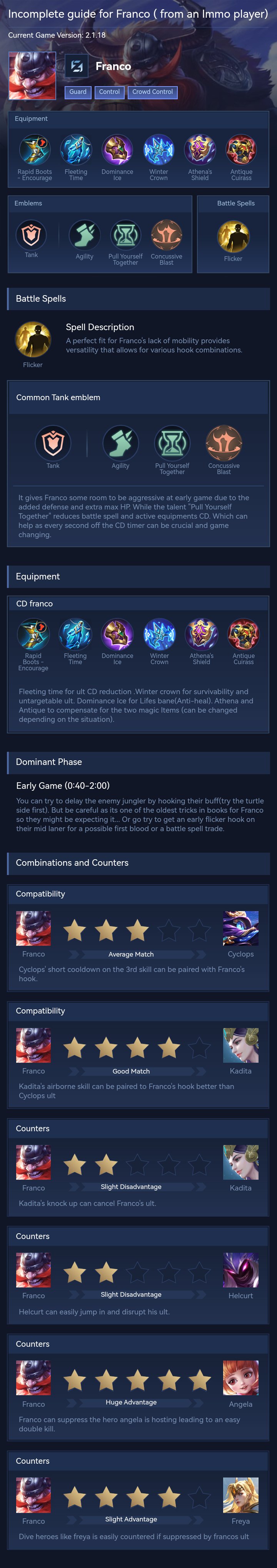 Franco is a tank hero with easy difficulty. This is a live guide — win rate, pick rate and counter data refresh every 6 hours from real ranked matches.