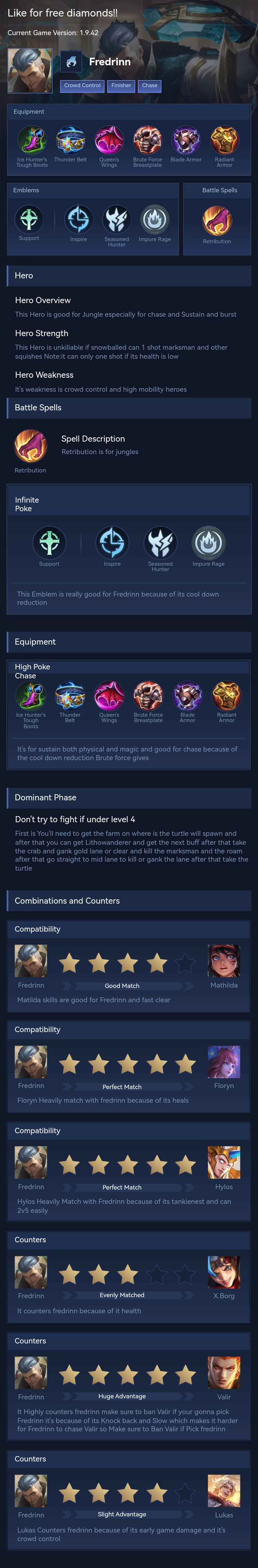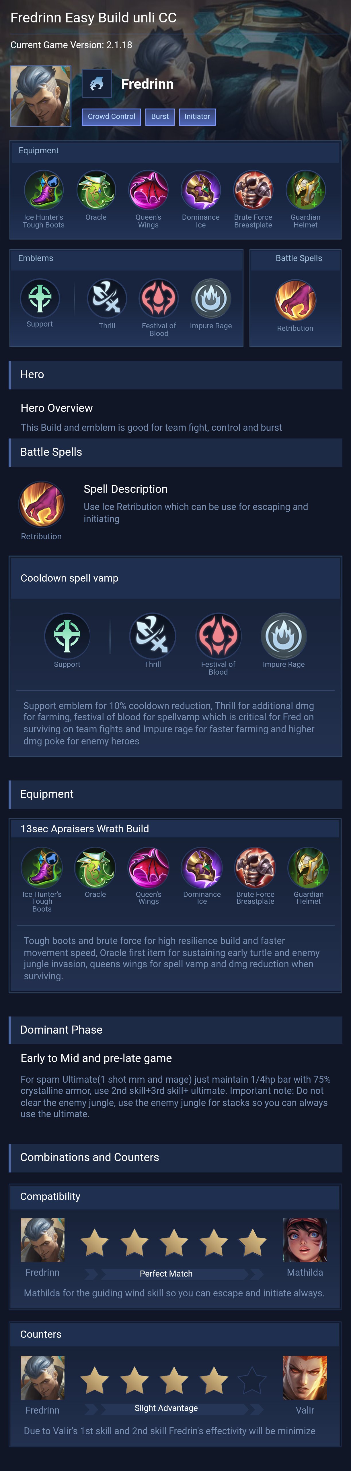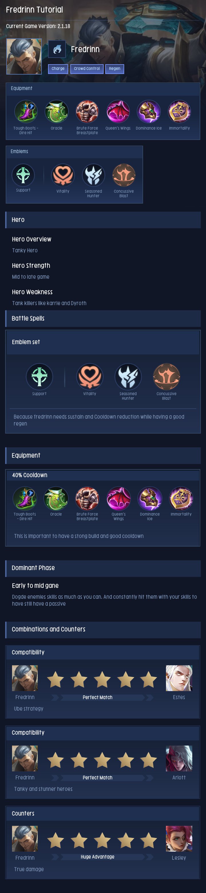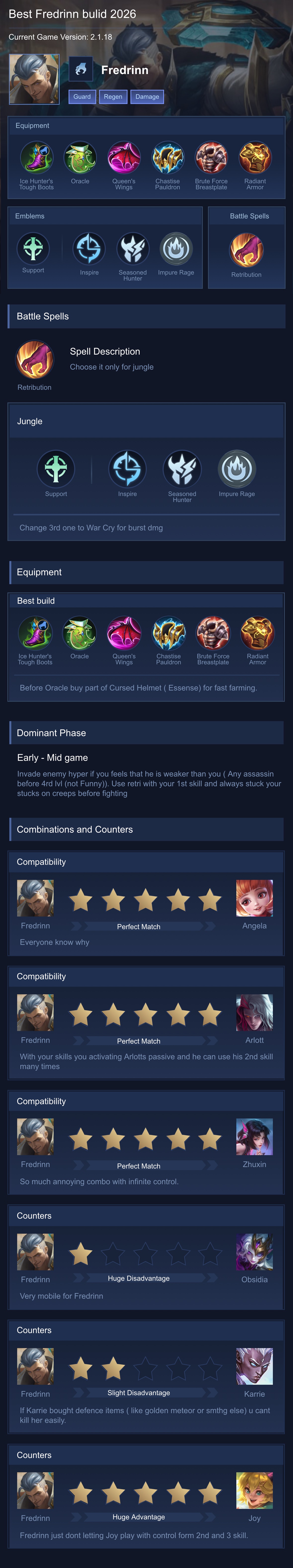 Fredrinn is a fighter hero with medium difficulty. This is a live guide — win rate, pick rate and counter data refresh every 6 hours from real ranked matches.
