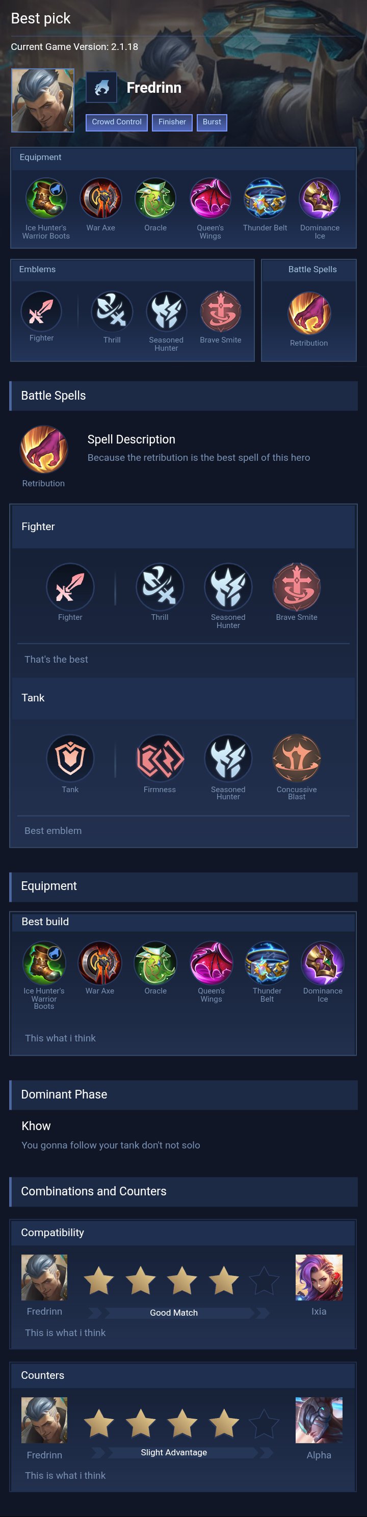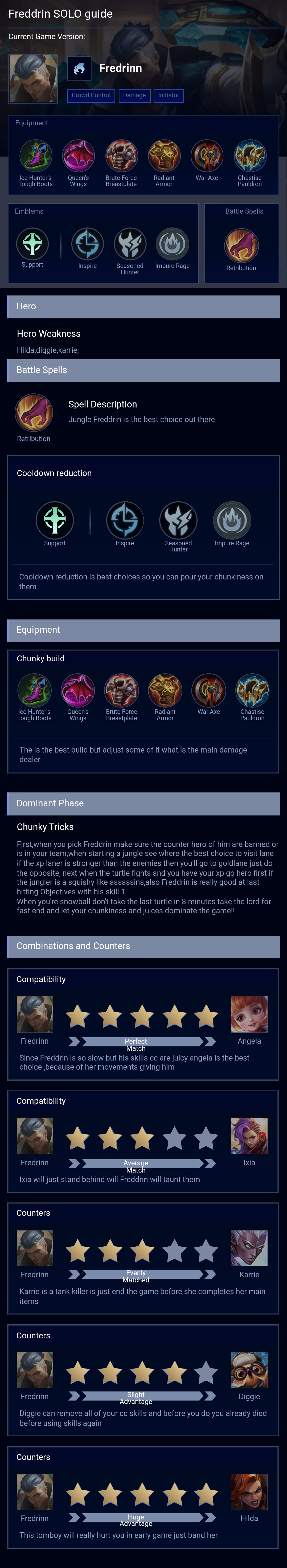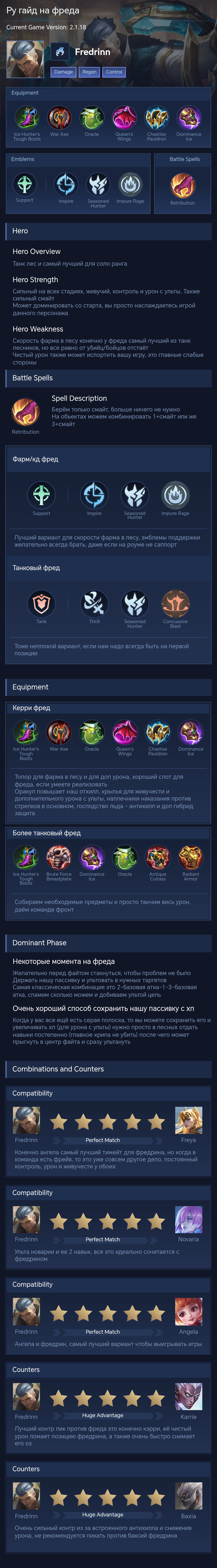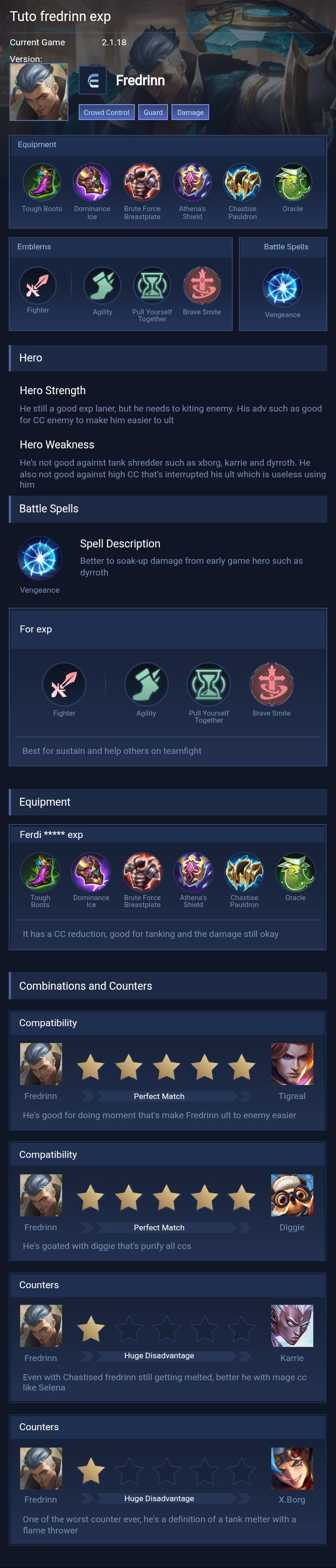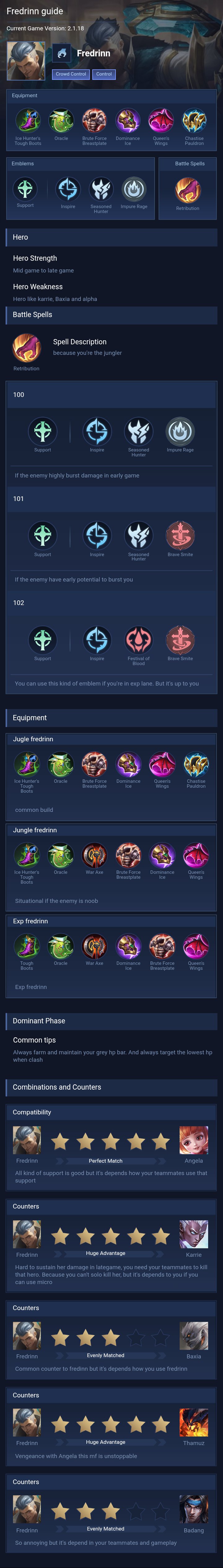 Fredrinn is a fighter hero with medium difficulty. This is a live guide — win rate, pick rate and counter data refresh every 6 hours from real ranked matches.