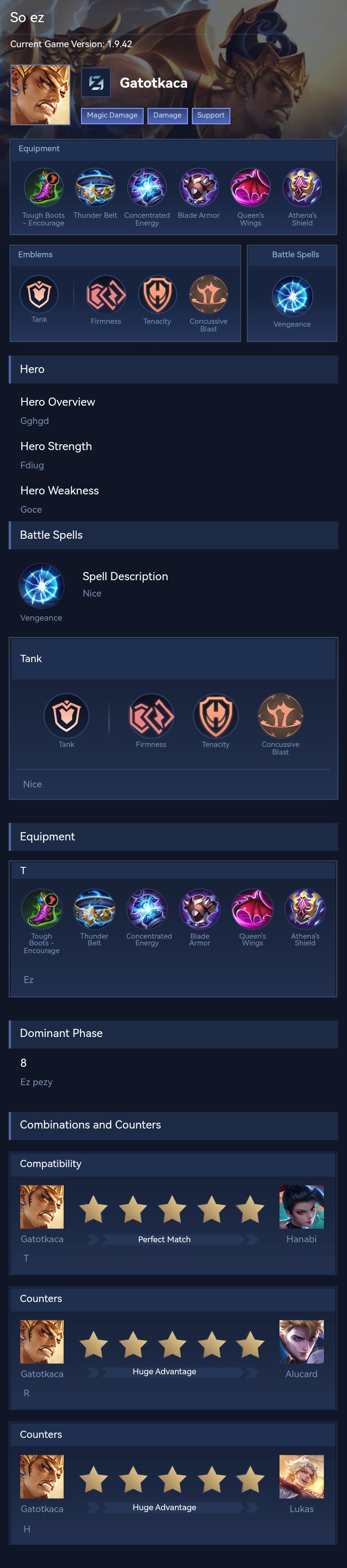 Gatotkaca is a tank hero with easy difficulty. This is a live guide — win rate, pick rate and counter data refresh every 6 hours from real ranked matches.