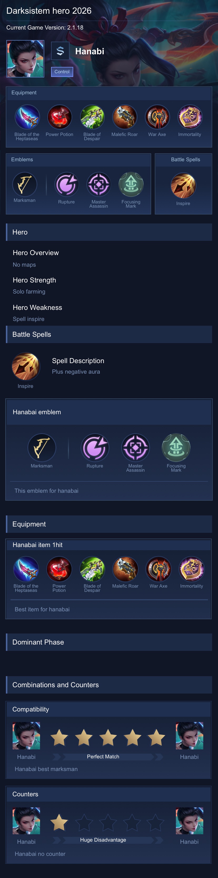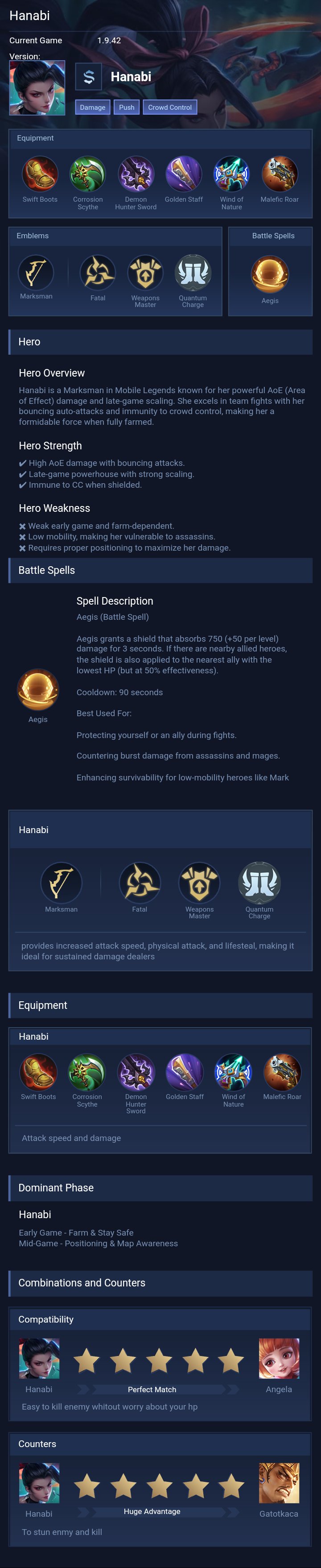Hanabi comfort build. This is for Hanabi most used build in latest season, also the build recommend if you're using Hanabi. Perfect for using when enemy doesn't have much for burst damage dealer. Still this build works well because of the malefic gun and rose gold meteor, providing long range and survivability shield.
