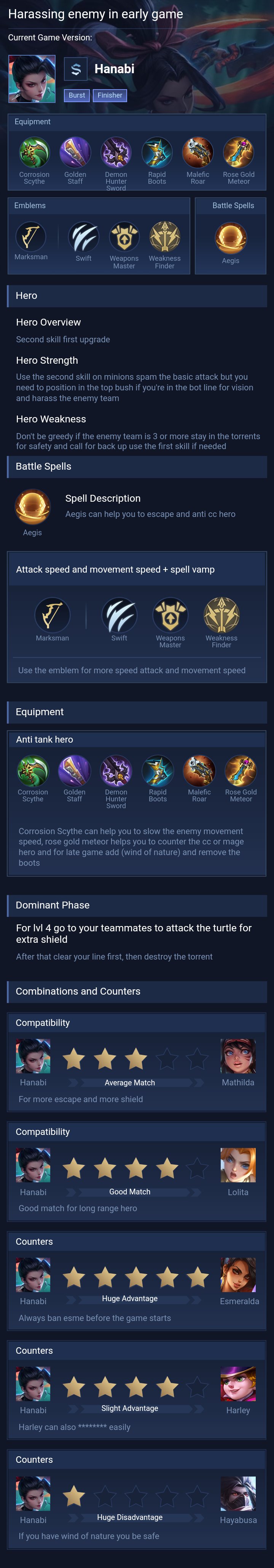 As I said, Why flicker is not good for Hanabi? Well the reason for that is Hanabi is weak in early game, yes flicker can help for potential ganks but Hanabi vulnerability is still problem. That's why i prefer aegis for Hanabi spell.