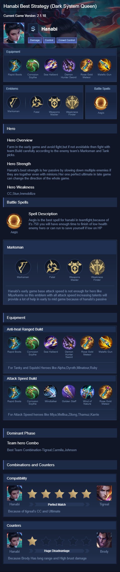 Keep Hanabi at the backline, protected by supports, and use Aegis or shields to maximize her passive immunity during team fights. Use these guide for your own prefer play style.
