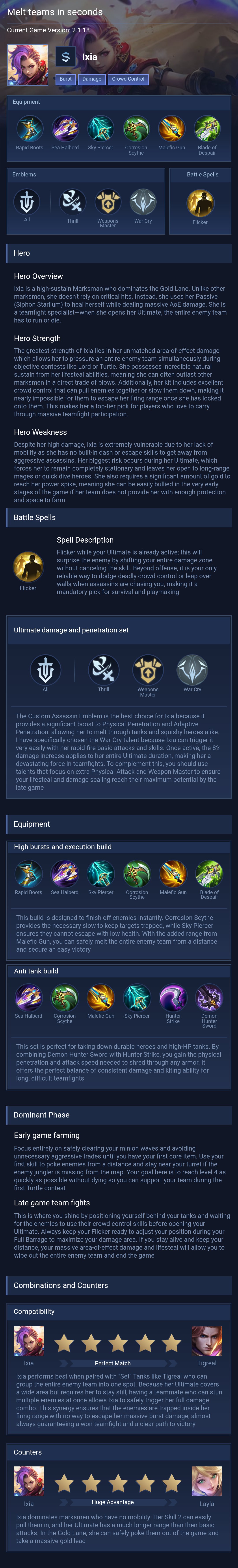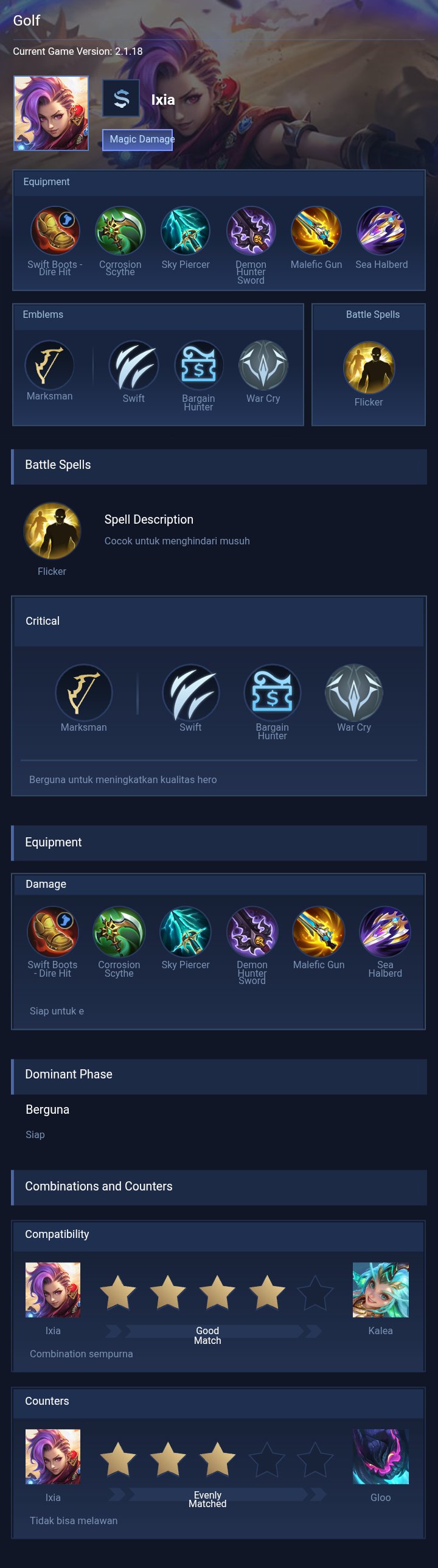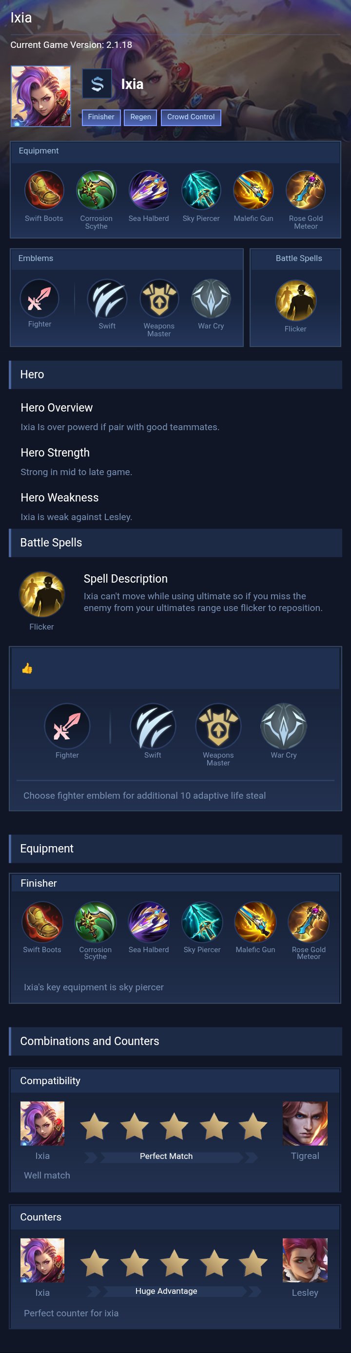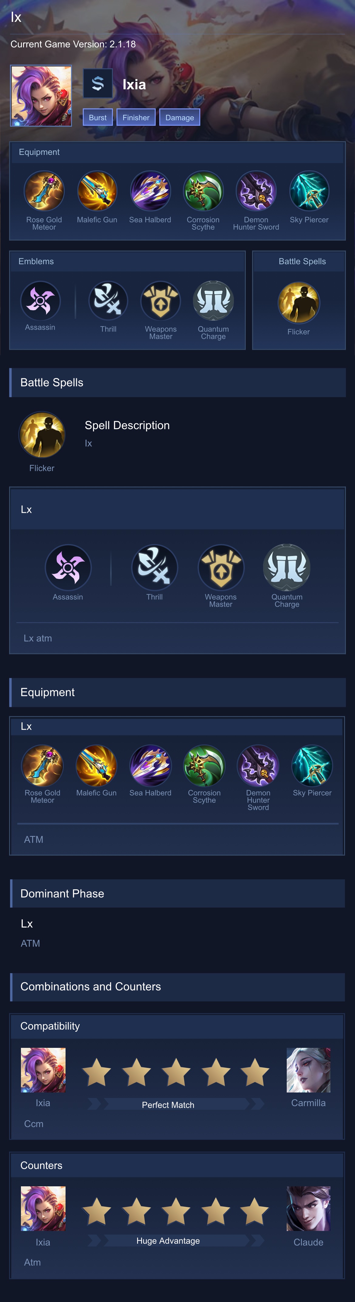 Ixia is a marksman hero with medium difficulty. This is a live guide — win rate, pick rate and counter data refresh every 6 hours from real ranked matches.
