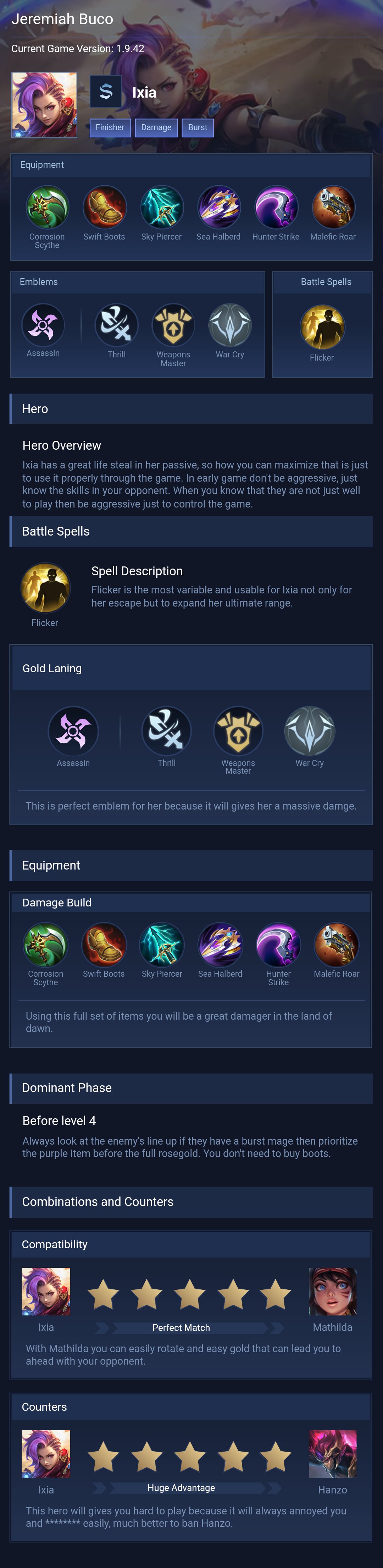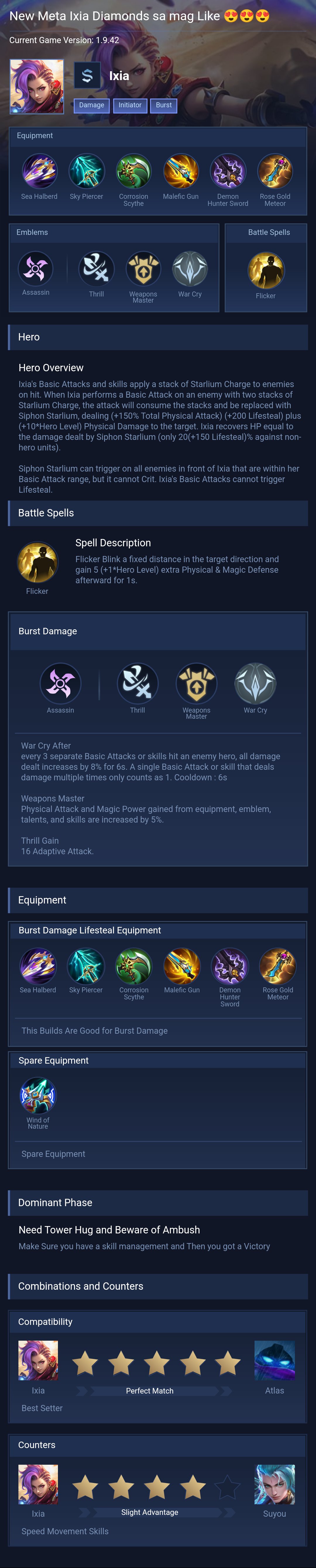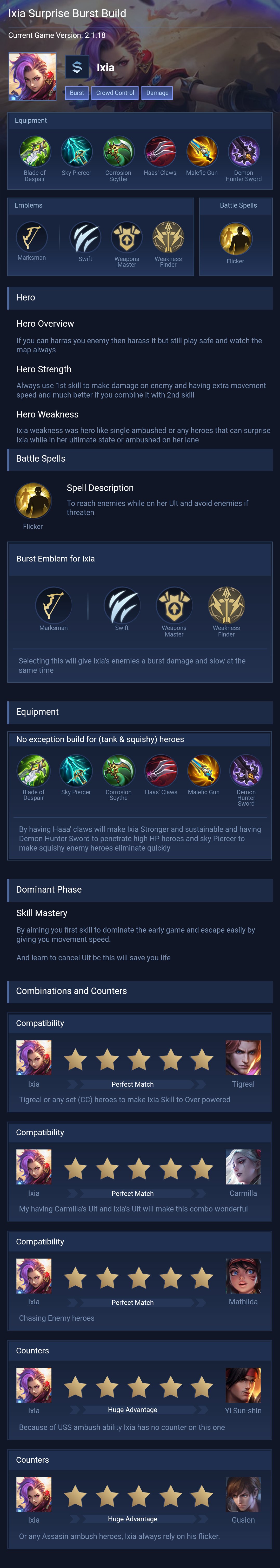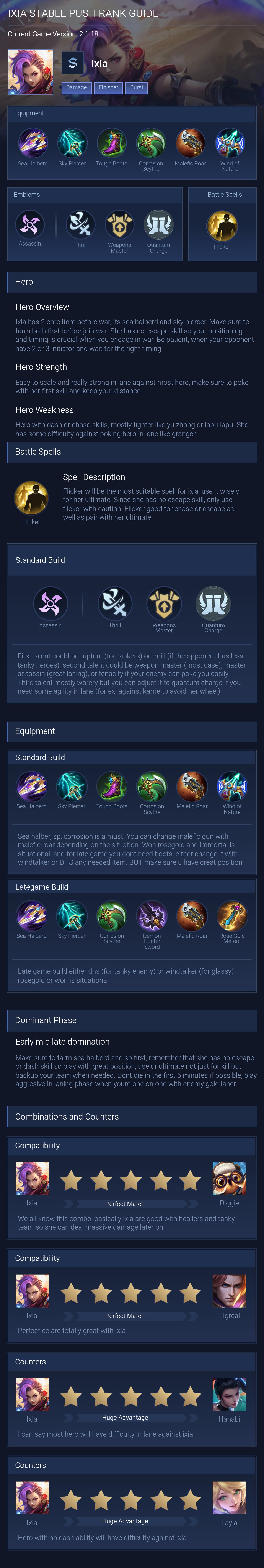 Ixia is a marksman hero with medium difficulty. This is a live guide — win rate, pick rate and counter data refresh every 6 hours from real ranked matches.