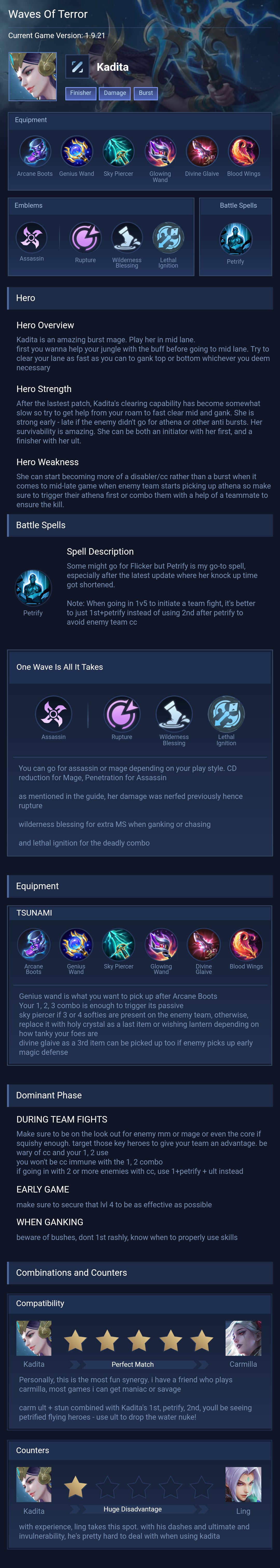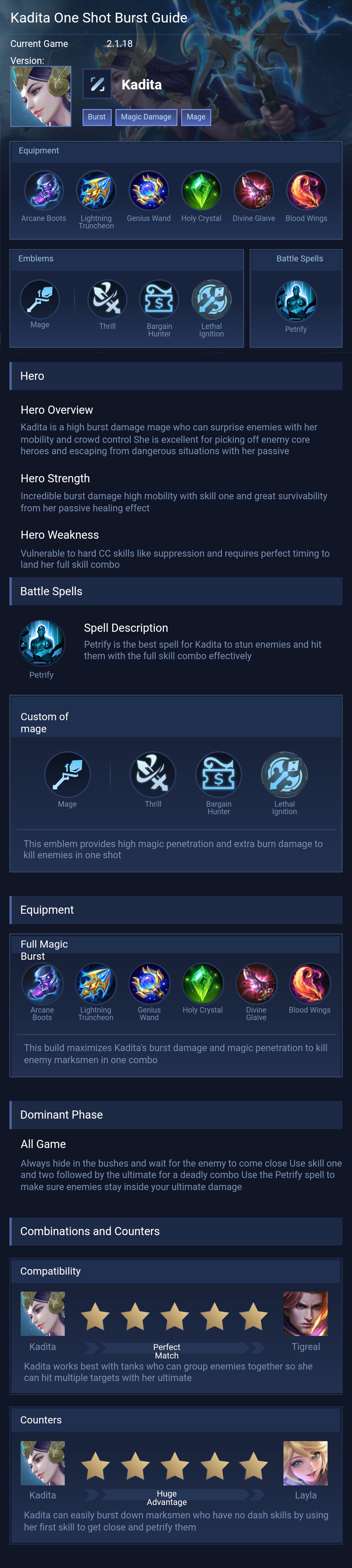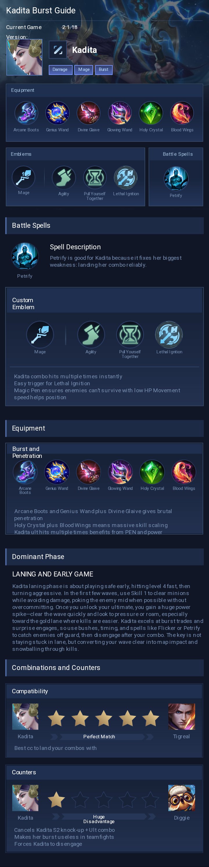 Full Magic Burst. This build maximizes Kadita's burst damage and magic penetration to kill enemy marksmen in one combo