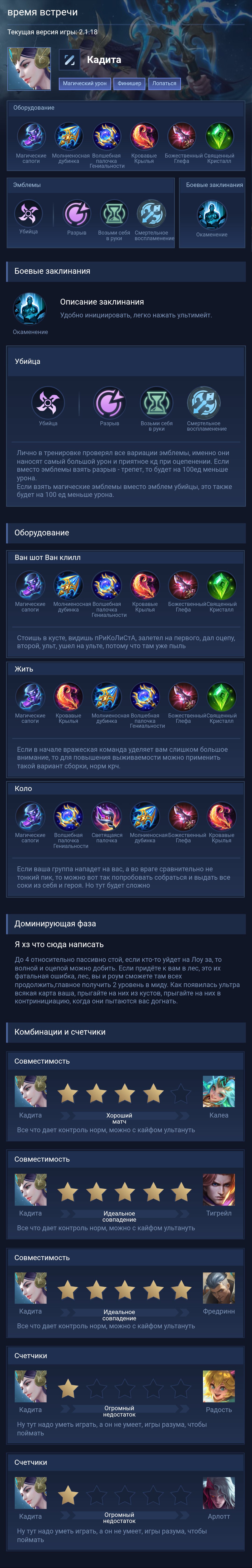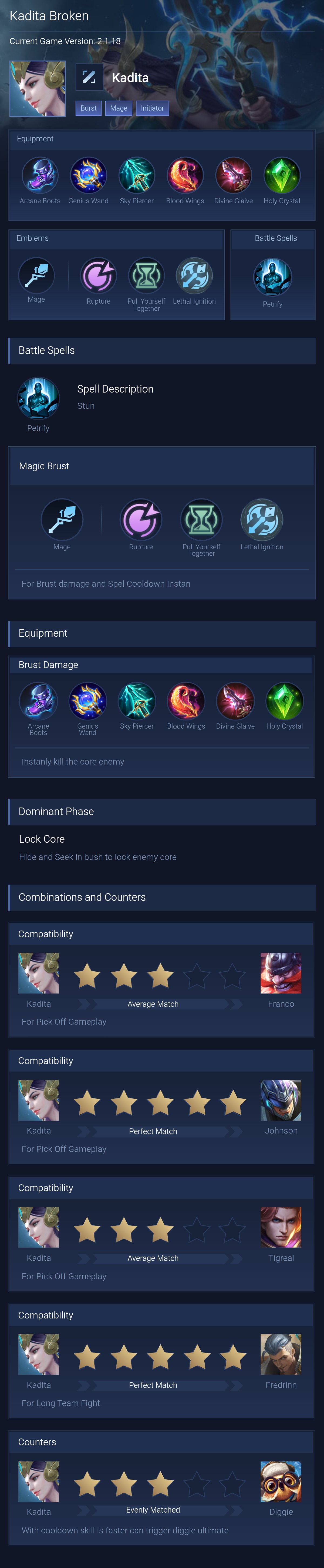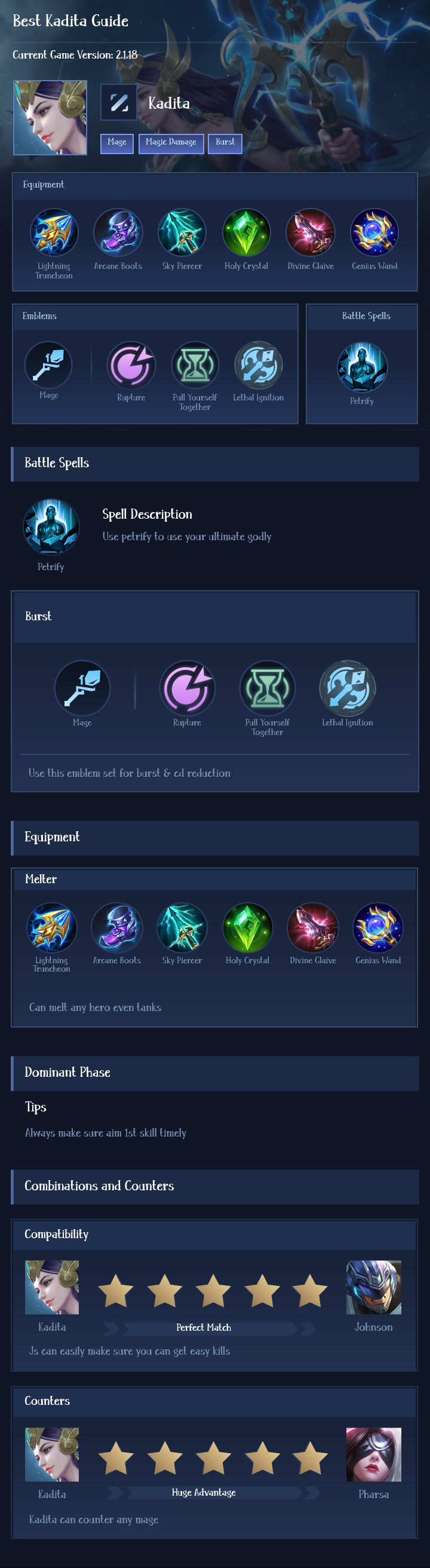 Full Magic Burst. This build maximizes Kadita's burst damage and magic penetration to kill enemy marksmen in one combo