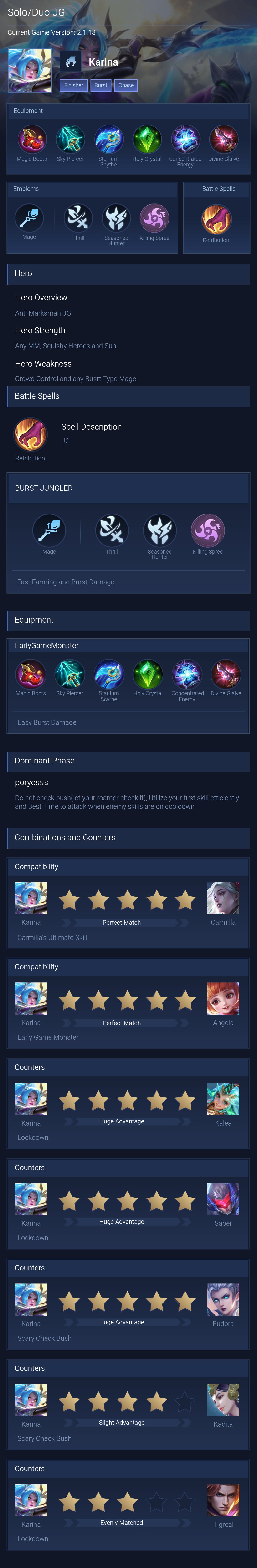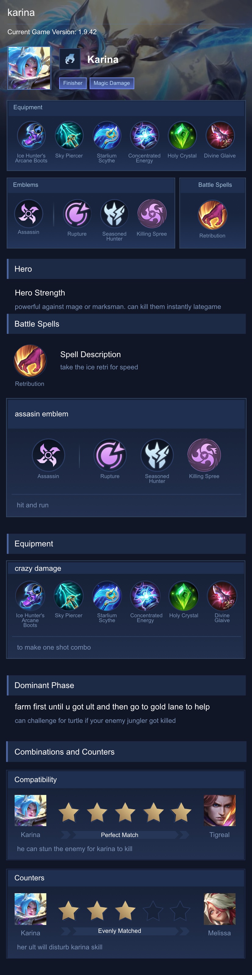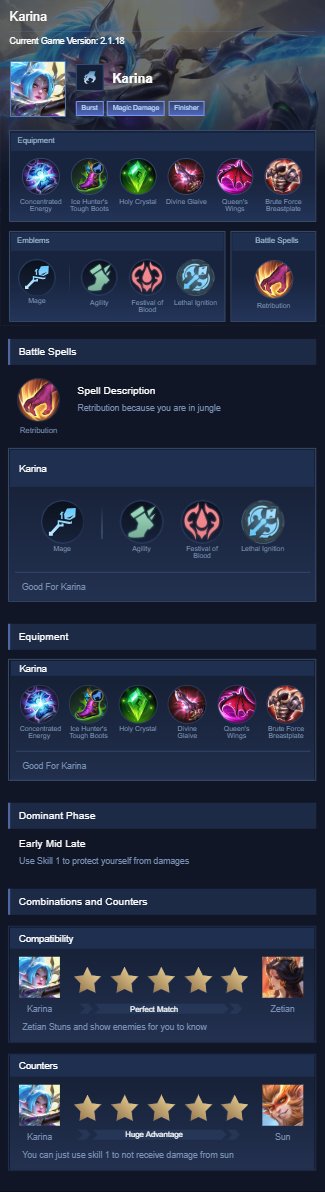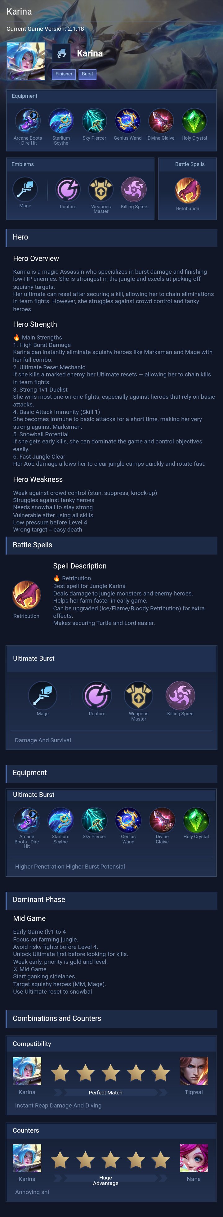 Karina is a assassin hero with medium difficulty. This is a live guide — win rate, pick rate and counter data refresh every 6 hours from real ranked matches.