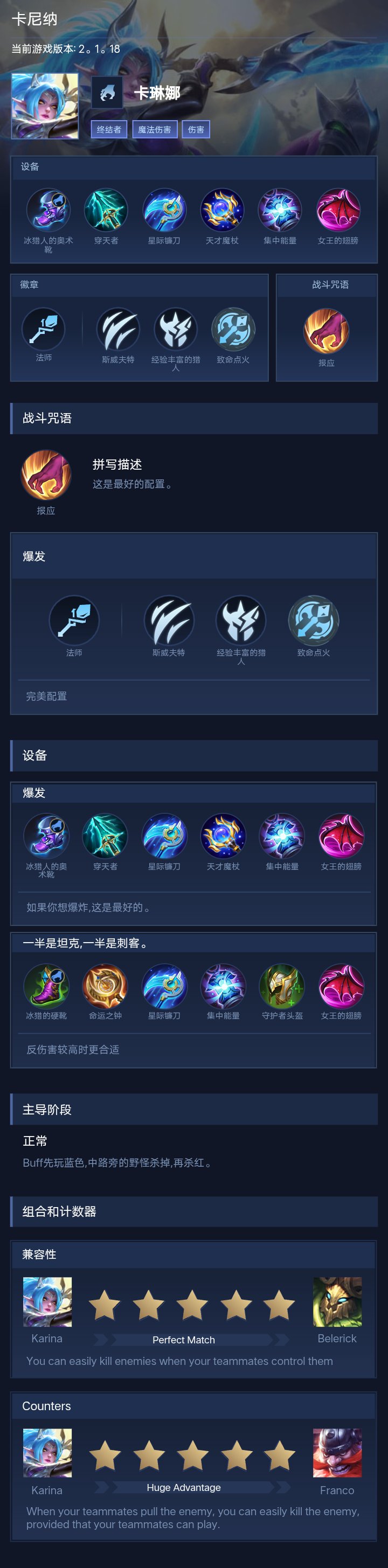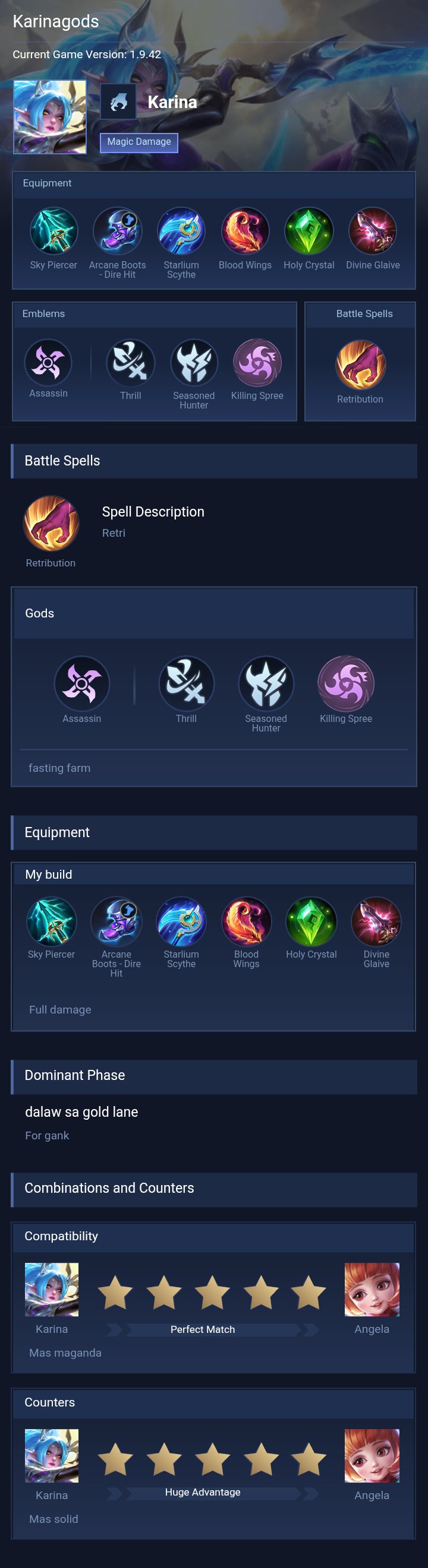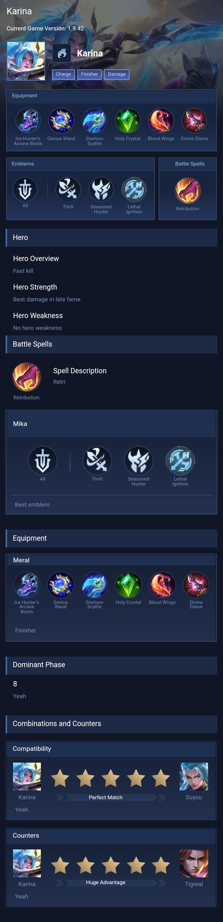 Karina is a assassin hero with medium difficulty. This is a live guide — win rate, pick rate and counter data refresh every 6 hours from real ranked matches.
