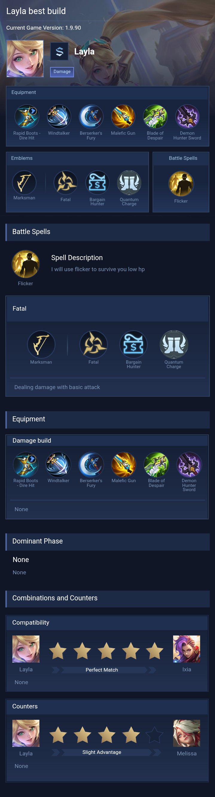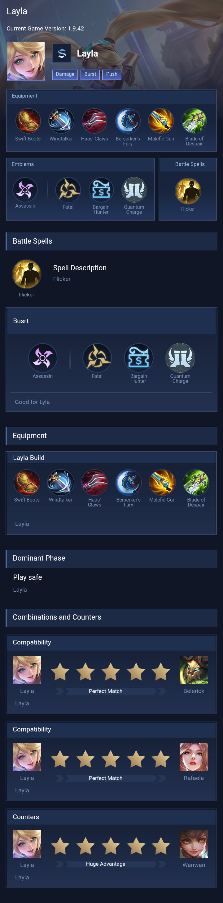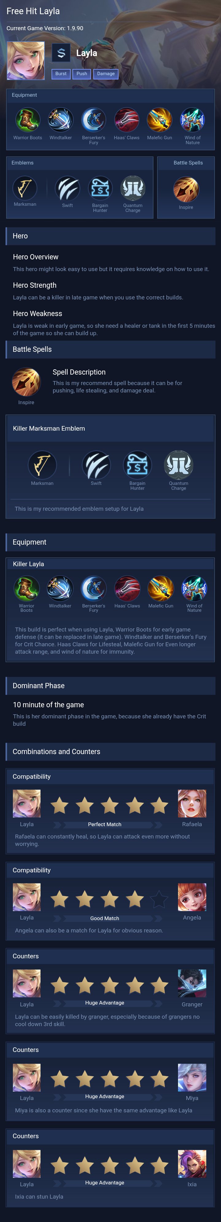 Killer Layla. This build is perfect when using Layla, Warrior Boots for early game defense (it can be replaced in late game). Windtalker and Berserker's Fury for Crit Chance. Haas Claws for Lifesteal, Malefic Gun for Even longer attack range, and wind of nature for immunity.