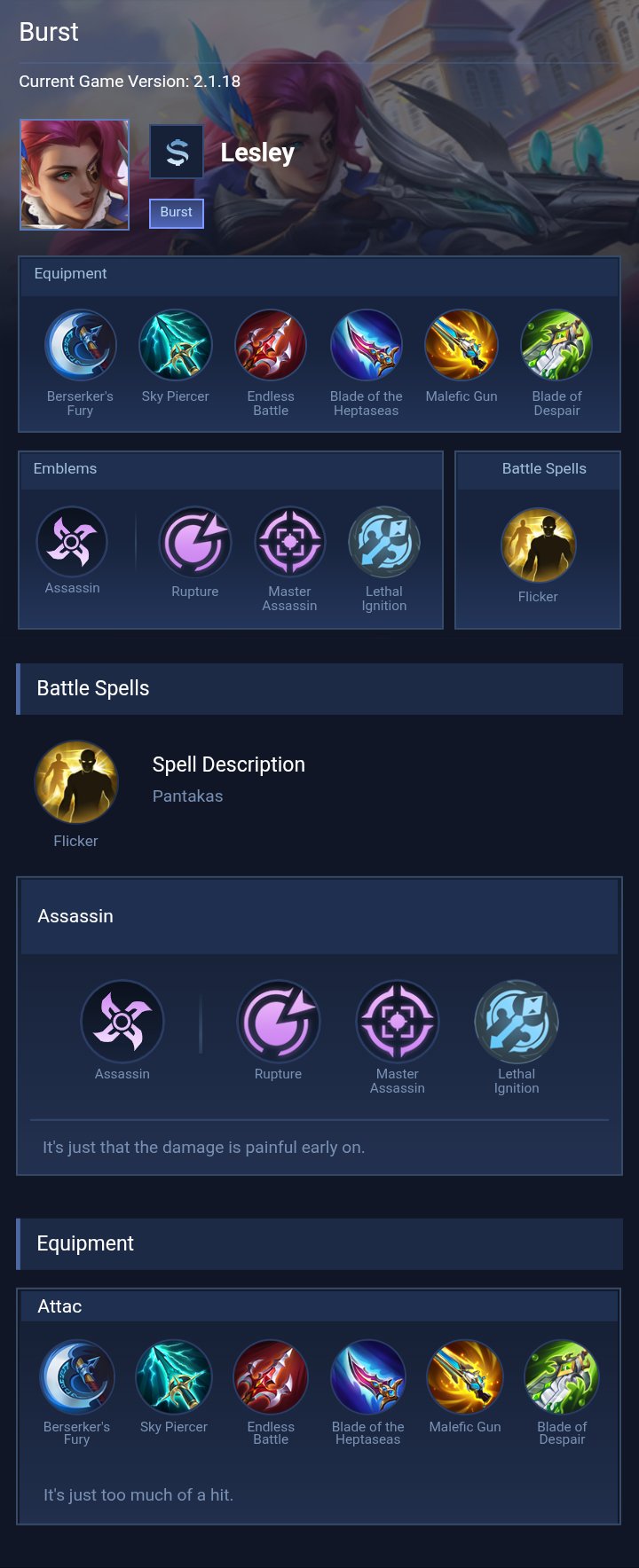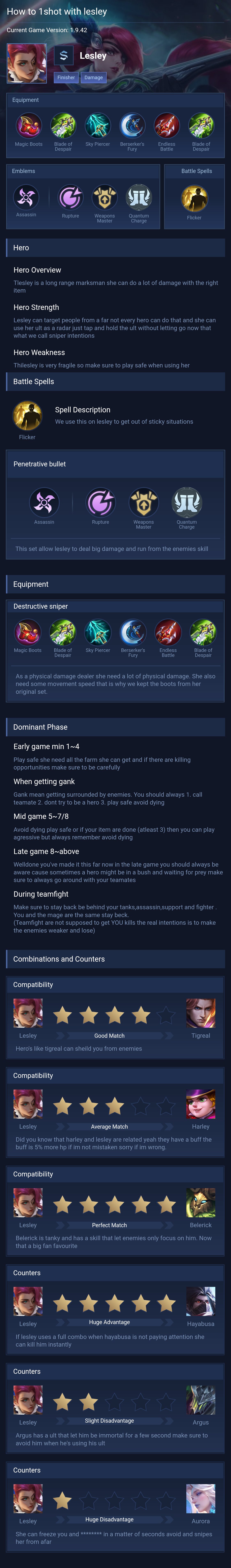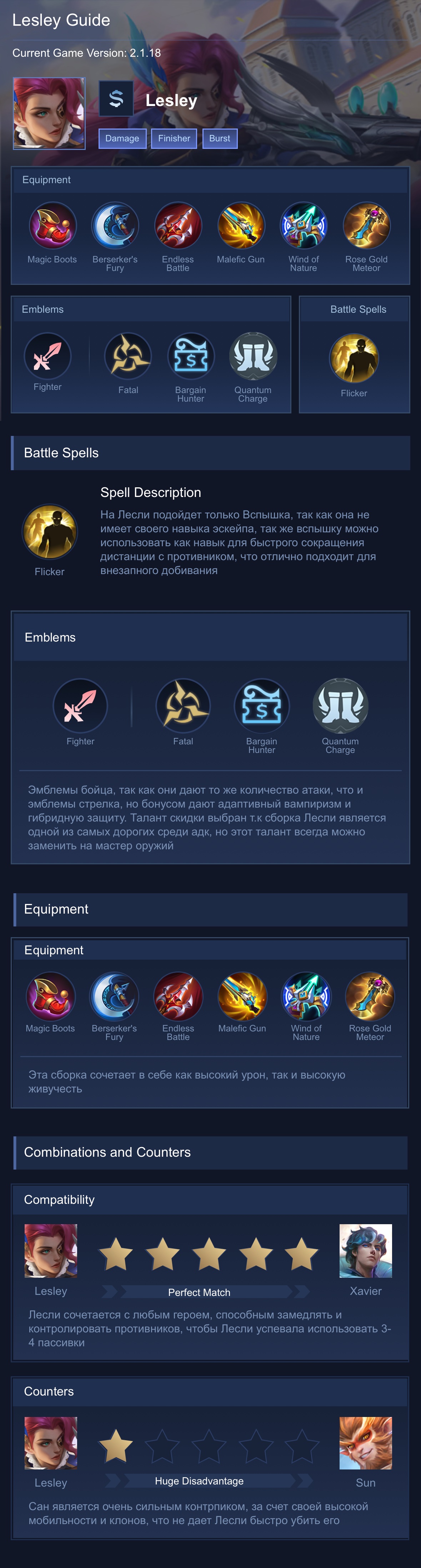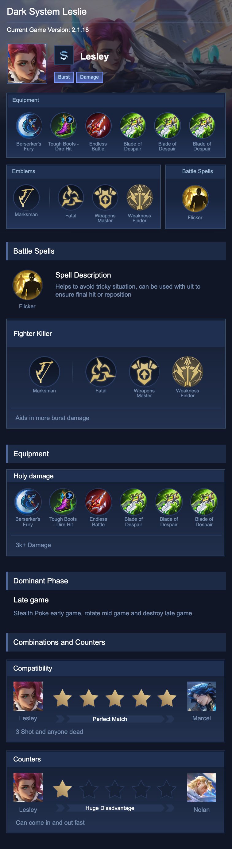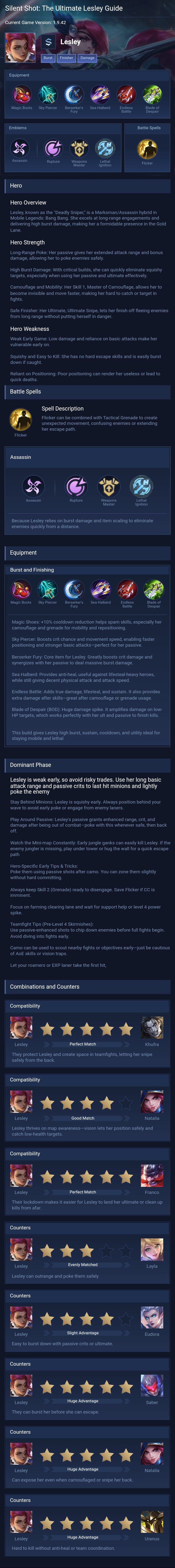 Lesley is a marksman hero with medium difficulty. This is a live guide — win rate, pick rate and counter data refresh every 6 hours from real ranked matches.