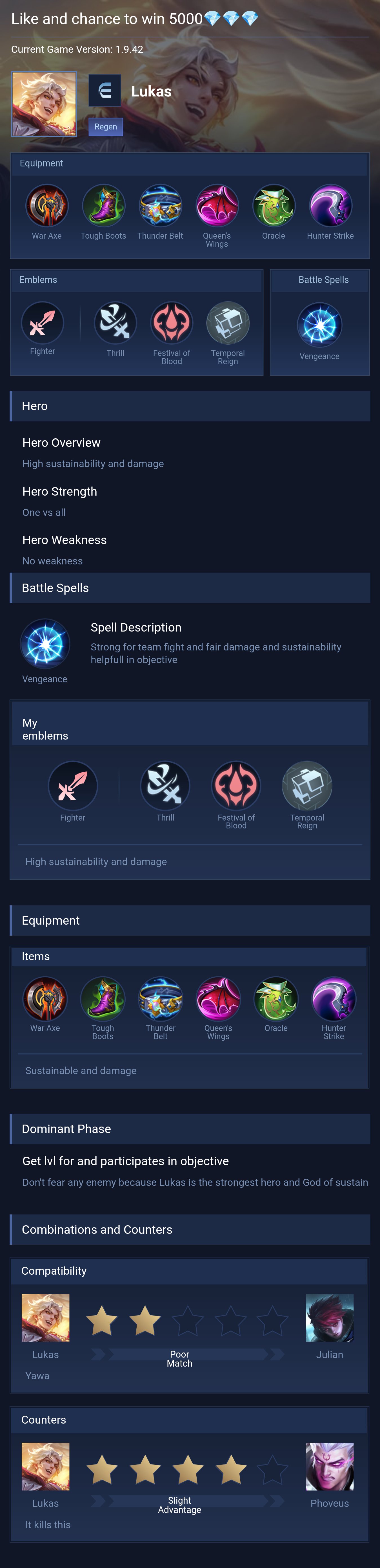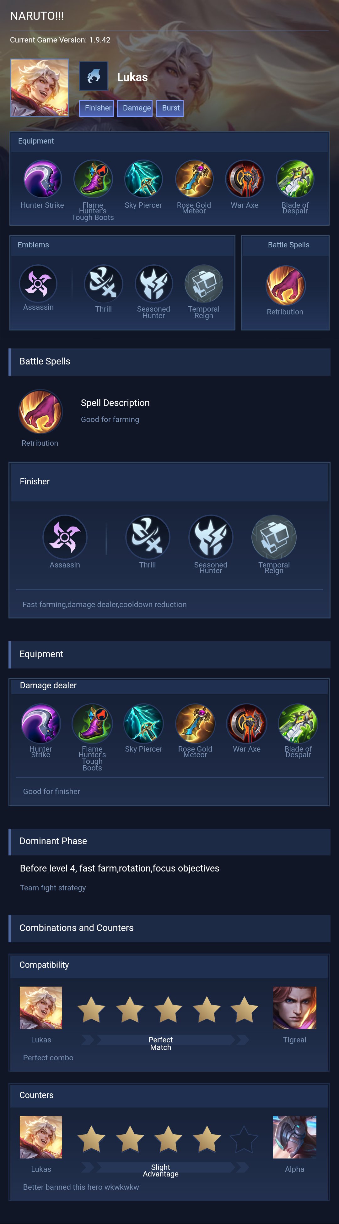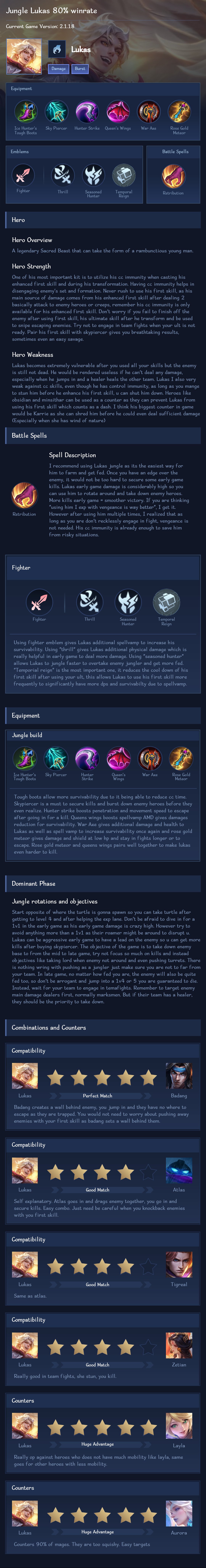 Lukas is a fighter hero with easy difficulty. This is a live guide — win rate, pick rate and counter data refresh every 6 hours from real ranked matches.