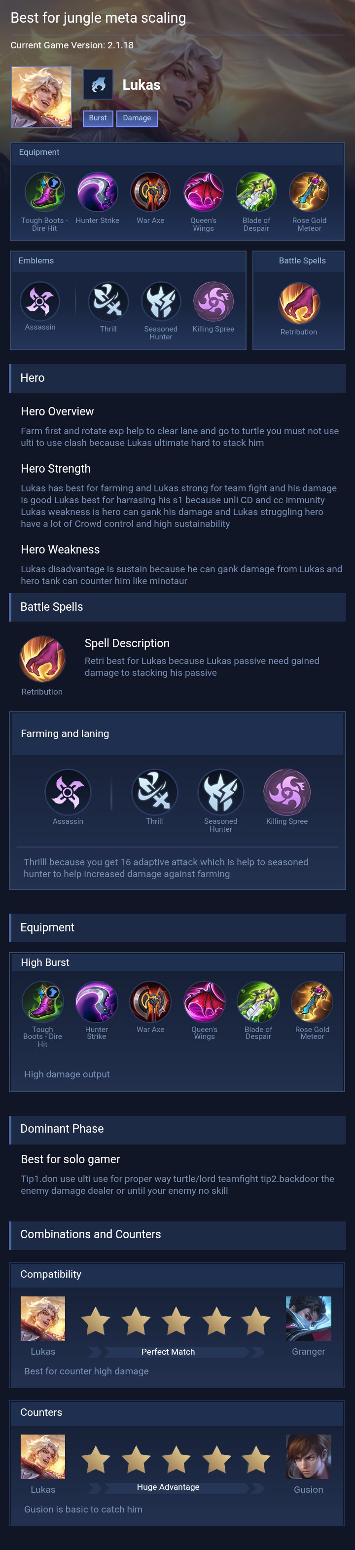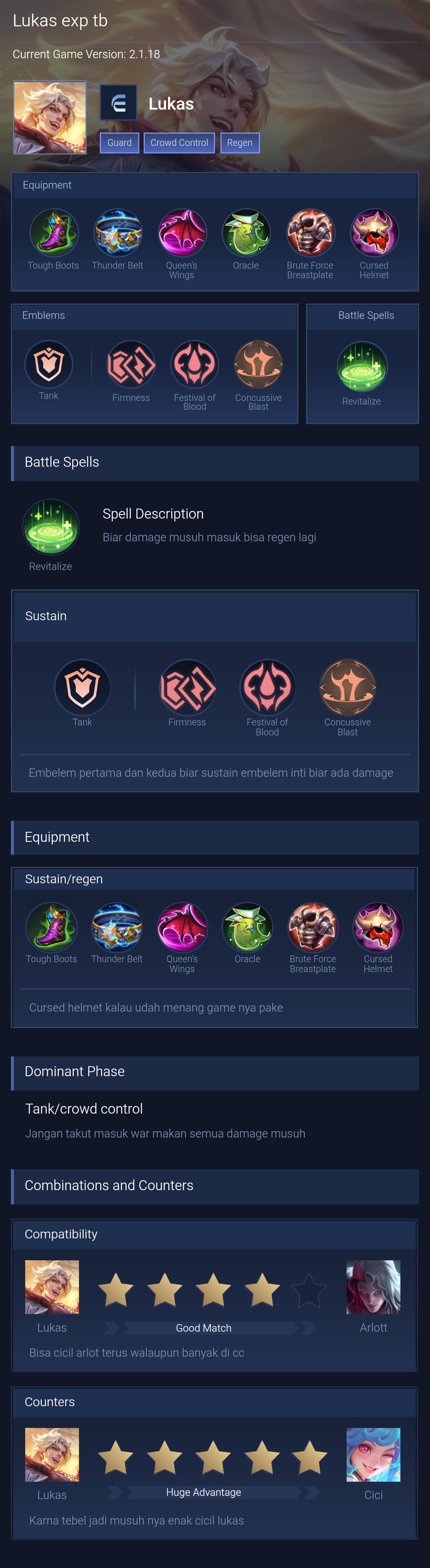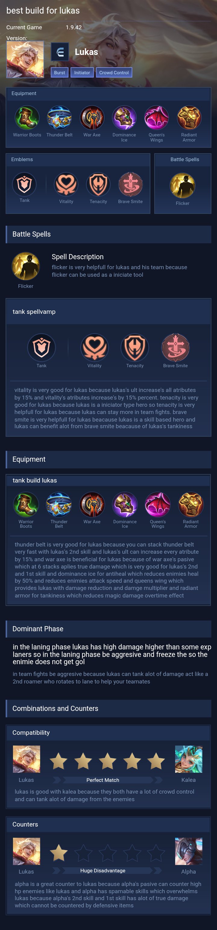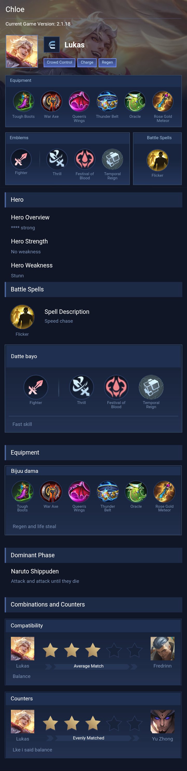 Lukas is a fighter hero with easy difficulty. This is a live guide — win rate, pick rate and counter data refresh every 6 hours from real ranked matches.