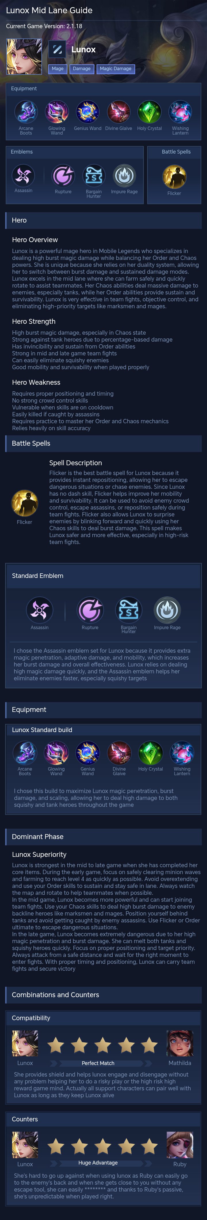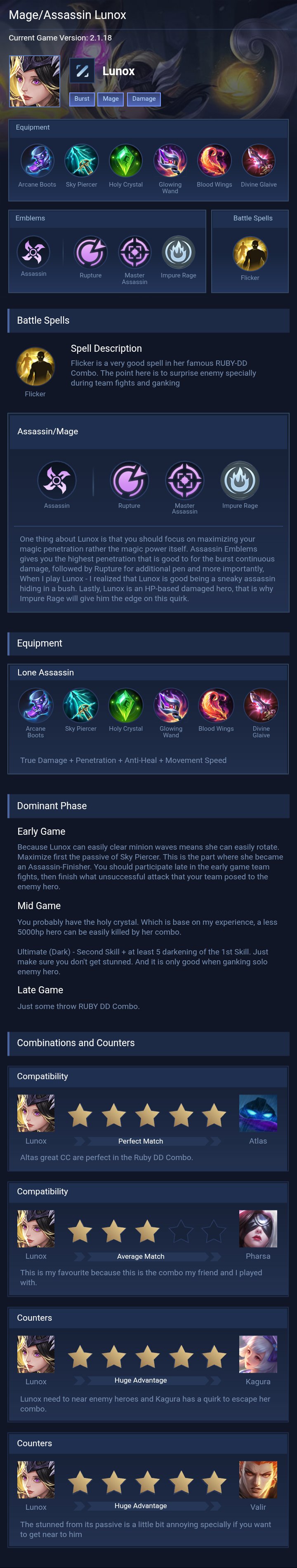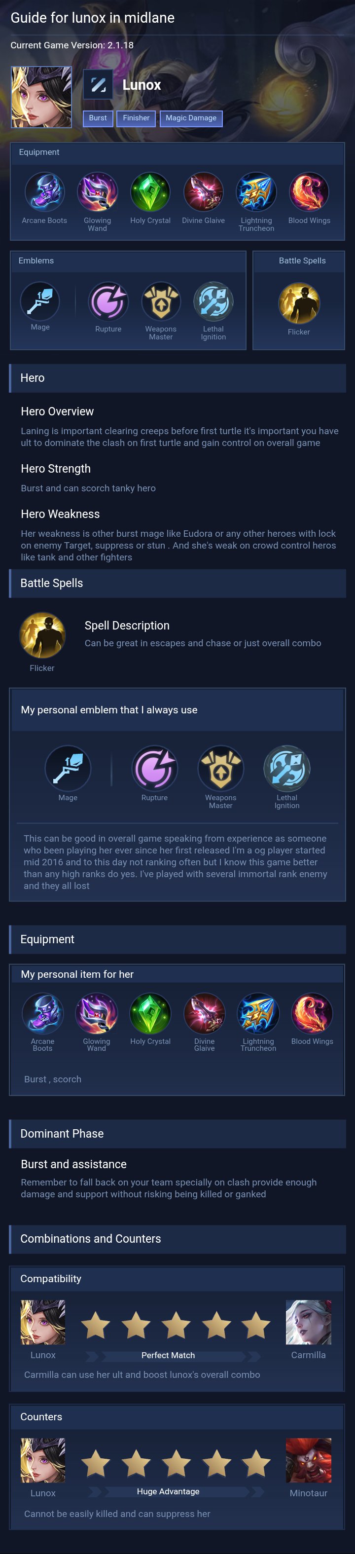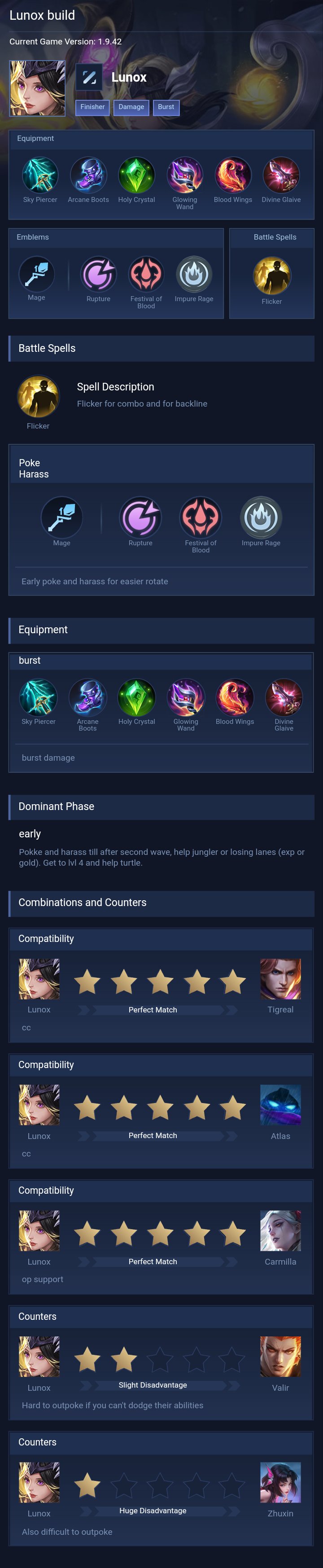 In the laning phase, use Lunox's 3rd Skill to slow the opponent and her 2nd Skill to poke. When she takes damage, use her 1st Skill to heal back up.