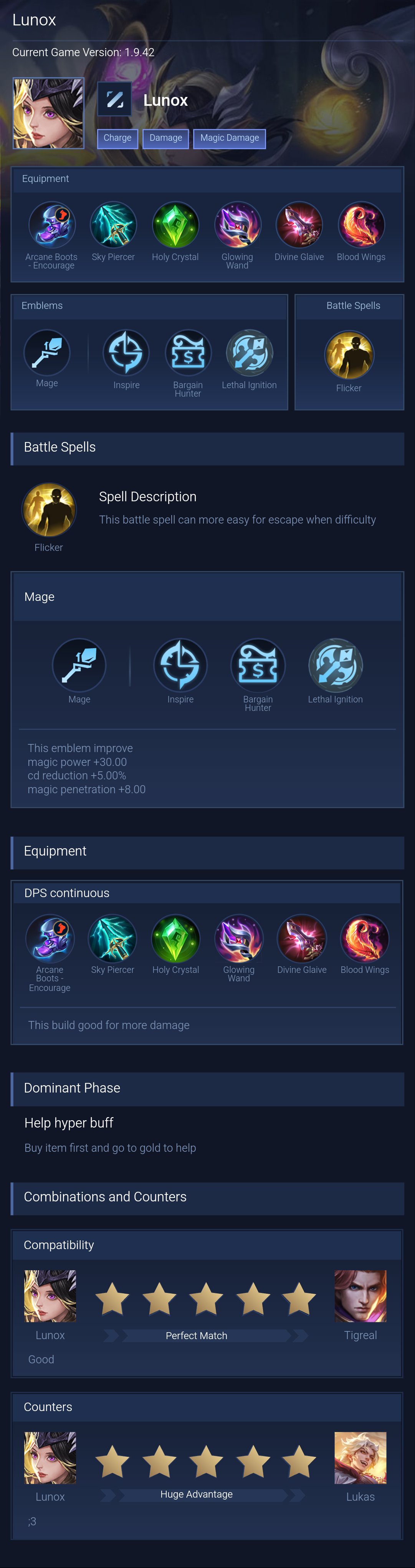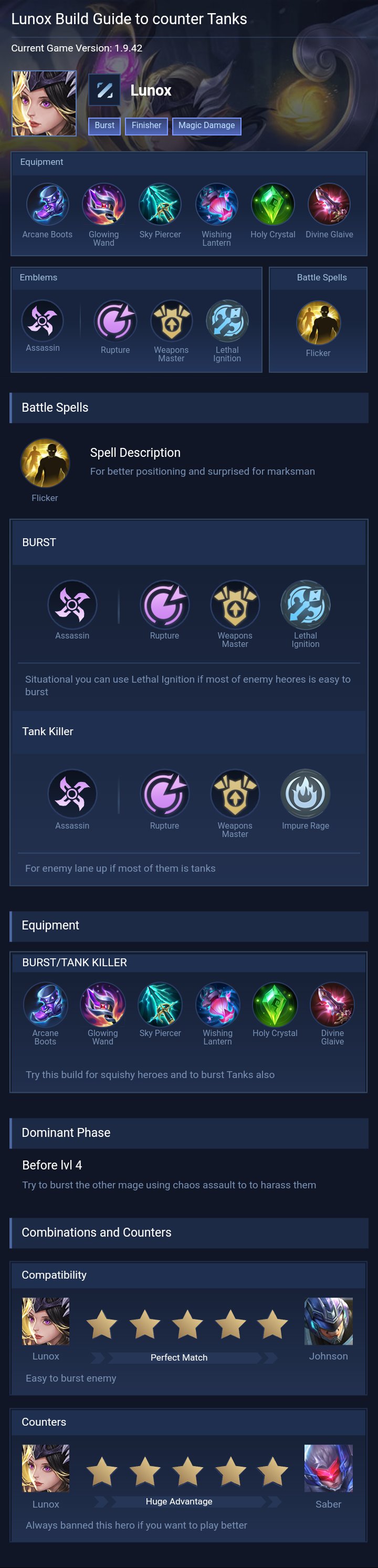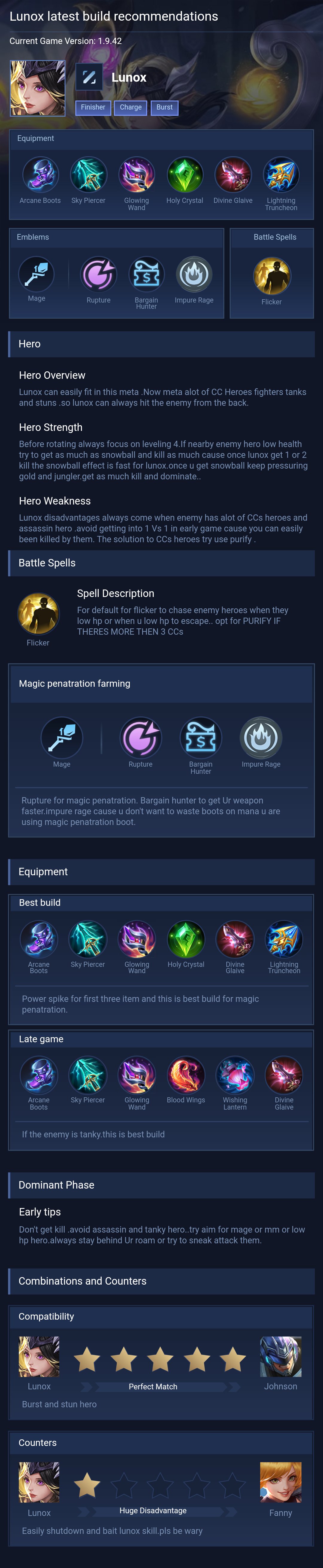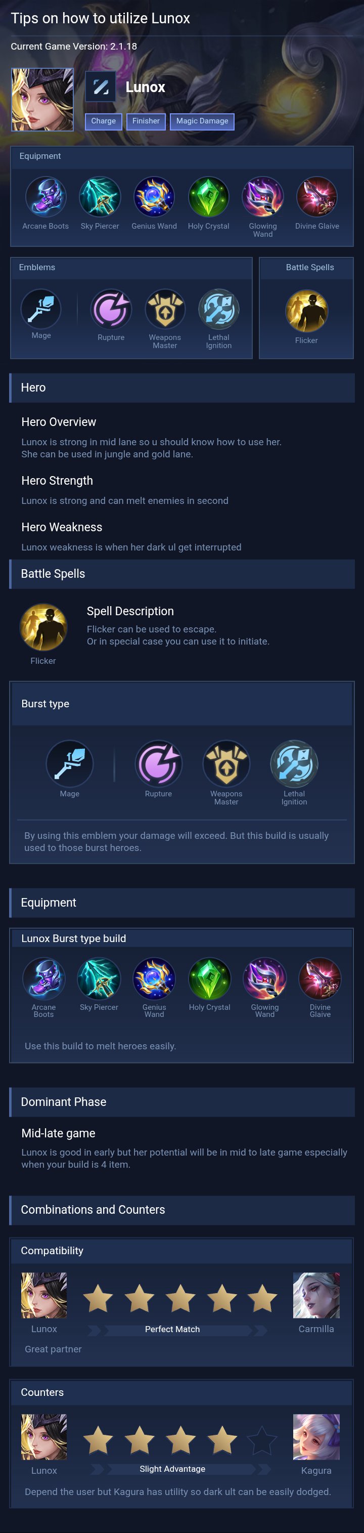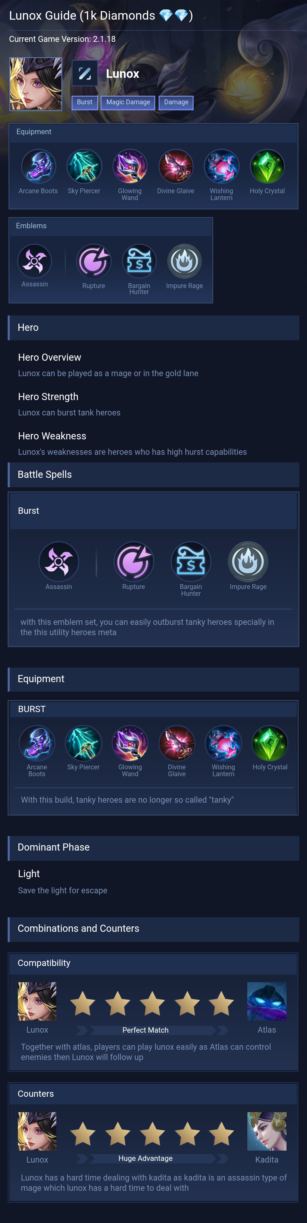 In the laning phase, use Lunox's 3rd Skill to slow the opponent and her 2nd Skill to poke. When she takes damage, use her 1st Skill to heal back up.