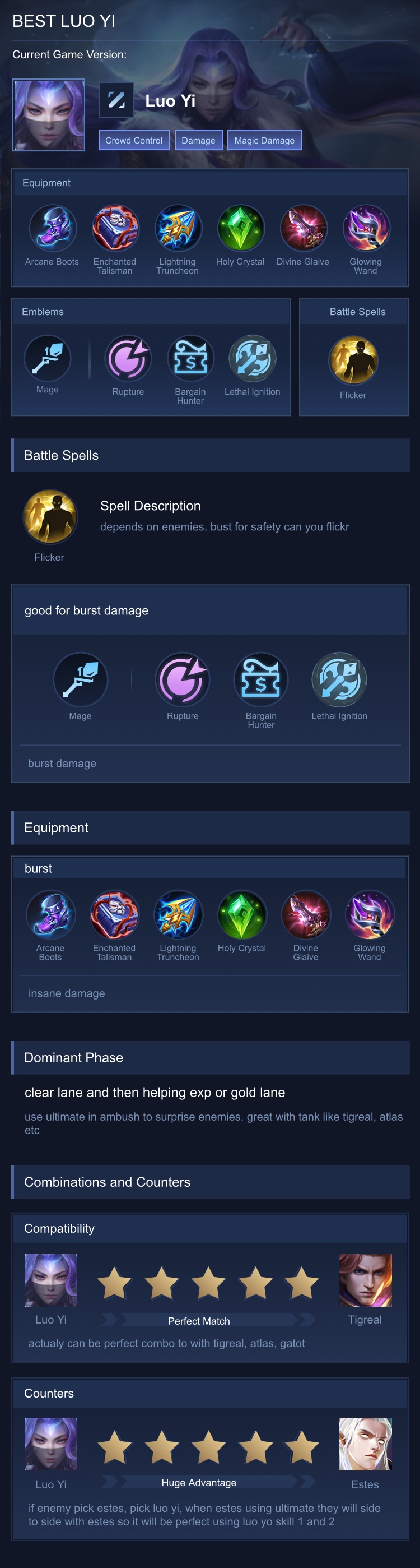Battle Spell. The flicker is the best battle spell for Luo yi because Luo yi has no dash skill so she can be easily targeted by assassin hero's