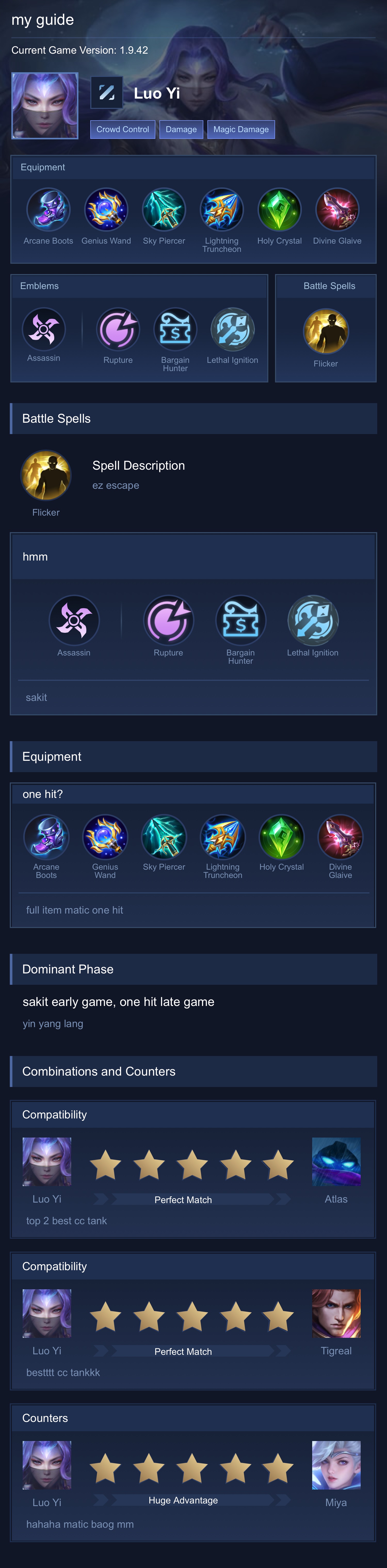 One combo build. I choose this battle equipment for luo yo because it can create more massive damage that can really to a one combo hit