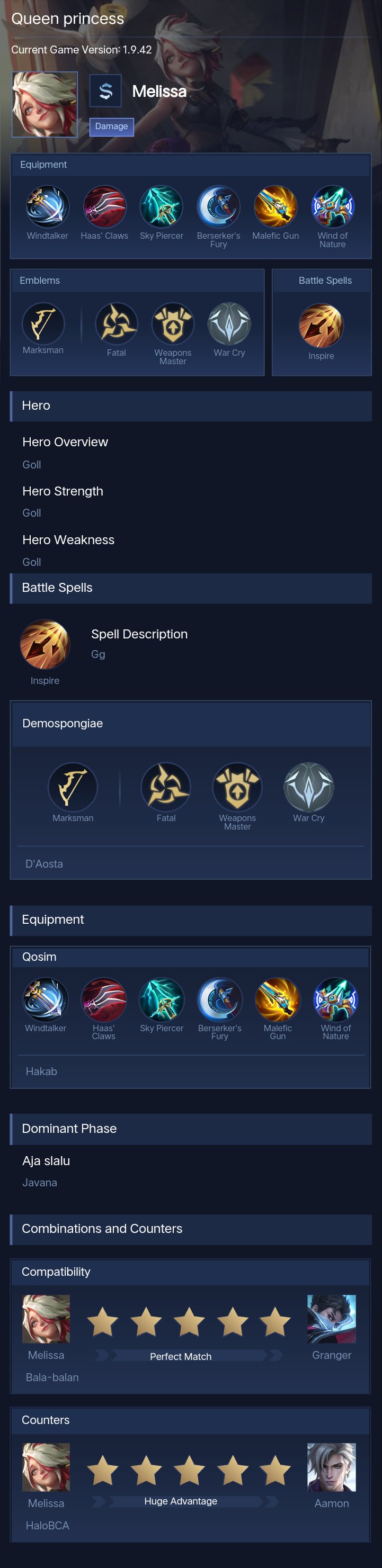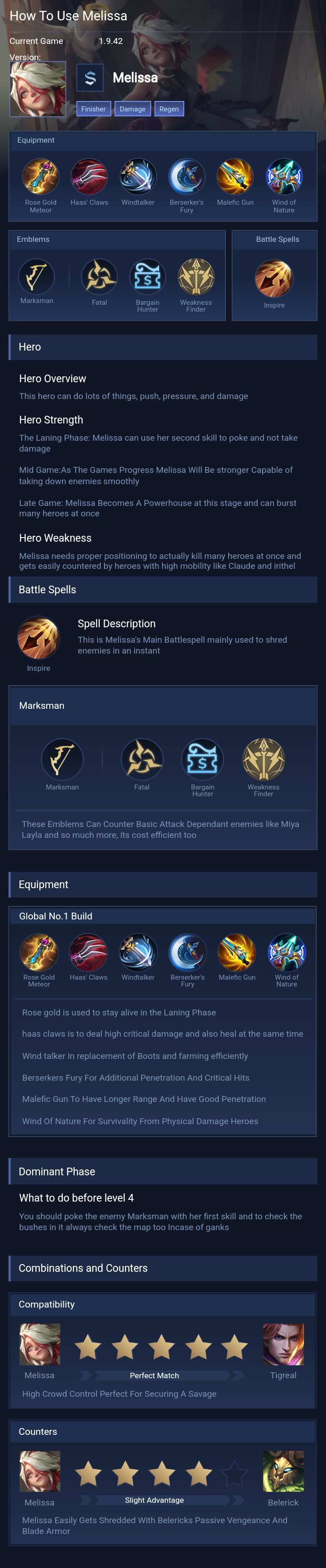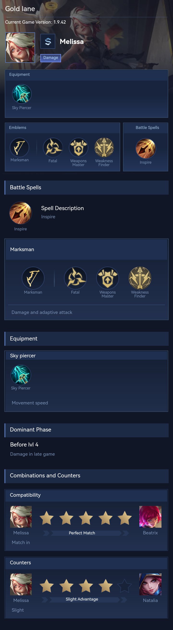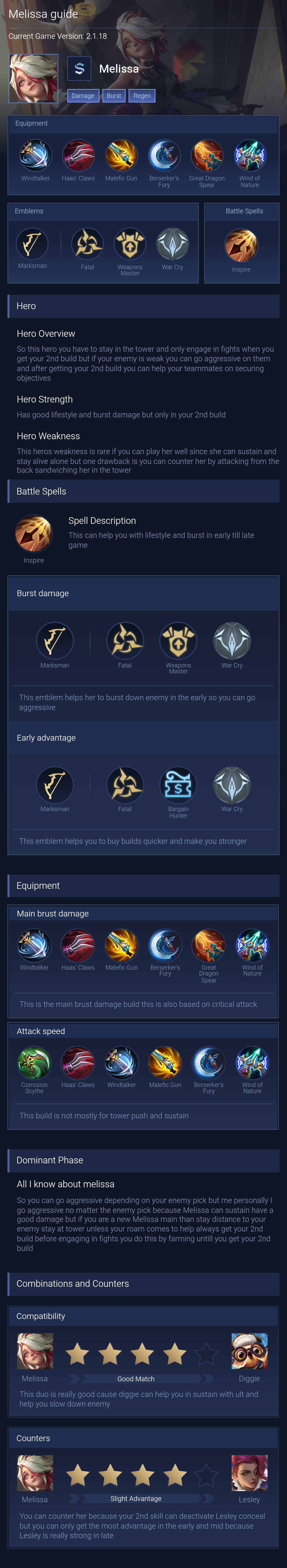 Melissa is a marksman hero with medium difficulty. This is a live guide — win rate, pick rate and counter data refresh every 6 hours from real ranked matches.