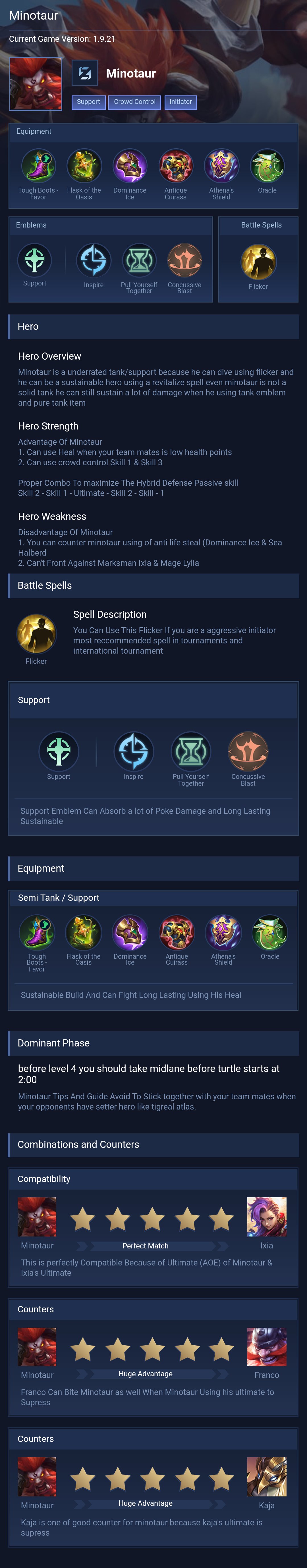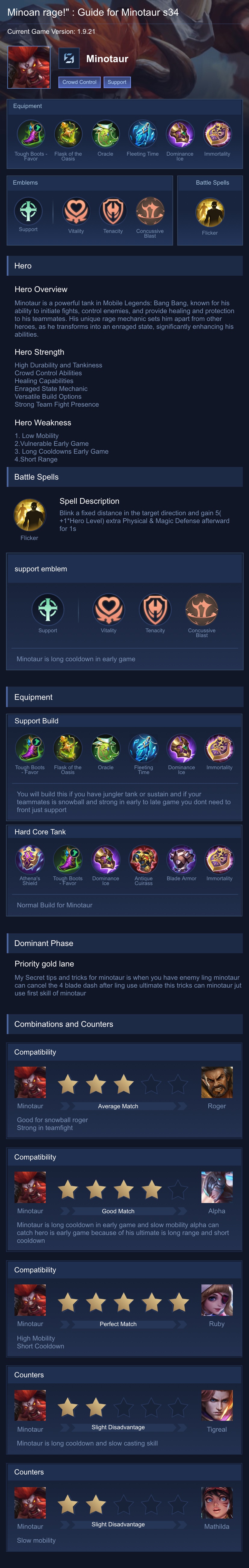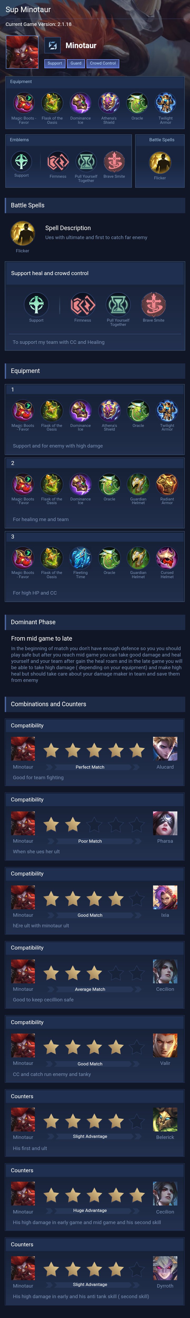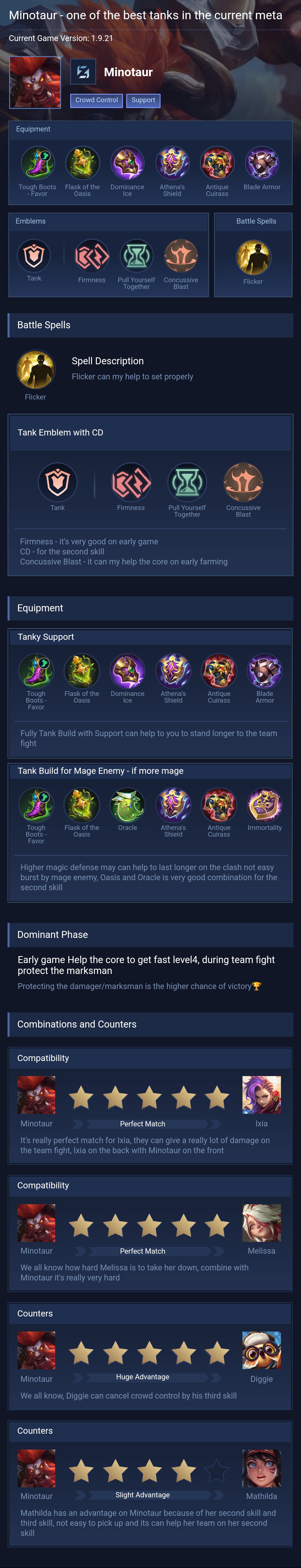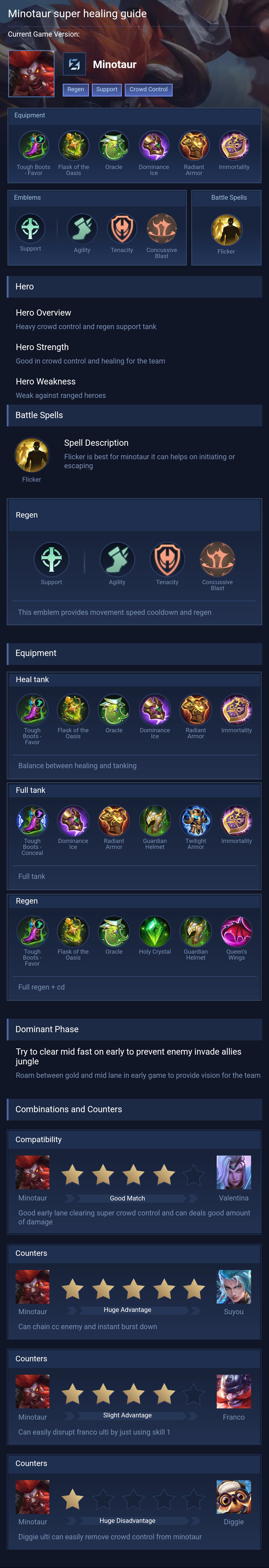 Minotaur is a tank hero with medium difficulty. This is a live guide — win rate, pick rate and counter data refresh every 6 hours from real ranked matches.
