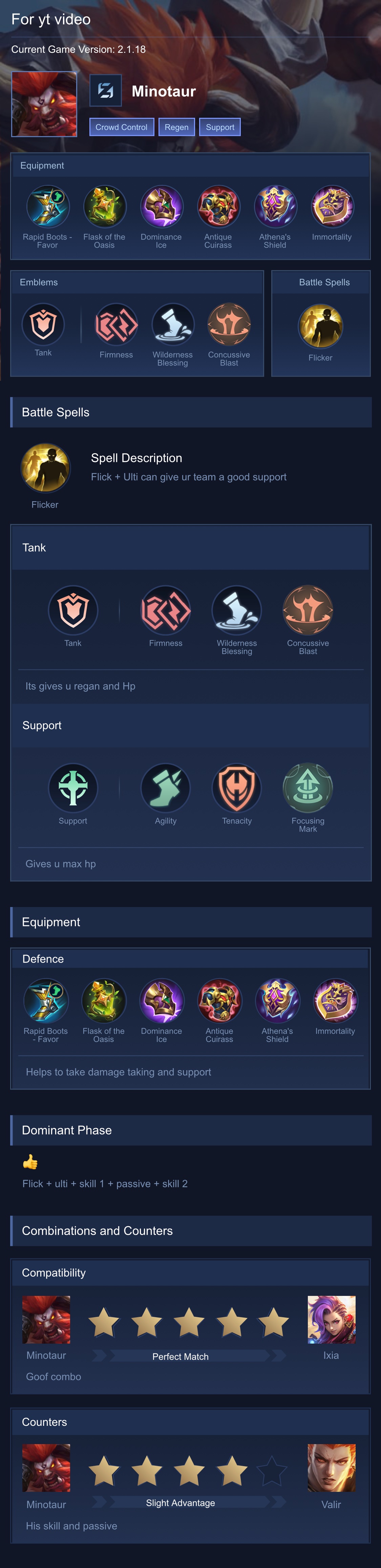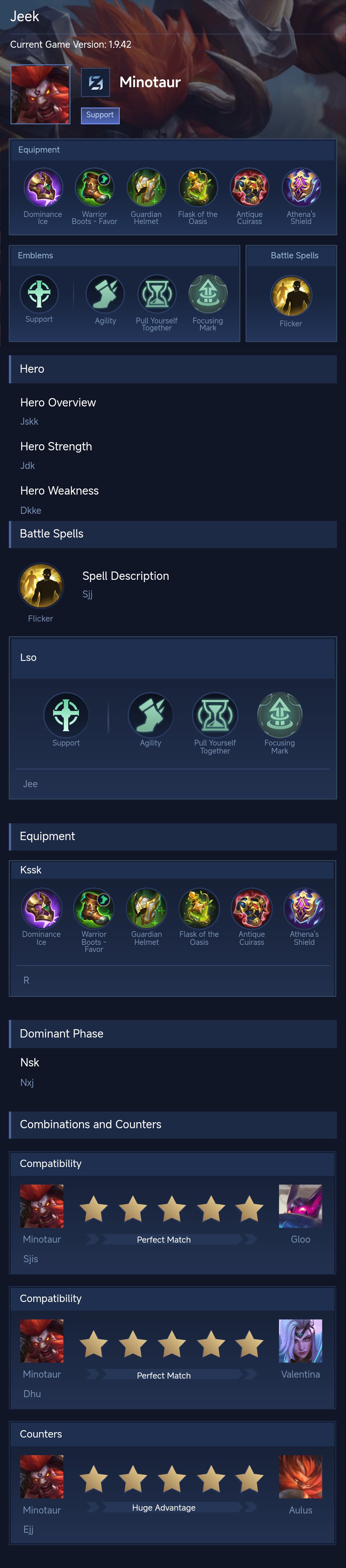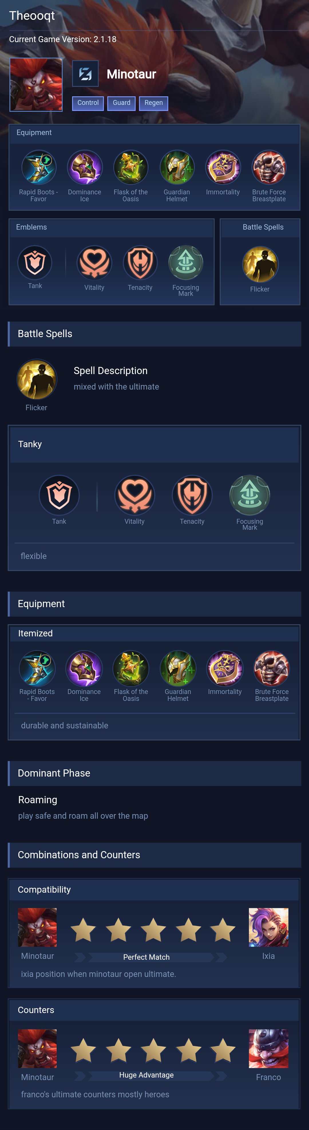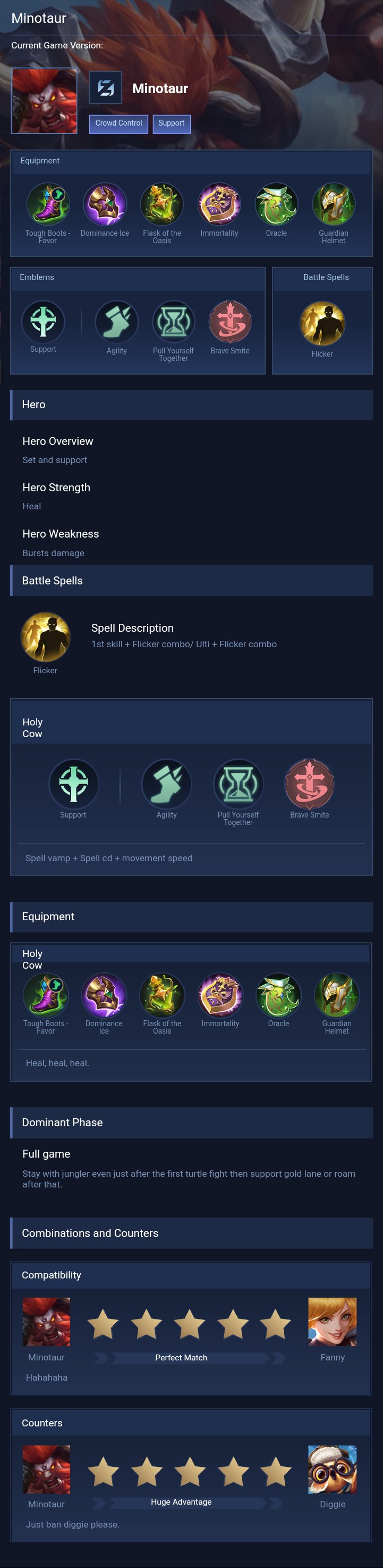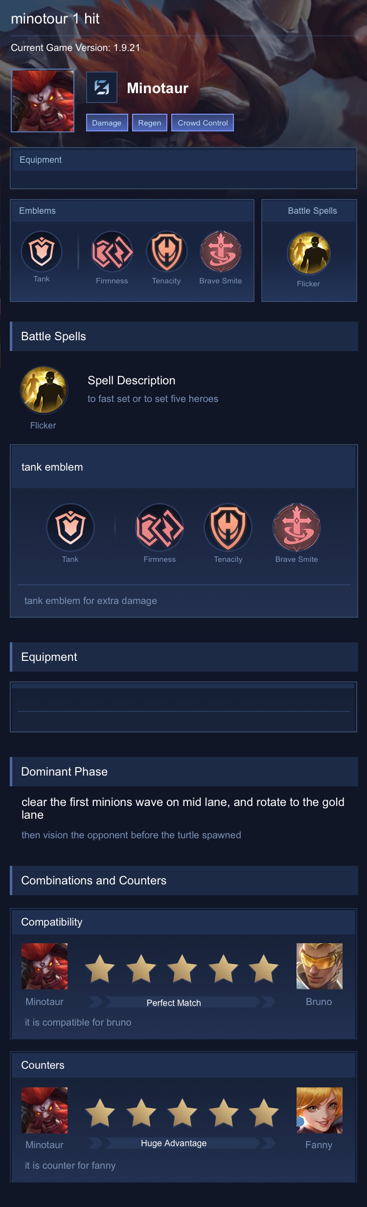 Minotaur is a tank hero with medium difficulty. This is a live guide — win rate, pick rate and counter data refresh every 6 hours from real ranked matches.