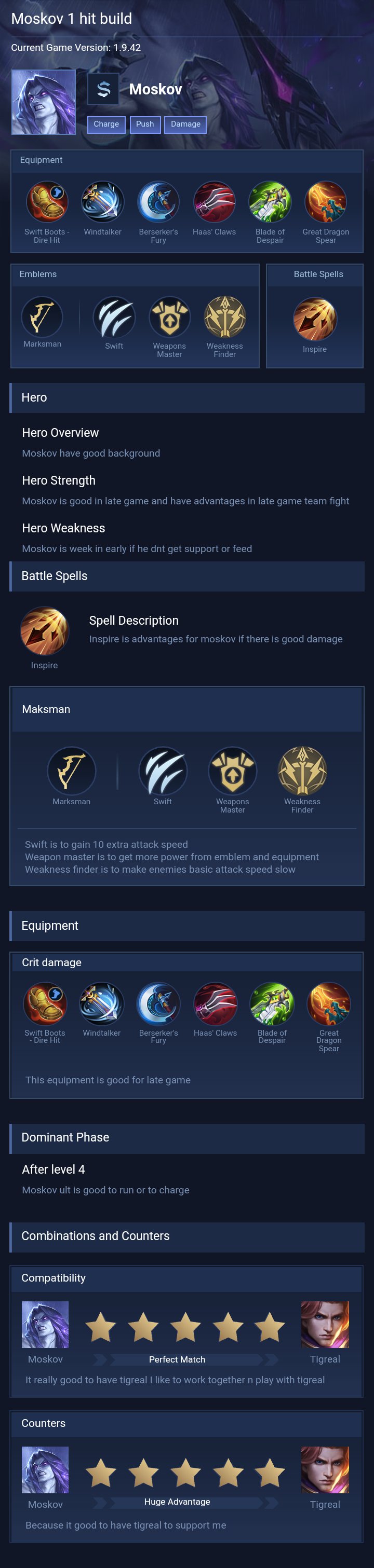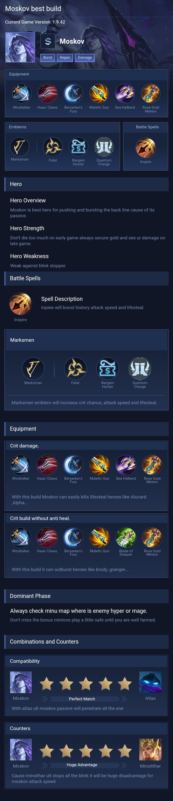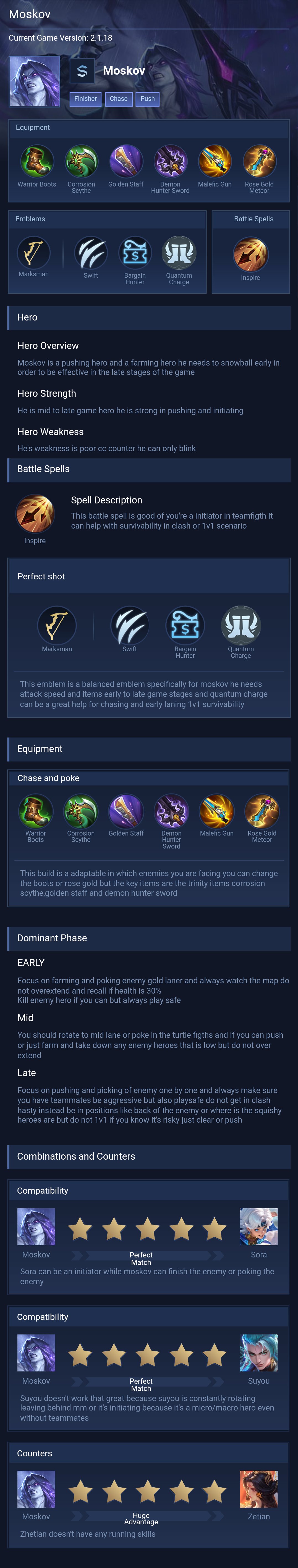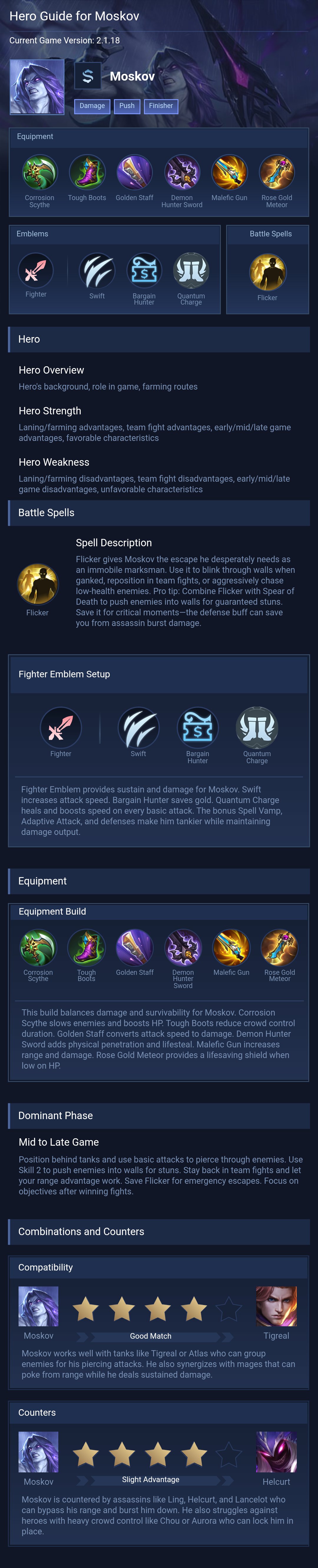 Moskov is a marksman hero with medium difficulty. This is a live guide — win rate, pick rate and counter data refresh every 6 hours from real ranked matches.