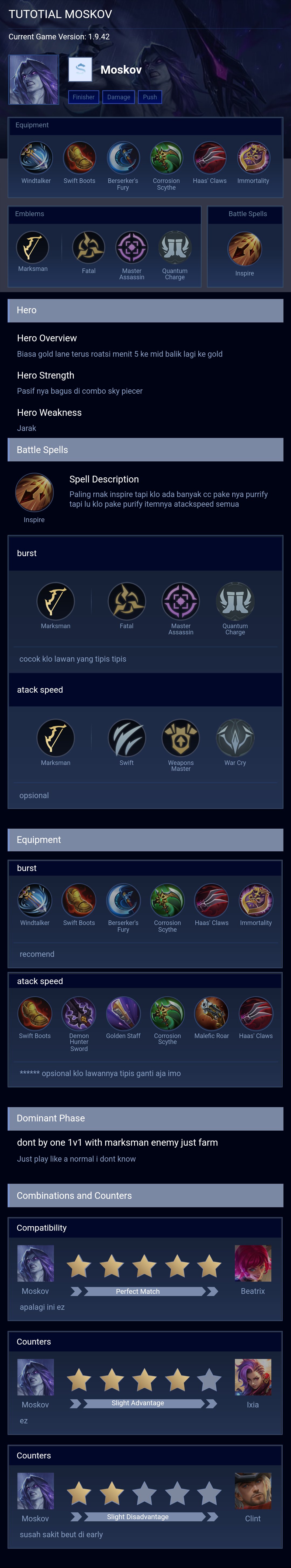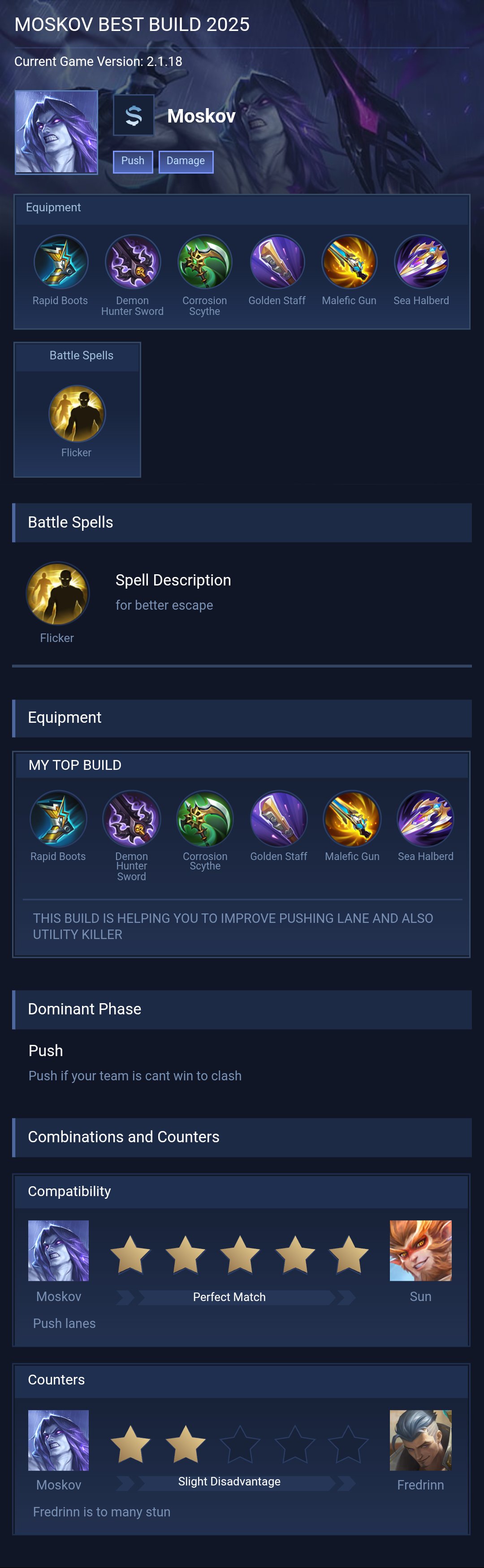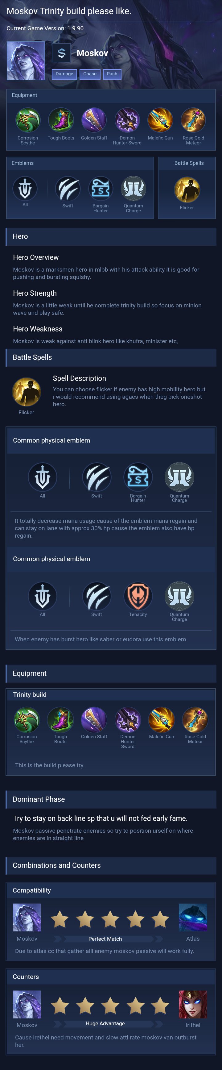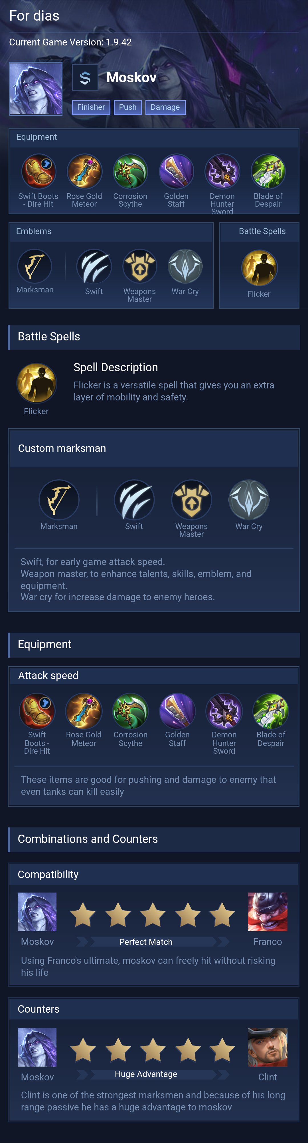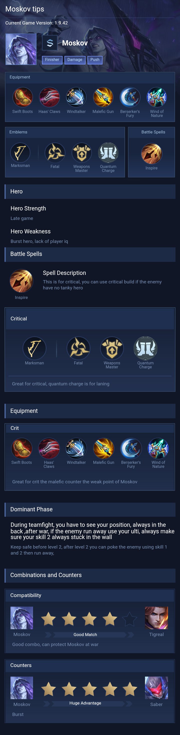 Moskov is a marksman hero with medium difficulty. This is a live guide — win rate, pick rate and counter data refresh every 6 hours from real ranked matches.