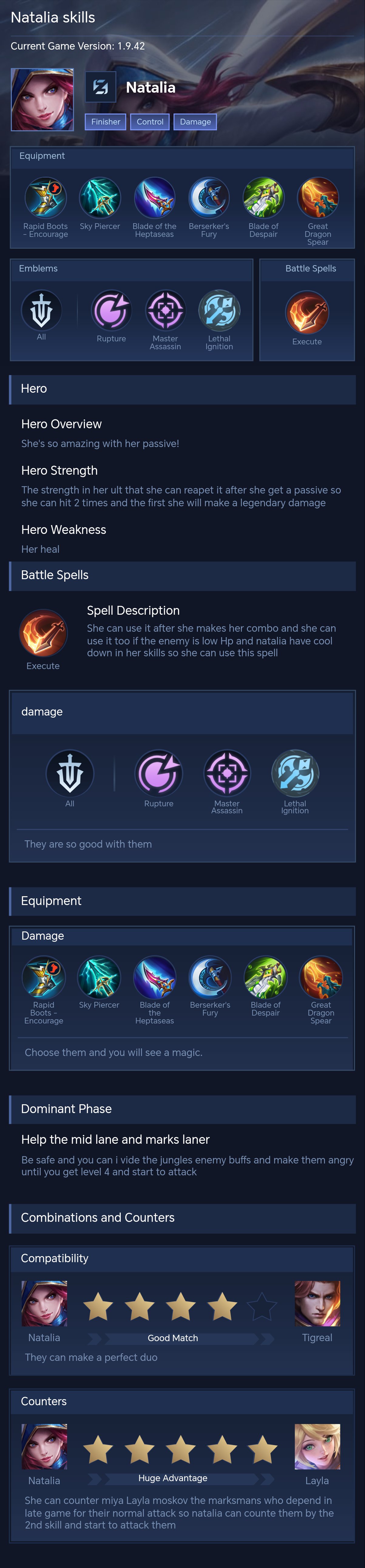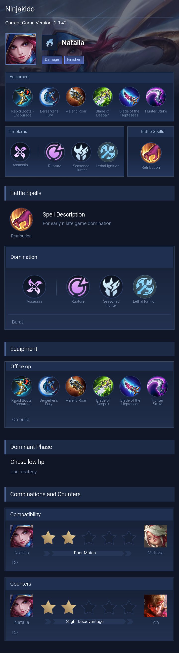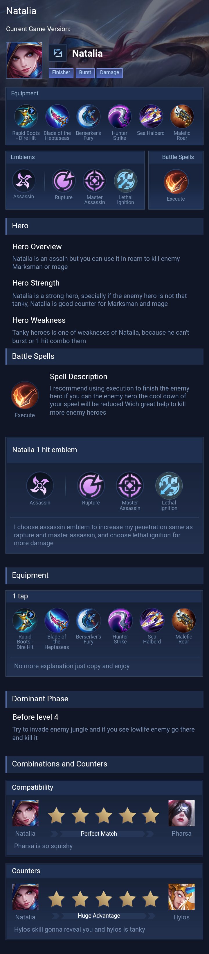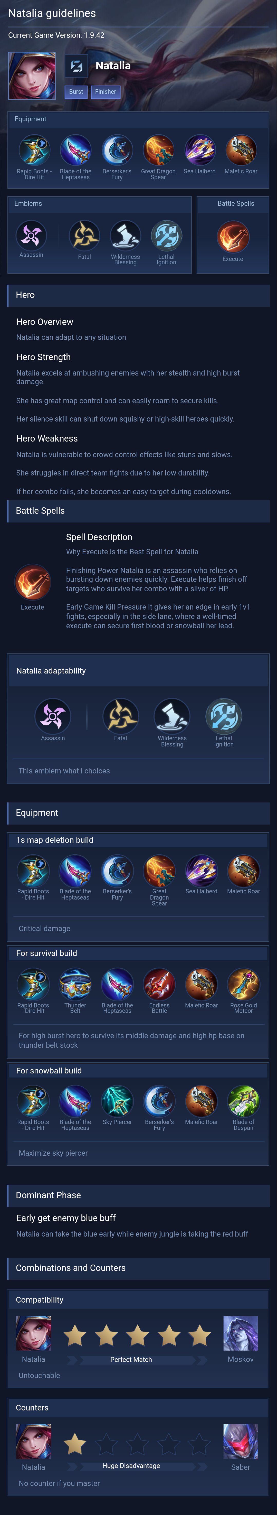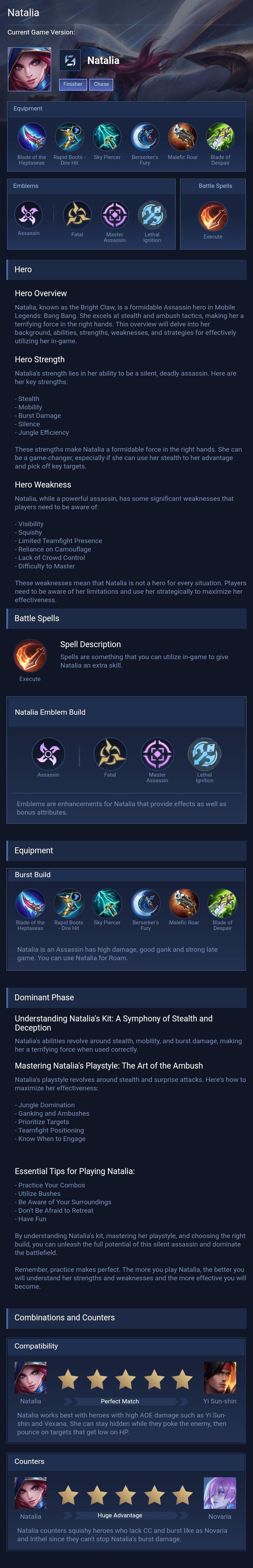 Natalia is a assassin hero with hard difficulty. This is a live guide — win rate, pick rate and counter data refresh every 6 hours from real ranked matches.