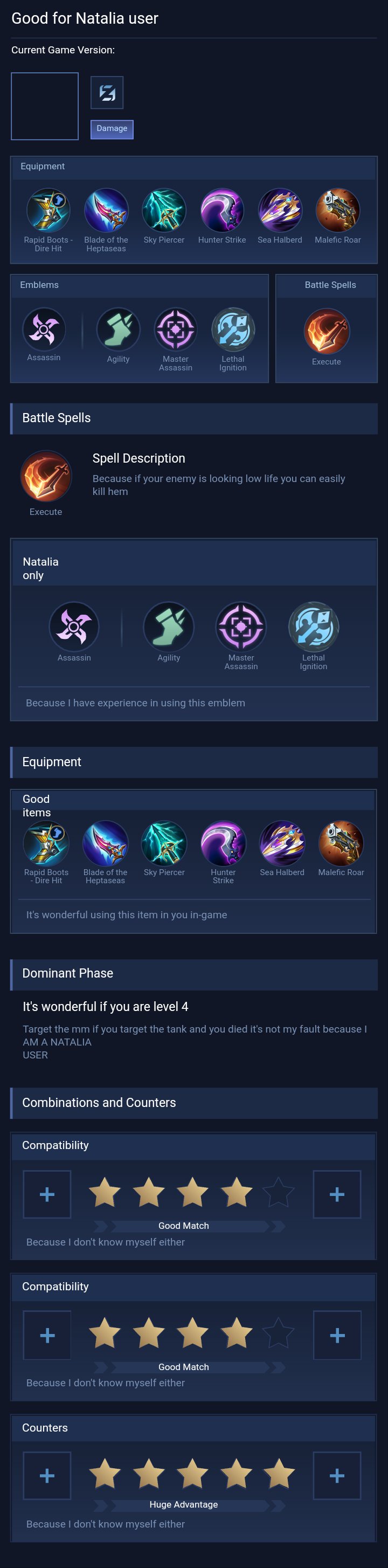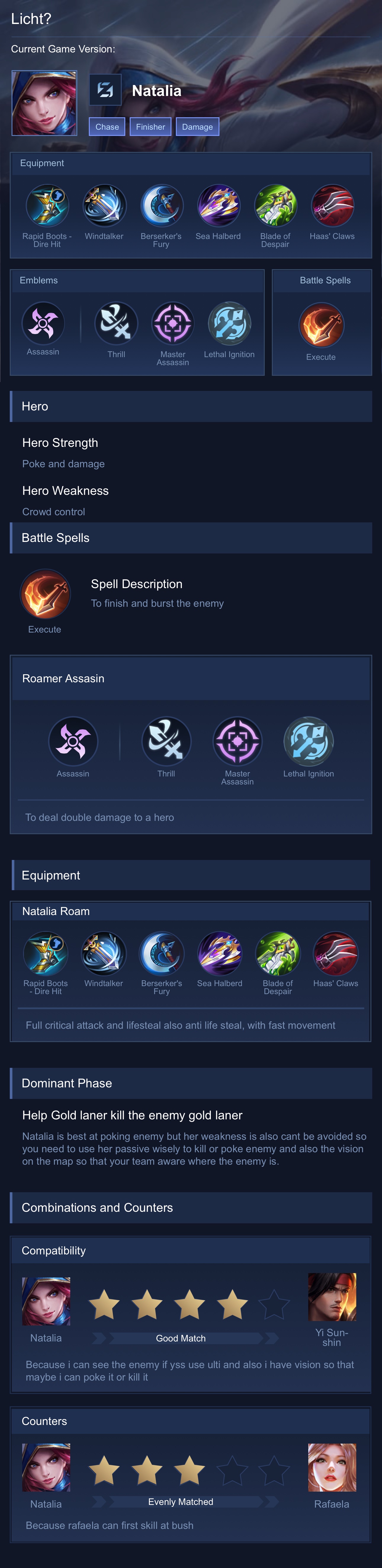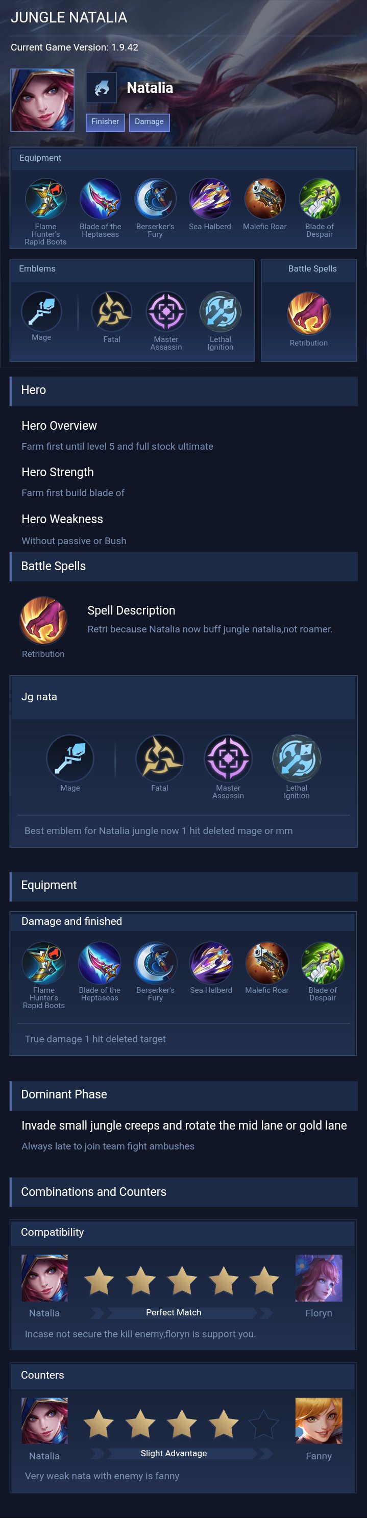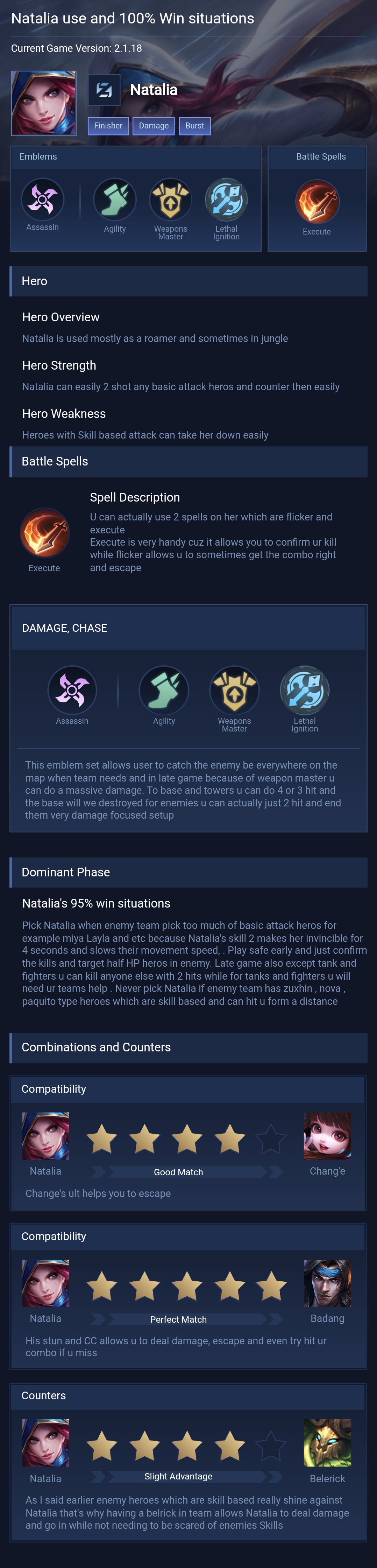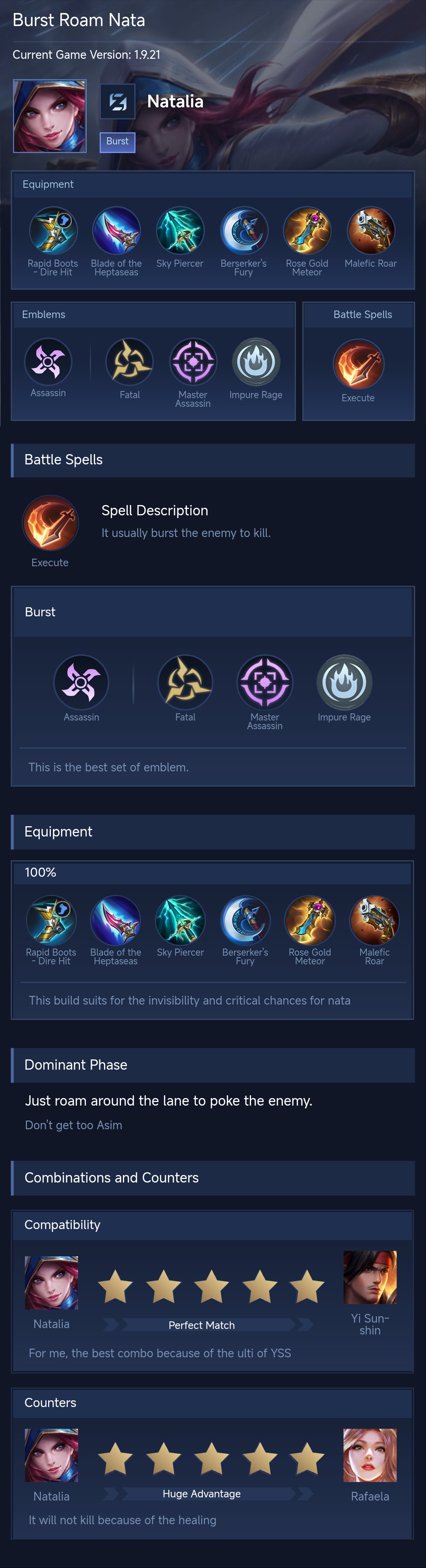 Natalia is a assassin hero with hard difficulty. This is a live guide — win rate, pick rate and counter data refresh every 6 hours from real ranked matches.