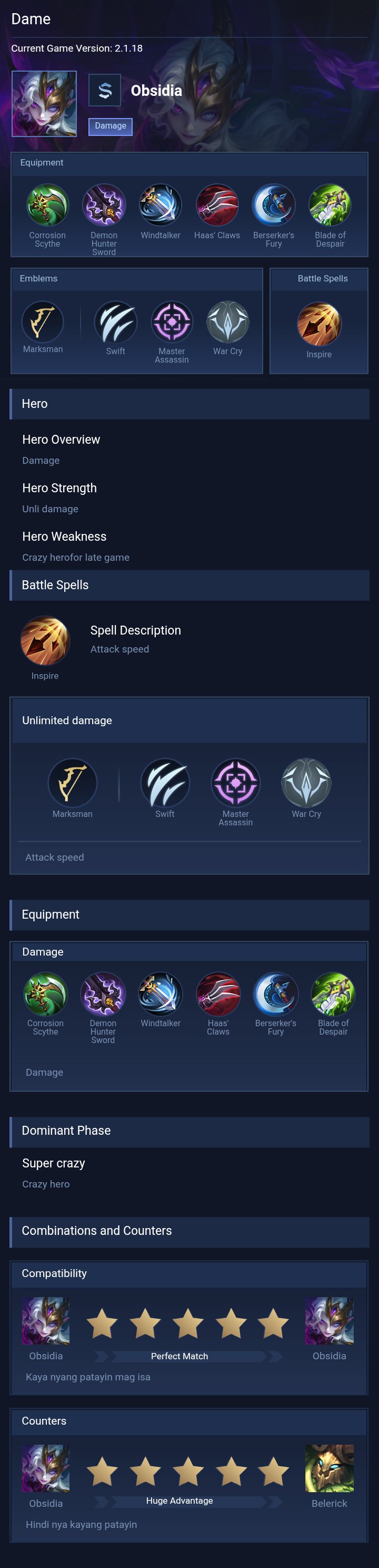 Kelra's setup focuses on solo damage, sustain, and mobility — the perfect blend for a hero who duels and cleans up fights. This setup make Obsidia a self-sufficient carry — deadly in isolated fights, slippery in duels, and able to snowball without relying heavily on teammates.