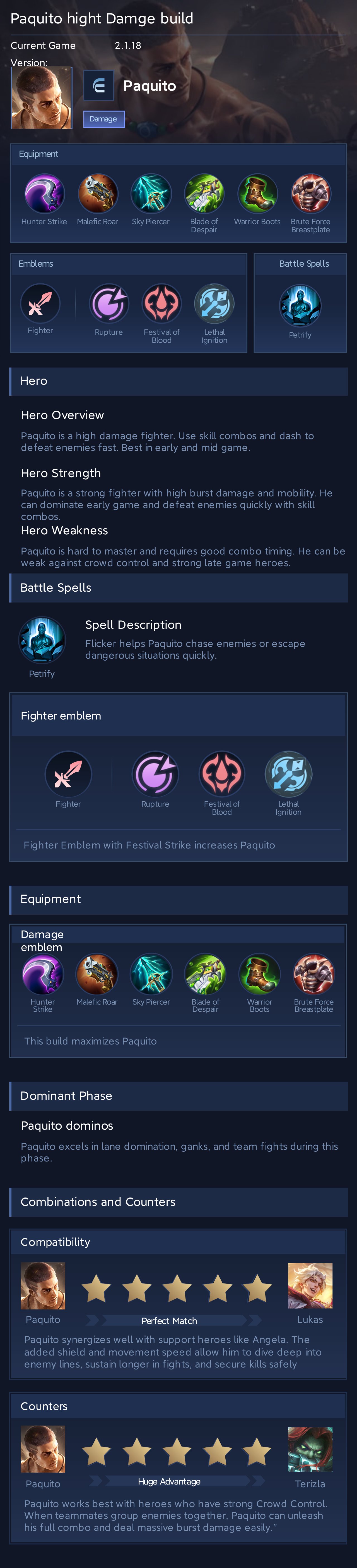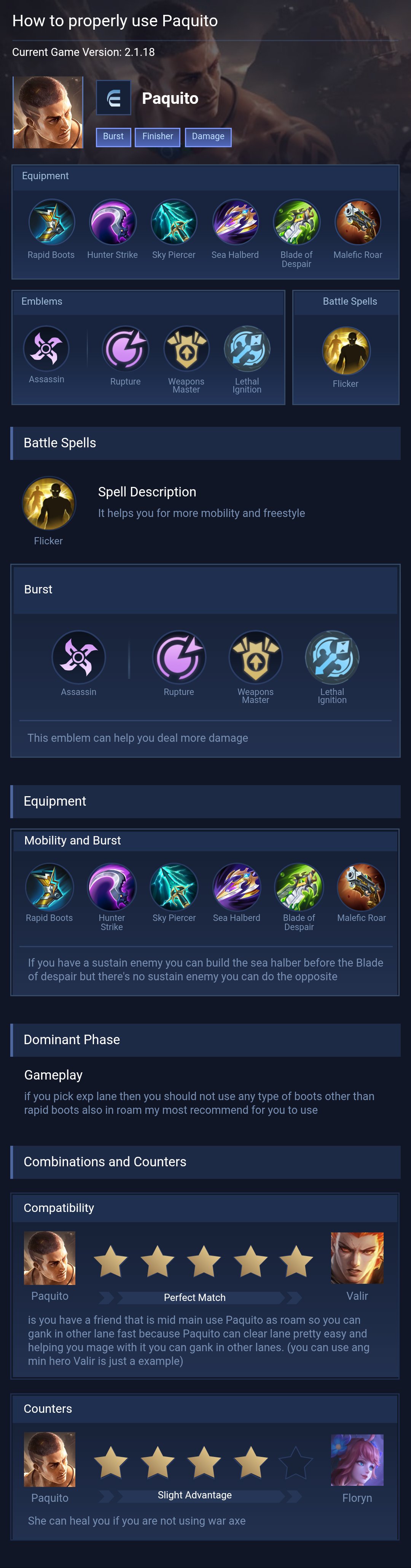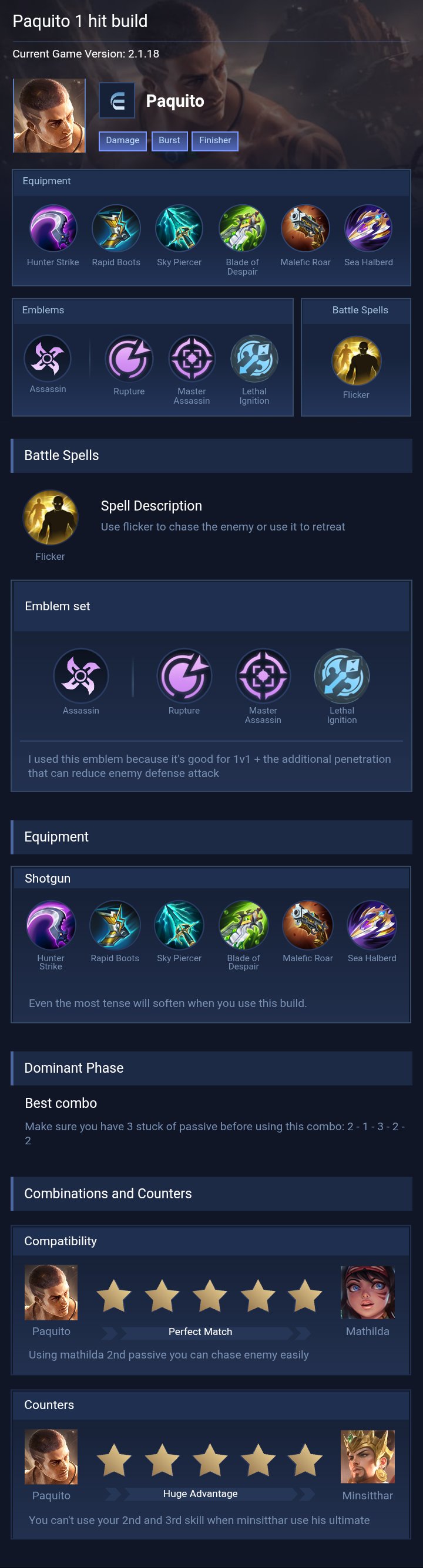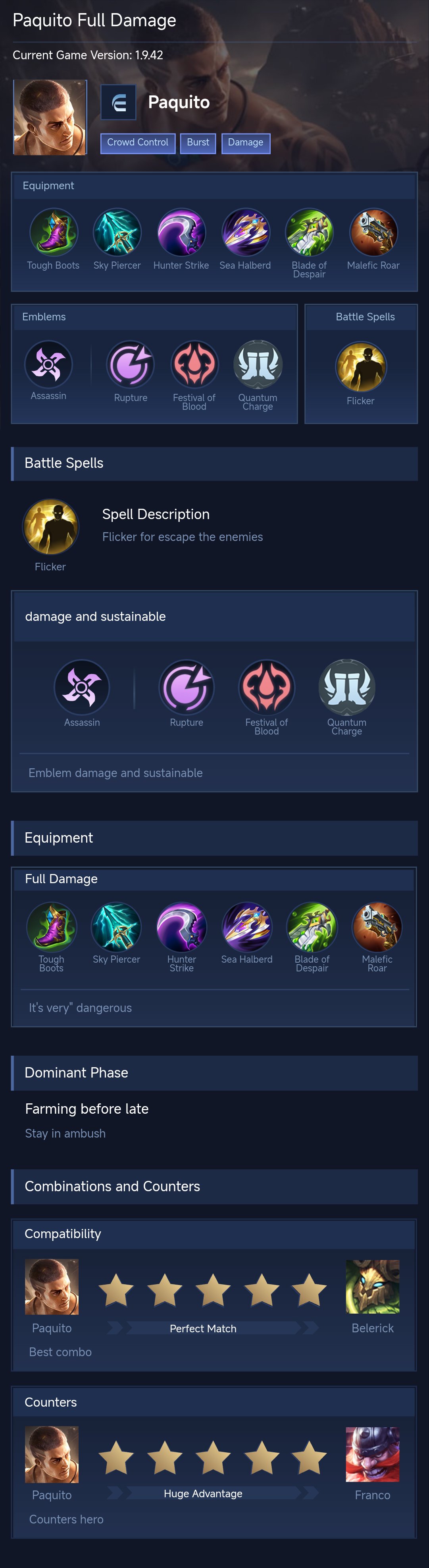 Paquito is a fighter hero with hard difficulty. This is a live guide — win rate, pick rate and counter data refresh every 6 hours from real ranked matches.