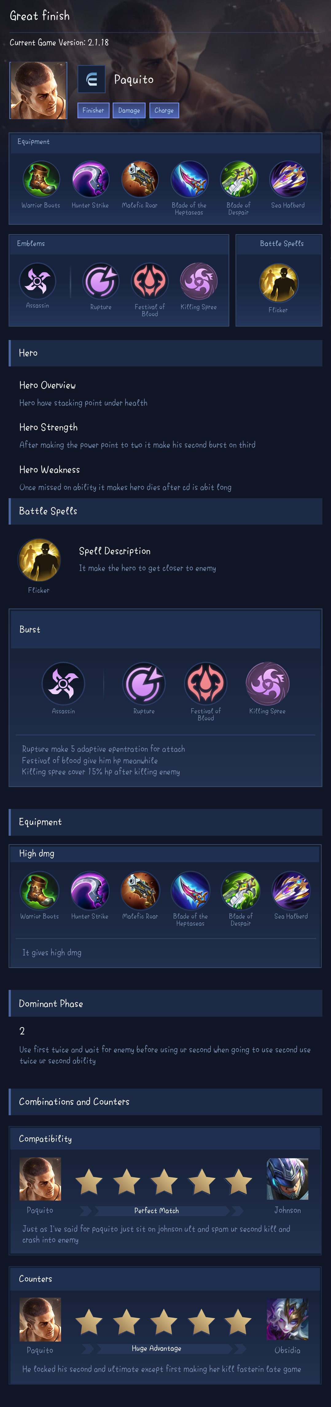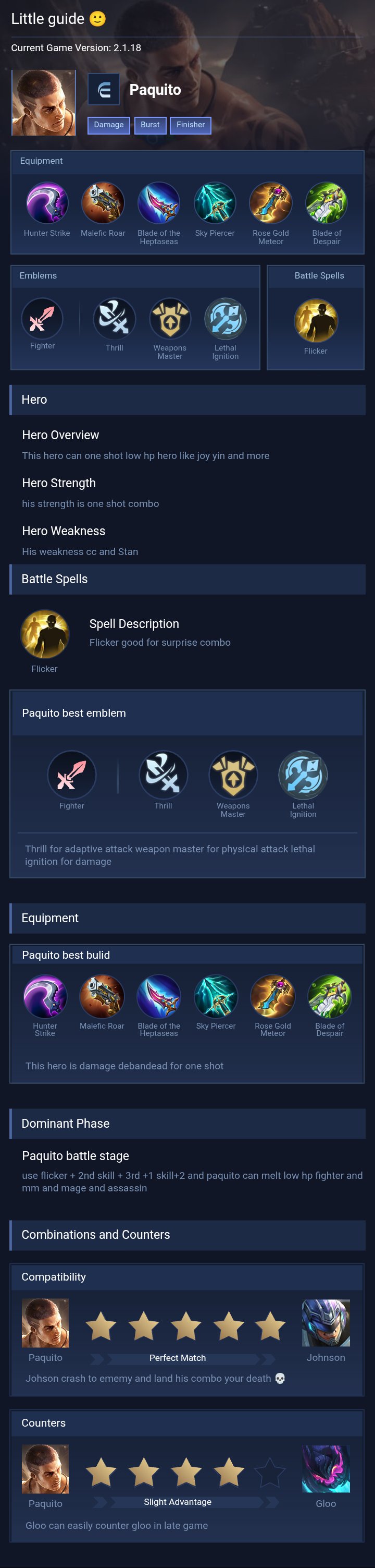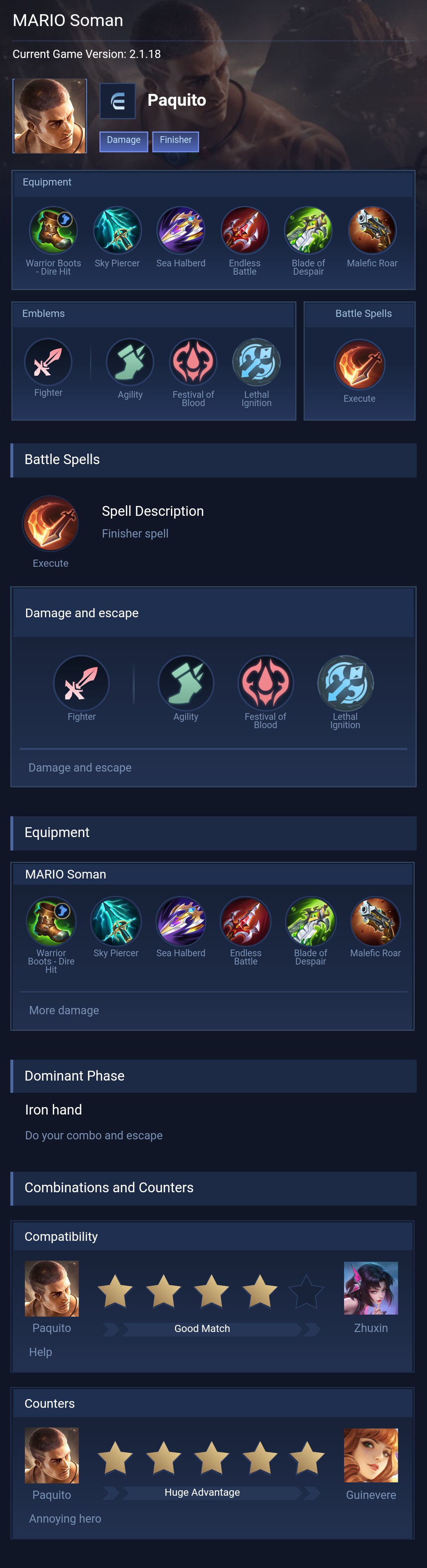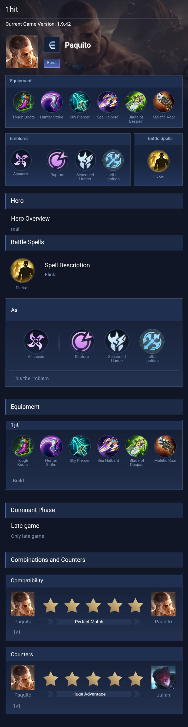 Paquito is a fighter hero with hard difficulty. This is a live guide — win rate, pick rate and counter data refresh every 6 hours from real ranked matches.